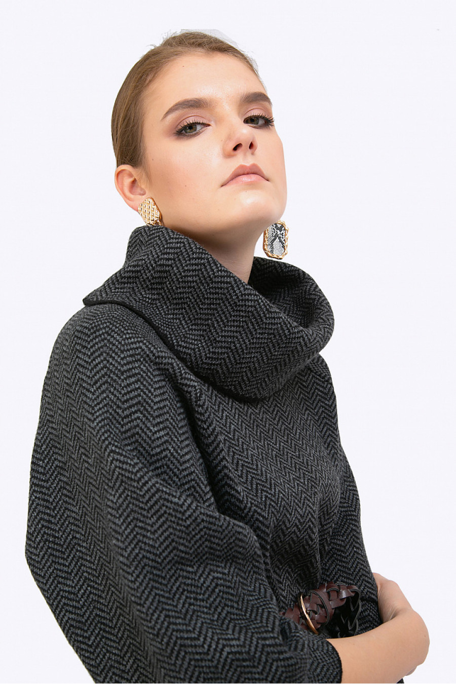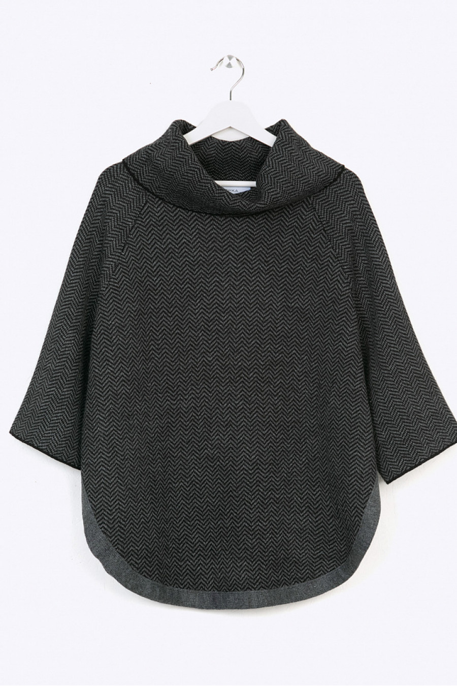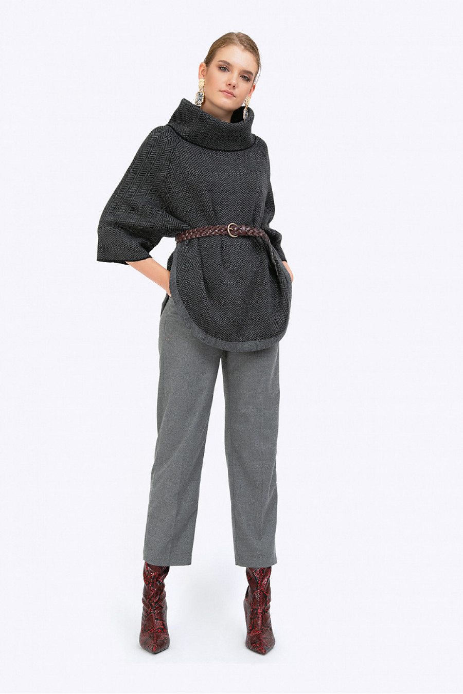 Темно-серая кофта-пончо с плетением «елочка». Модель имеет воротник «хомут», рукав реглан,закругленный подол. Рост фотомодели 177 см.