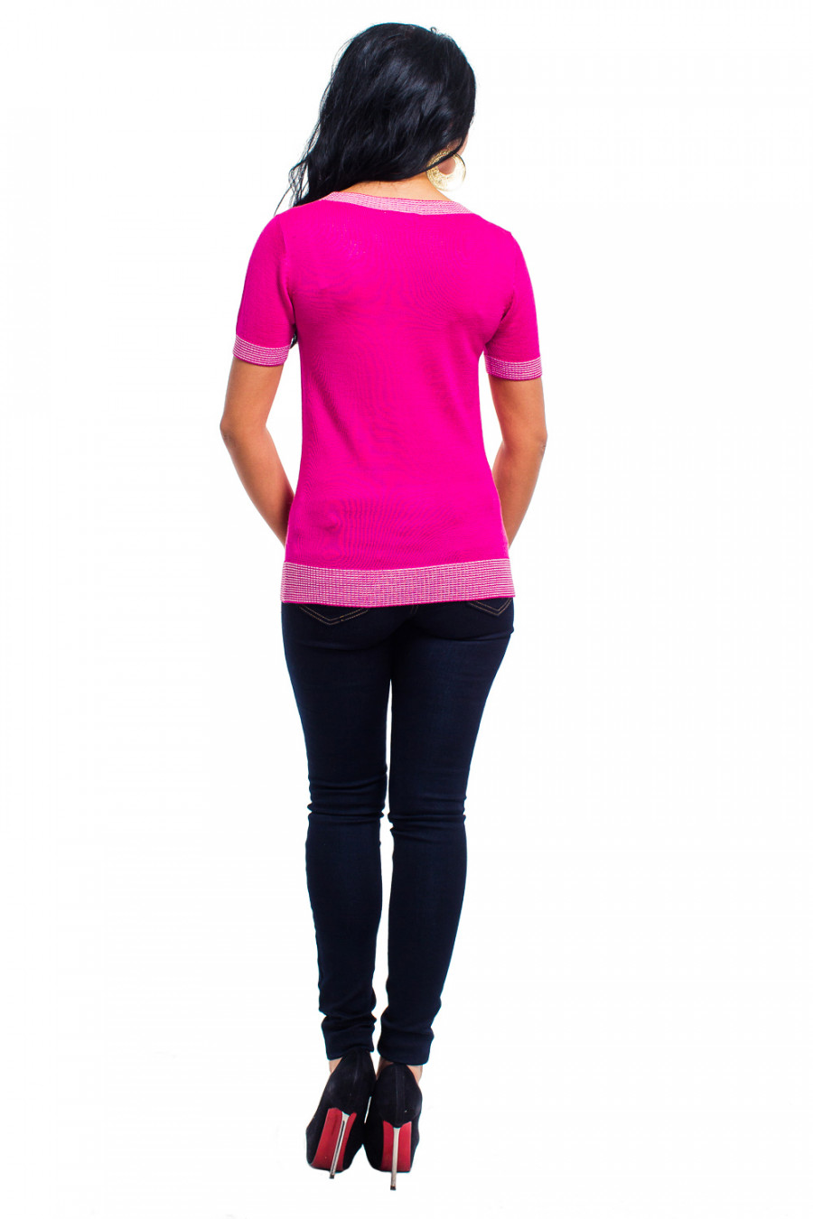Очаровательная кофточка выполнена из тонкого вязаного материала приятной расцветки. Модель с укороченными рукавами и округлым вырезом горловины. Низ изделия и манжеты рукавов окантованы в рубчик и украшены контрастным цветом. На горловине изделие украшено декоративными элементами.