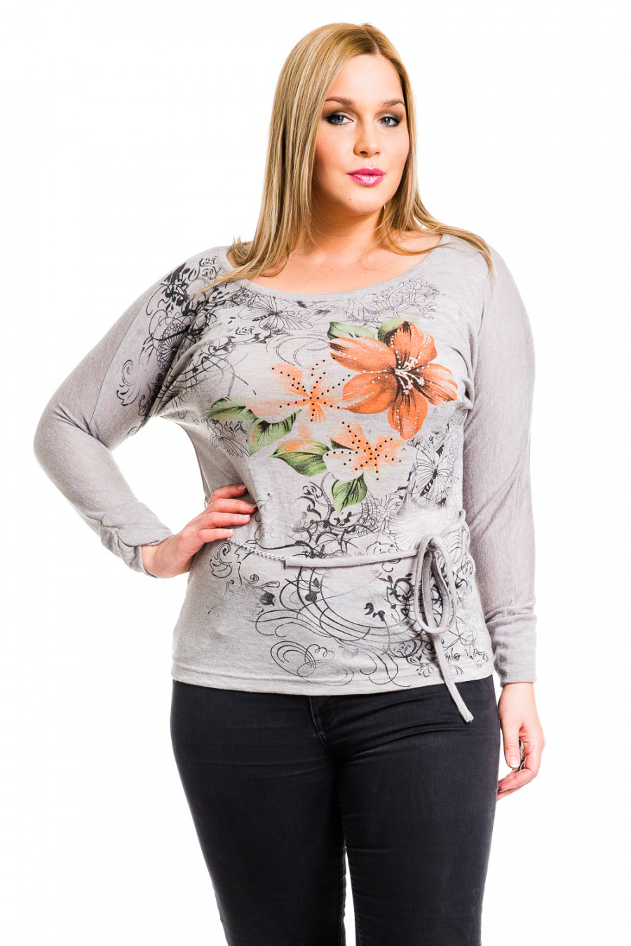 Очаровательная кофточка свободного покроя с длинным рукавом и округлым вырезом горловины. Модель декорирована изящным принтом.