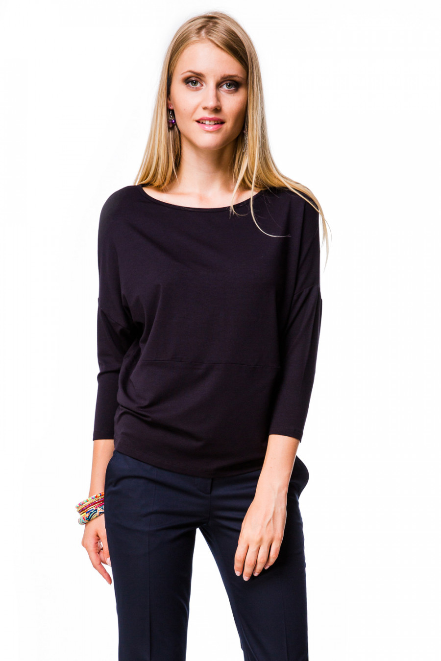Восхитительная кофточка стиля Casual. Изделие свободного прямого кроя с округлым вырезом горловины и рукавами 3/4. Модель выполнена из высококачественной вискозы. Изделие декорировано металлическим логотипом фирмы MONDIGO. Такая модель будет прекрасно сочетаться со многими вещами любого гардероба.
