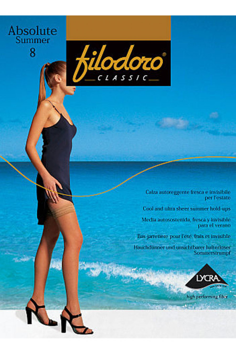 Тончайшие чулки Filodoro Classic Absolute Summer Autoreggente (Nero) с оригинальной каймой, оформленной геометрическим узором, и невидимым мыском. Резинка - на силиконовой основе. Плотность: 8 den.