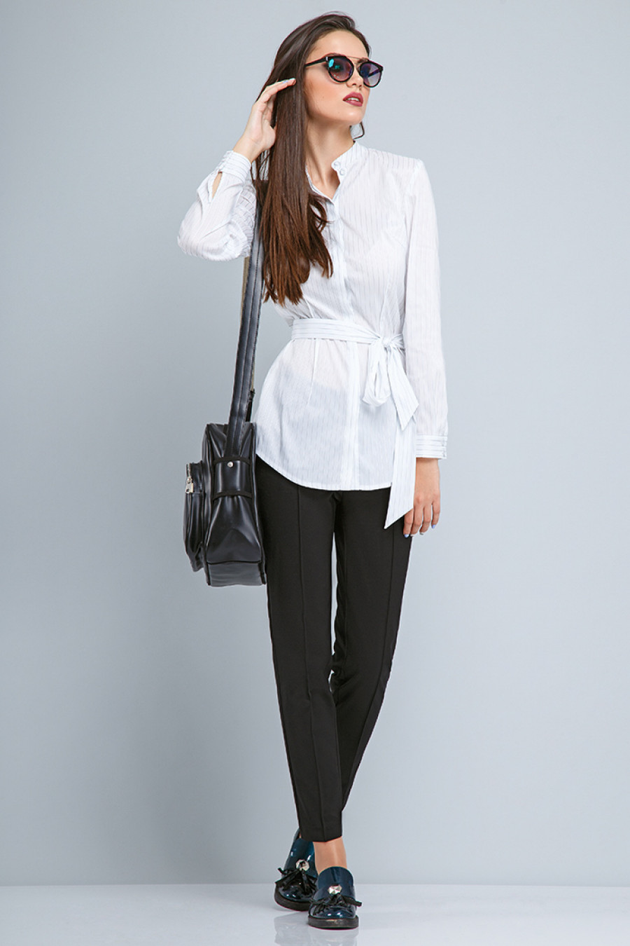 Состав: блуза (вискоза 72%, ПА 28%), брюки (хлопок 57%, нейлон 39%, спандекс 4%)