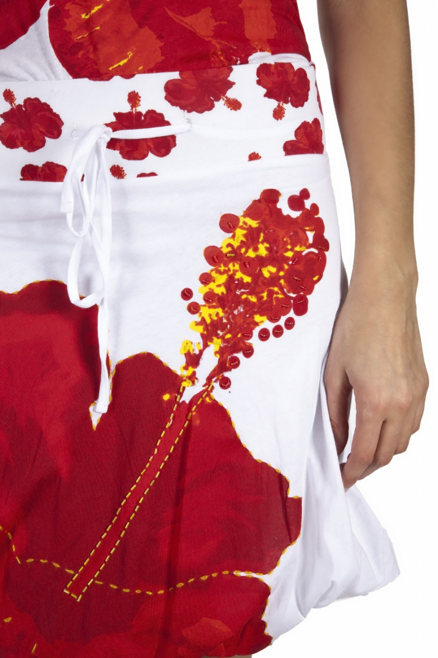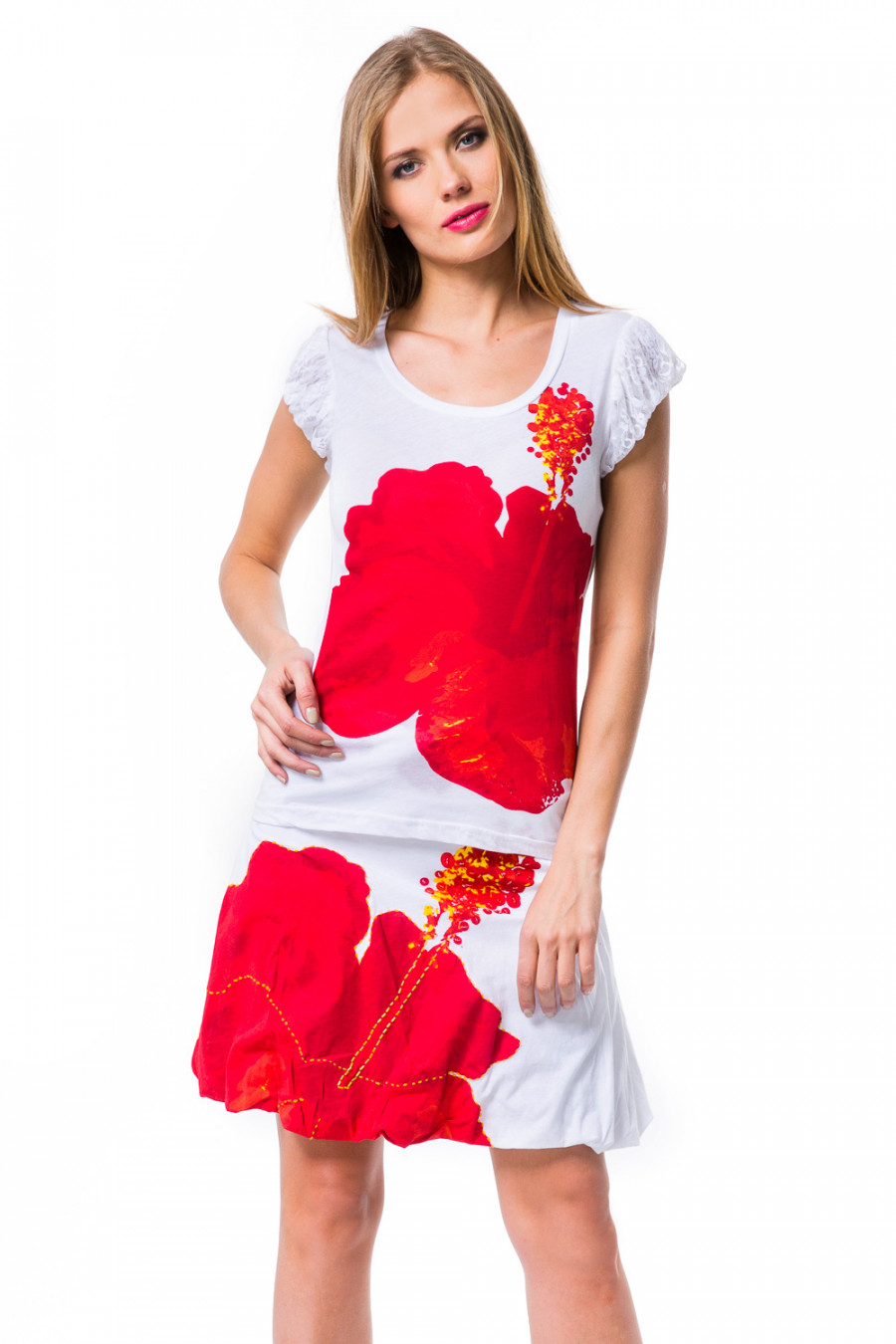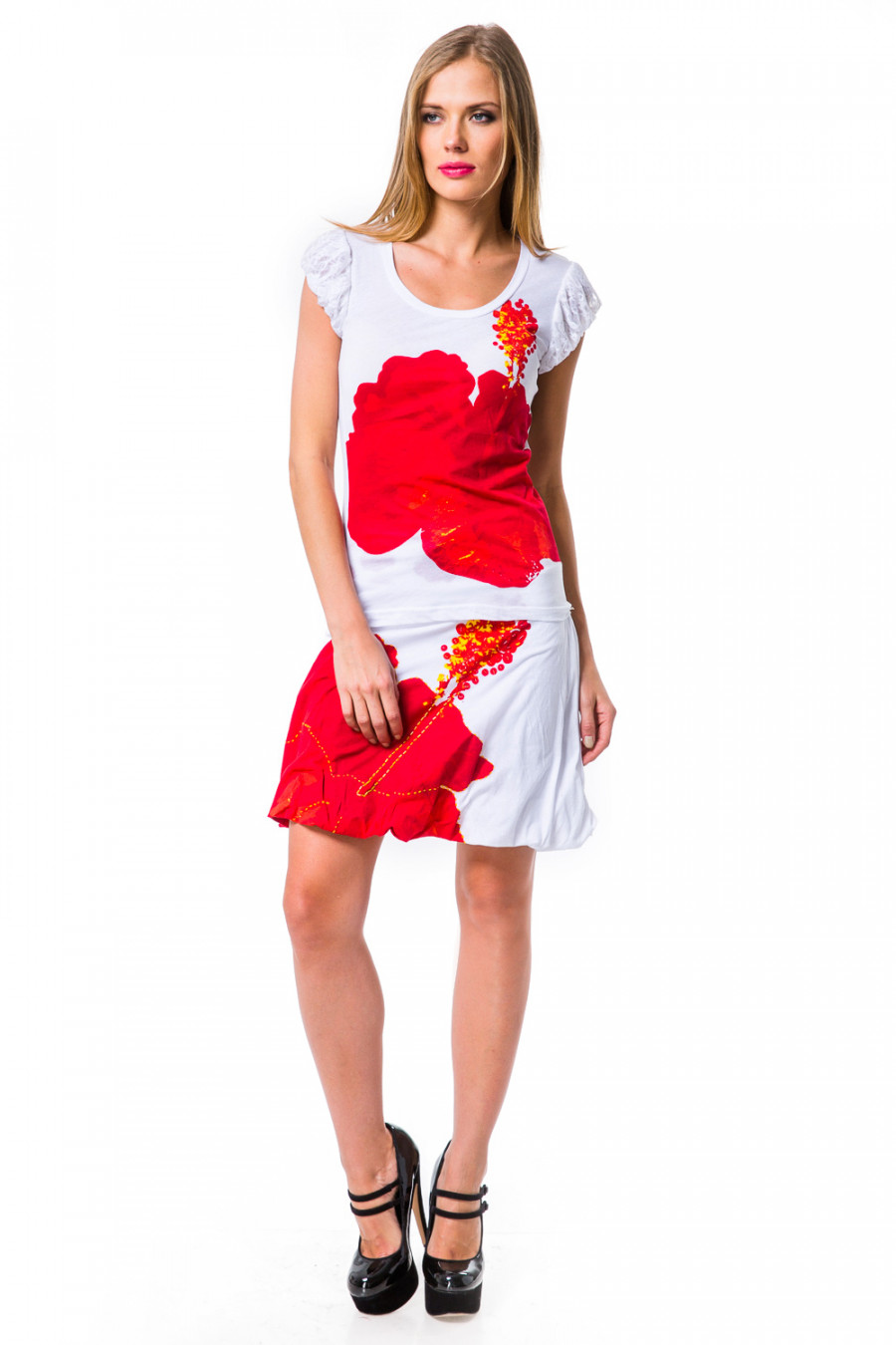 Яркий и стильный комплект из юбки и футболки. Оригинальное сочетание цветов и текстуры ткани делают модель практичной и нарядной. Юбка стильного фасона на широком поясе с завязками. Футболка с коротким рукавом и округлым вырезом горловины. Комплект украшен стразами.