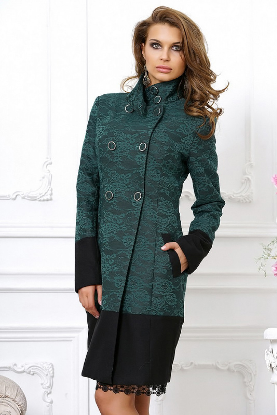 Стильное женское пальто, длиной выше колена. Воротник изделия отложной, с заостренными углами, можно застегнуть на пуговицы. Рукав полной длины. Пальто двубортное, пуговицы - в цвет изделия. По бокам изделия - два прорезных кармана. Пальто темно-зеленого цвета с узорами. Широкий подол, манжеты и карманы - однотонные, черного цвета. Материал изготовления - качественное, мягкое полотно, приятное на ощупь. Рекомендуется машинная стирка в бережном режиме при 30-40 градусах.