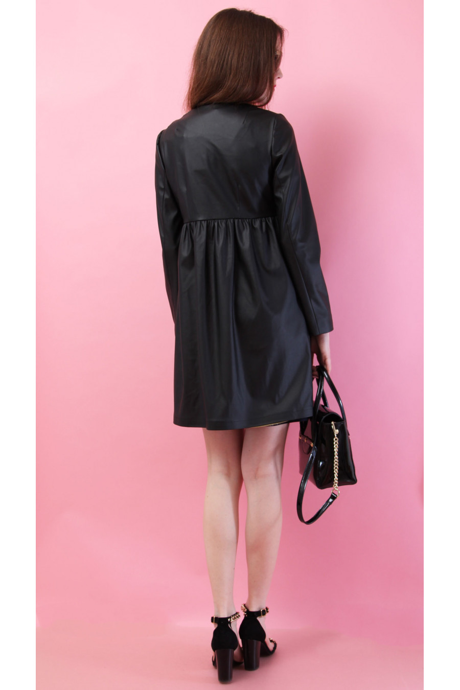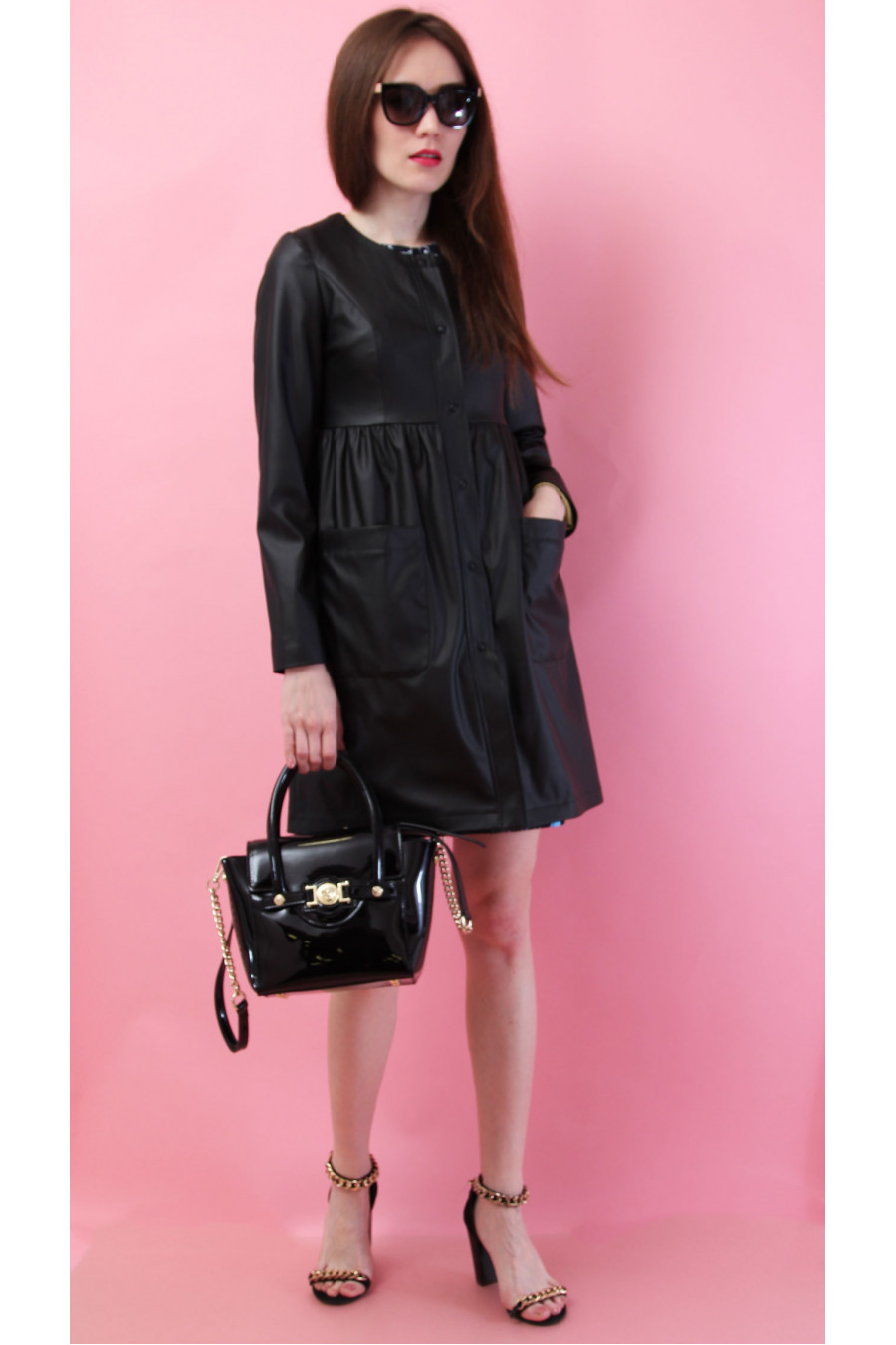 Ультрамодный плащ с длинным рукавом, застежка на пуговицы, завышенная талия. Юбка плаща в мелкую сборку, накладные карманы.