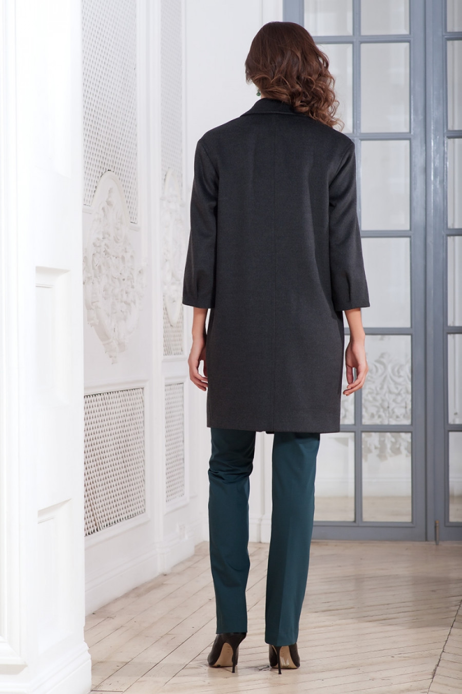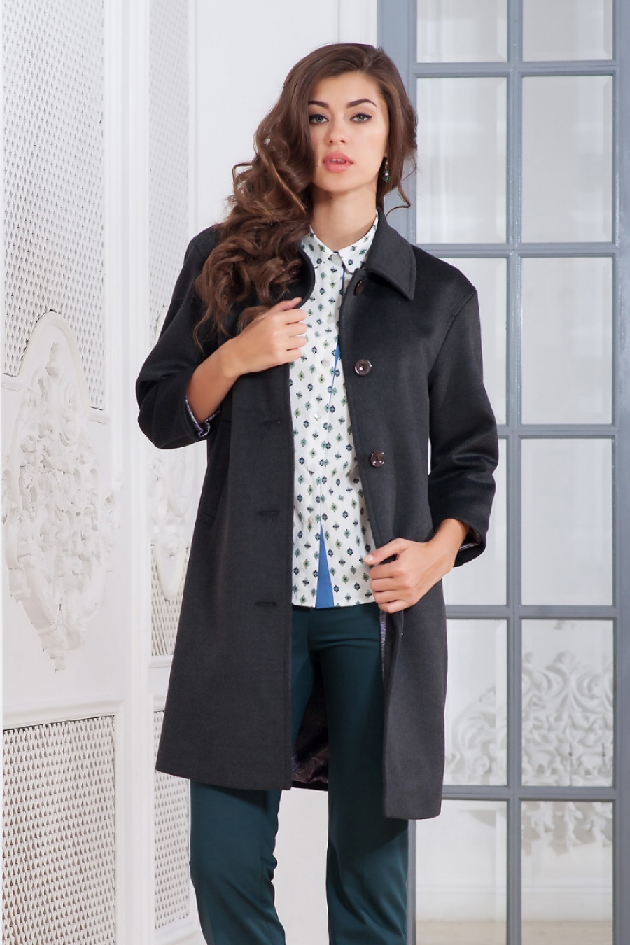 Демисезонное пальто на подкладке с застежкой доверху, отложным воротником и рукавами 3/4. Впереди прорезные карманы с листочкой. На рукаве сзади складка по низу. По краю борта, воротника, по концам листочки проложены отделочные строчки. Застежка на пуговицы.
