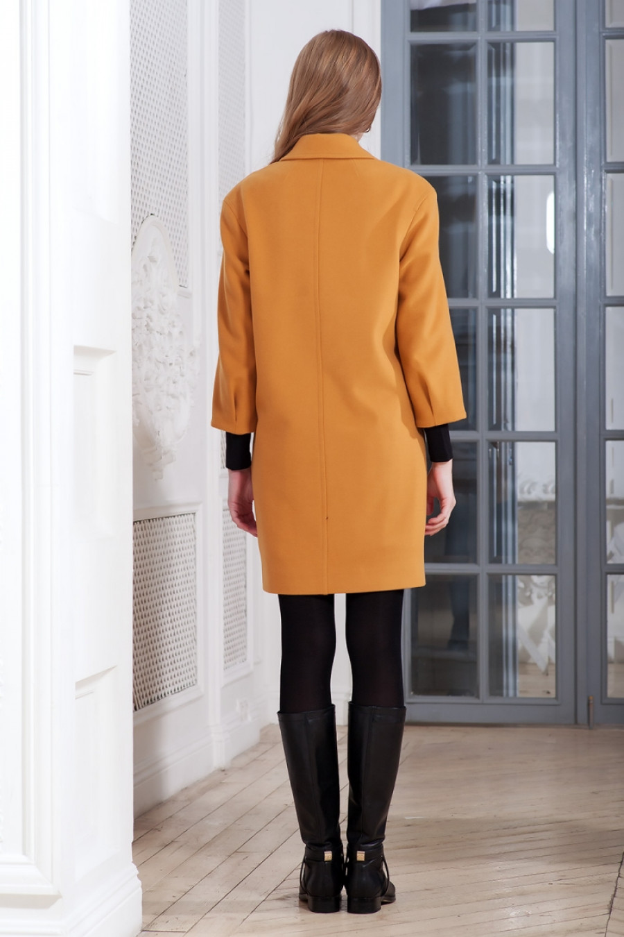 Демисезонное пальто на подкладке с застежкой доверху, отложным воротником и рукавами 3/4. Впереди прорезные карманы с листочкой. На рукаве сзади складка по низу. По краю борта, воротника, по концам листочки проложены отделочные строчки. Застежка на пуговицы.