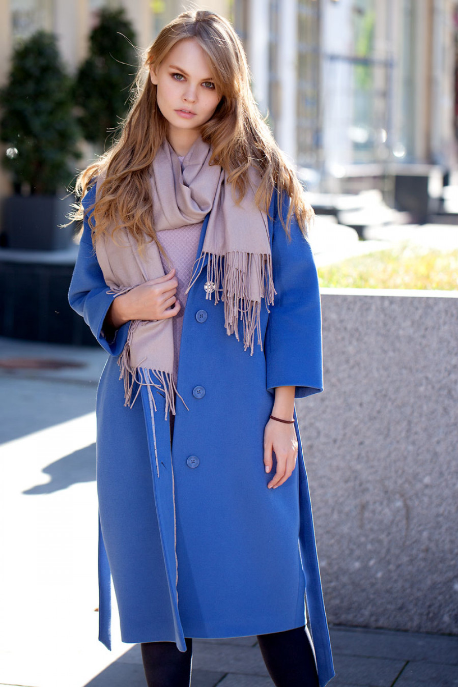 Демисезонное пальто на подкладке прямое длиной ниже колена с рукавом "летучая мышь" 3/4. В боковых швах карманы. Впереди потайная застежка на пуговицы и кнопку. На талии завязывается пояс.