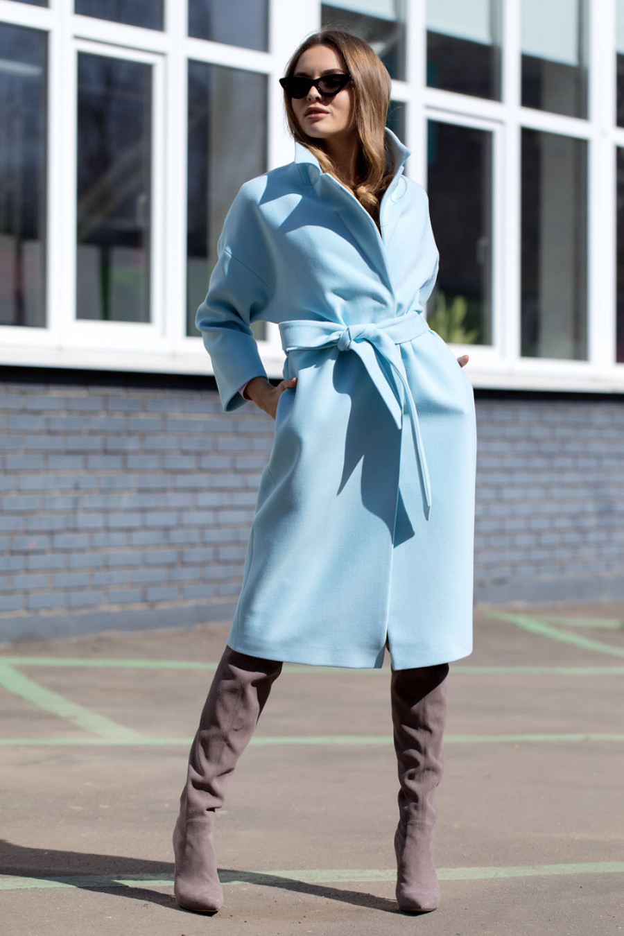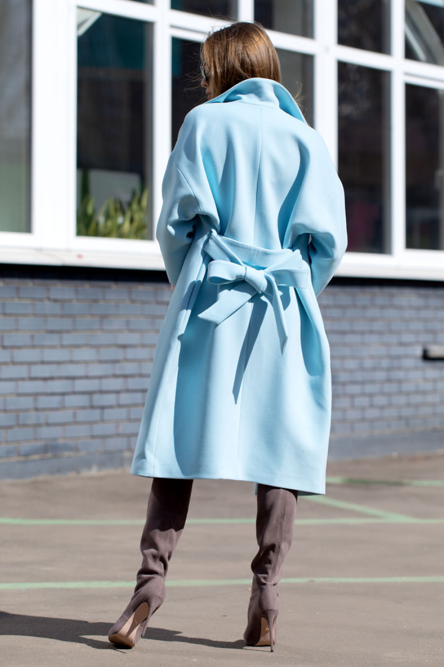 Демисезонное пальто на подкладке прямое длиной ниже колена с рукавом "летучая мышь" 3/4. В боковых швах карманы. Впереди потайная застежка на пуговицы и кнопку. На талии завязывается пояс.