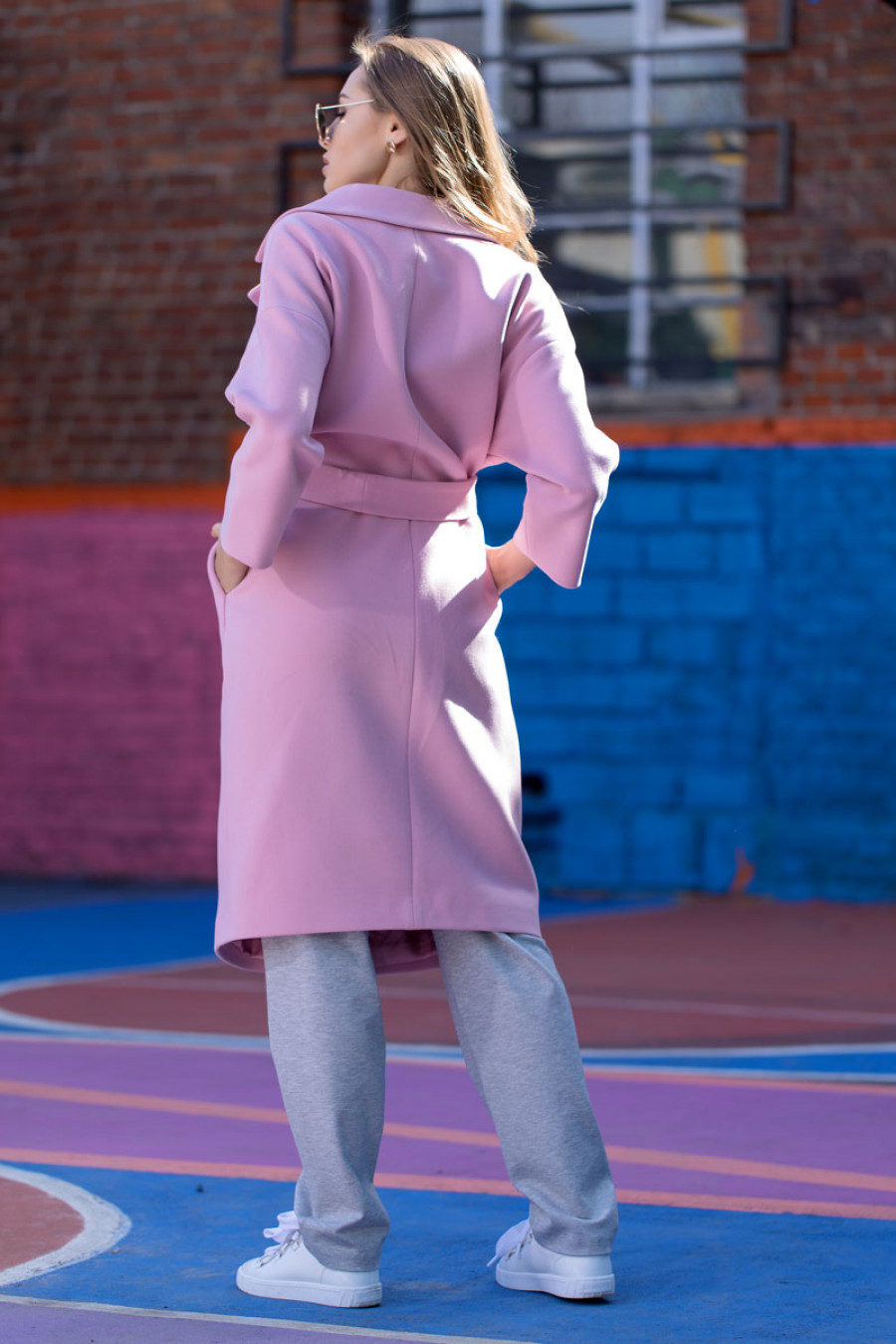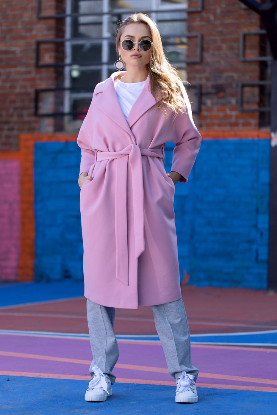 Демисезонное пальто на подкладке прямое длиной ниже колена с рукавом "летучая мышь" 3/4. В боковых швах карманы. Впереди потайная застежка на пуговицы и кнопку. На талии завязывается пояс.