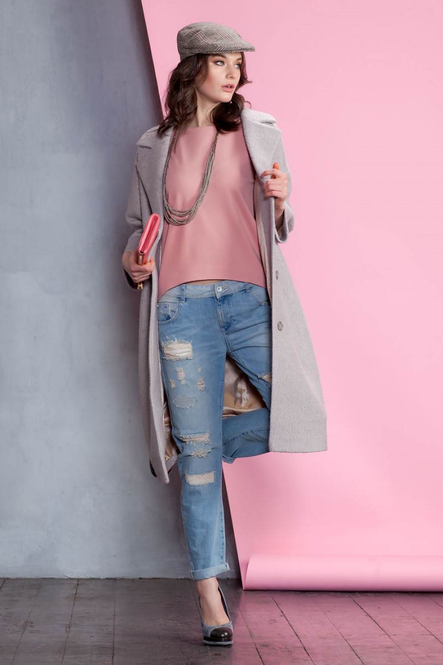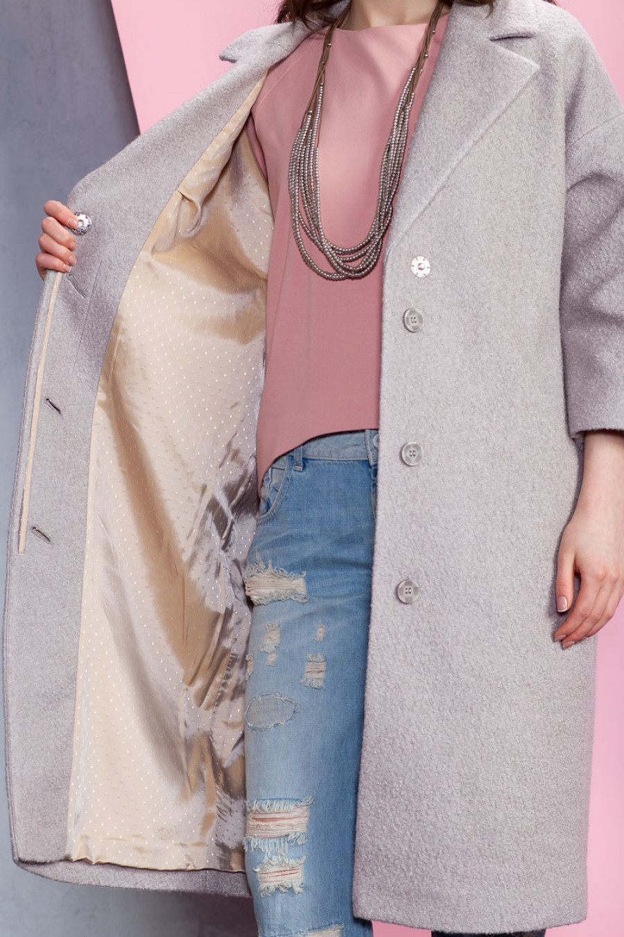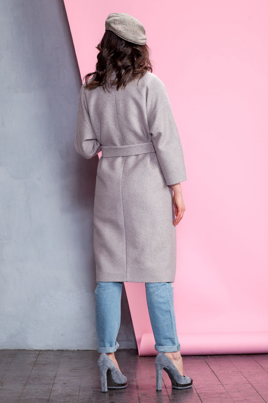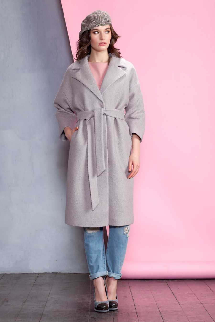 Демисезонное пальто на подкладке прямое длиной ниже колена с рукавом "летучая мышь" 3/4. В боковых швах карманы. Впереди потайная застежка на кнопку. На талии завязывается пояс.