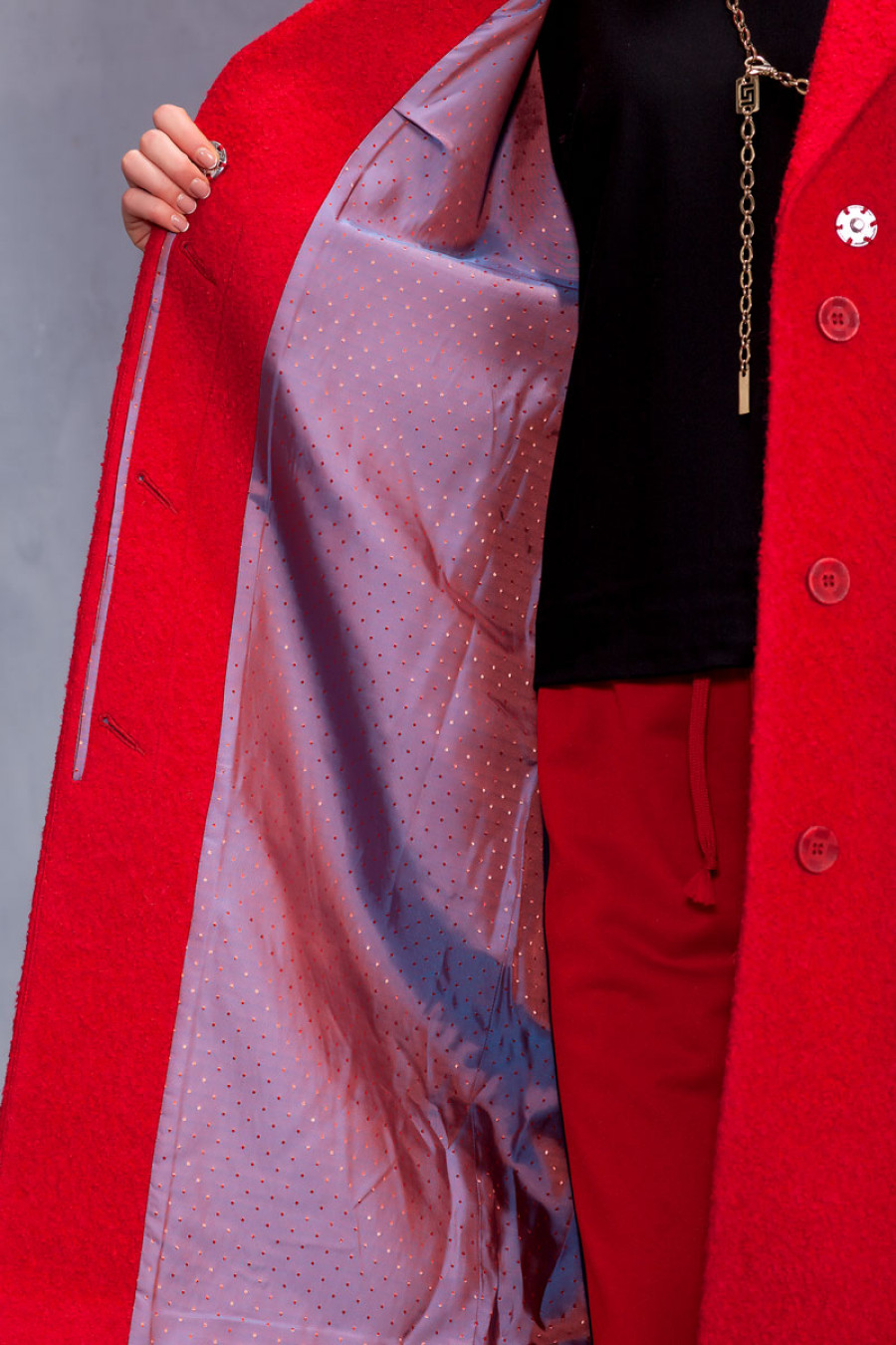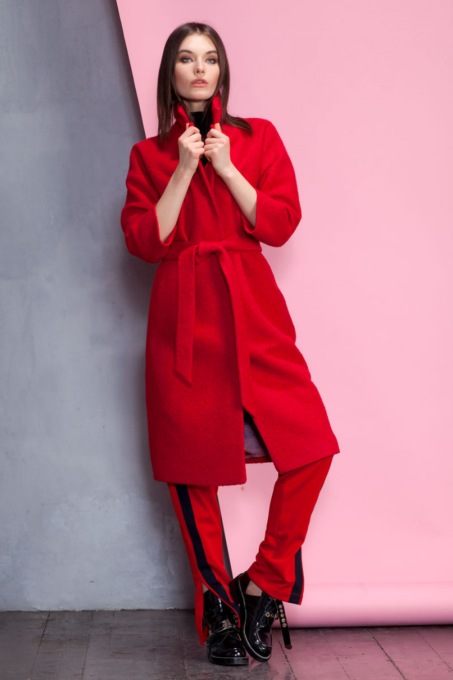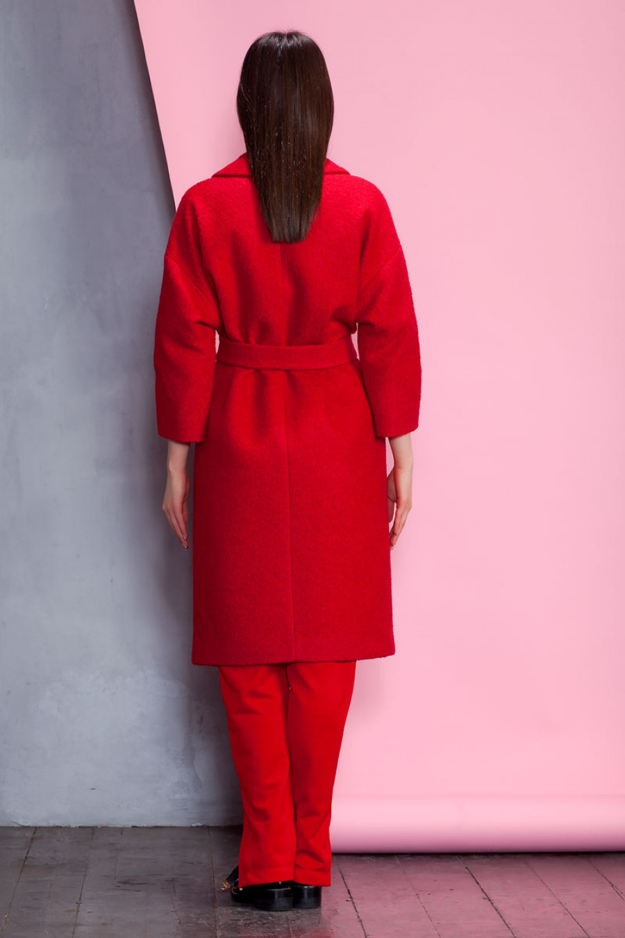Демисезонное пальто на подкладке прямое длиной ниже колена с рукавом "летучая мышь" 3/4. В боковых швах карманы. Впереди потайная застежка на кнопку. На талии завязывается пояс.