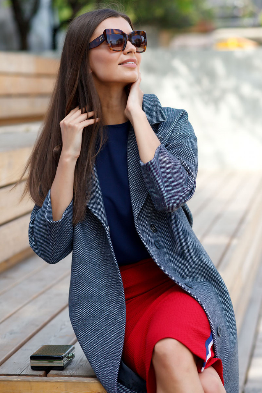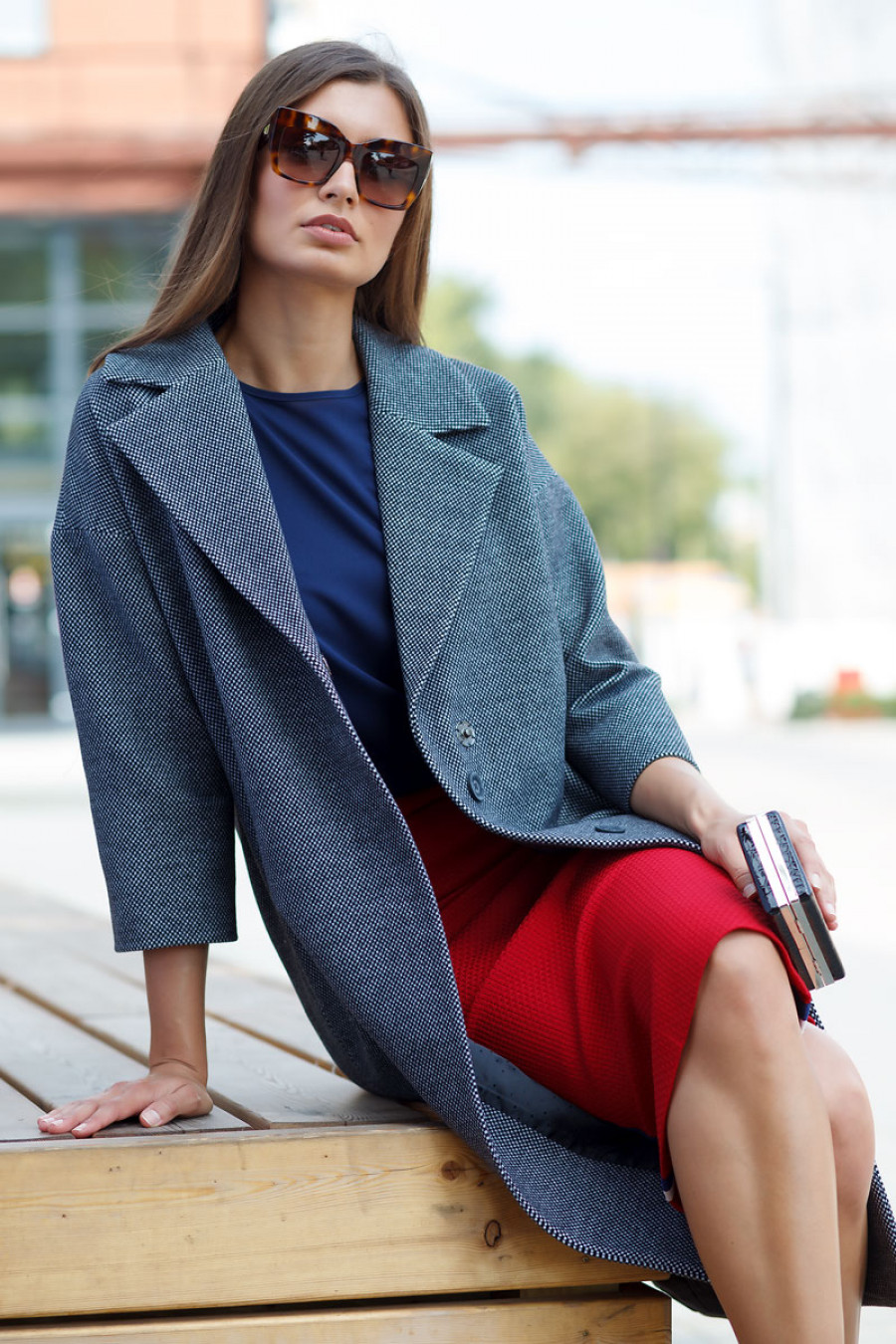 Демисезонное пальто на подкладке прямое длиной ниже колена с рукавом "летучая мышь" 3/4. В боковых швах карманы. Впереди потайная застежка на кнопку. На талии завязывается пояс.