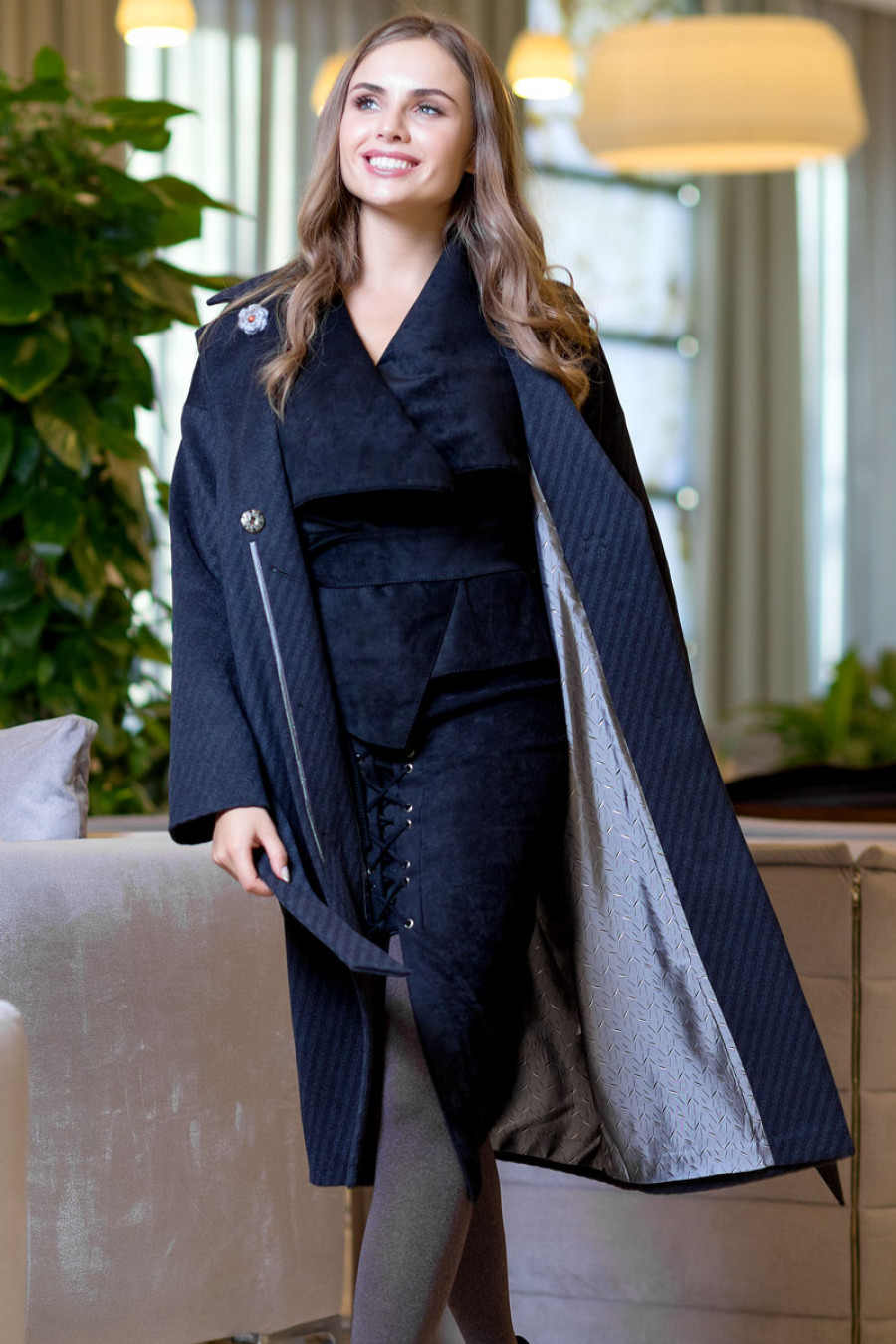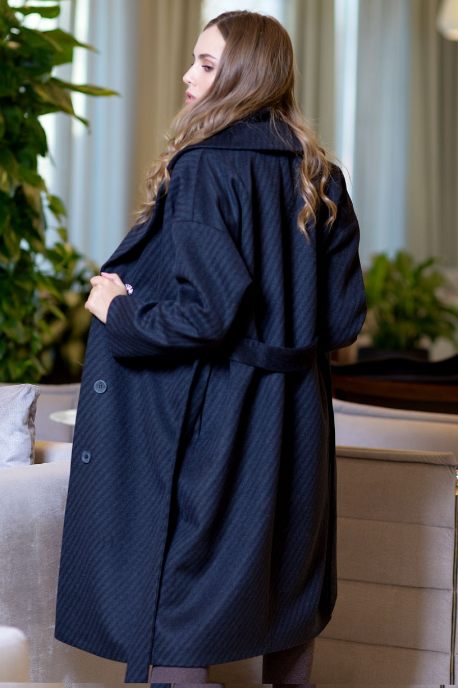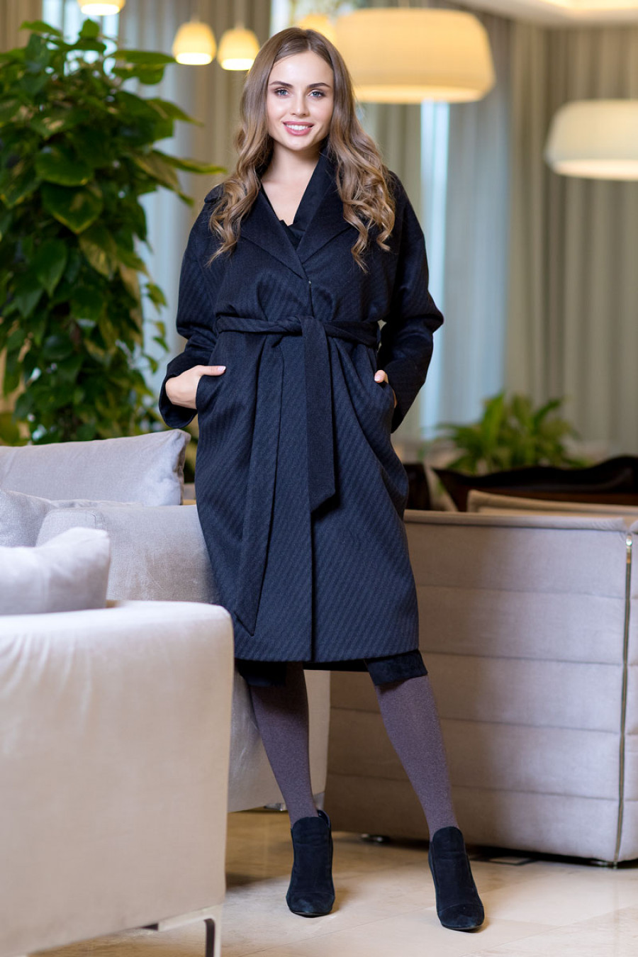 Облегченное демисезонное пальто на подкладке прямое длиной ниже колена с длинным рукавом "летучая мышь". В боковых швах выполнены карманы. Впереди потайная застежка на пуговицы и кнопку. На талии завязывается пояс.