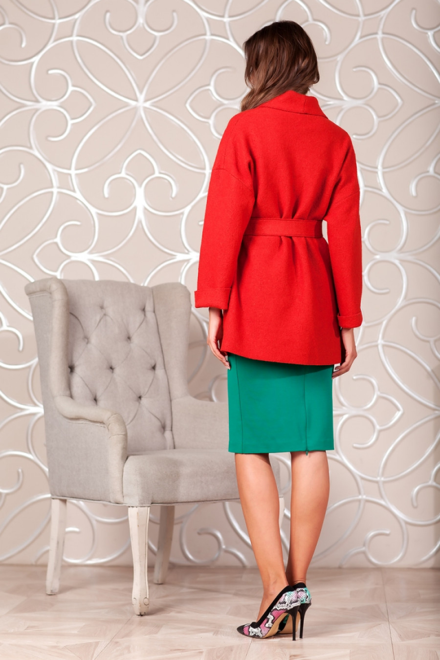 Оригинальное пальто без подкладки из вязаного полотна букле. Модель прямого силуэта с длинным пукавом. Изделие без застежки. фиксируется поясом по талии. Впереди прорезные карманы с листочками. Модель выполнена по технологии с необработанными краями.
