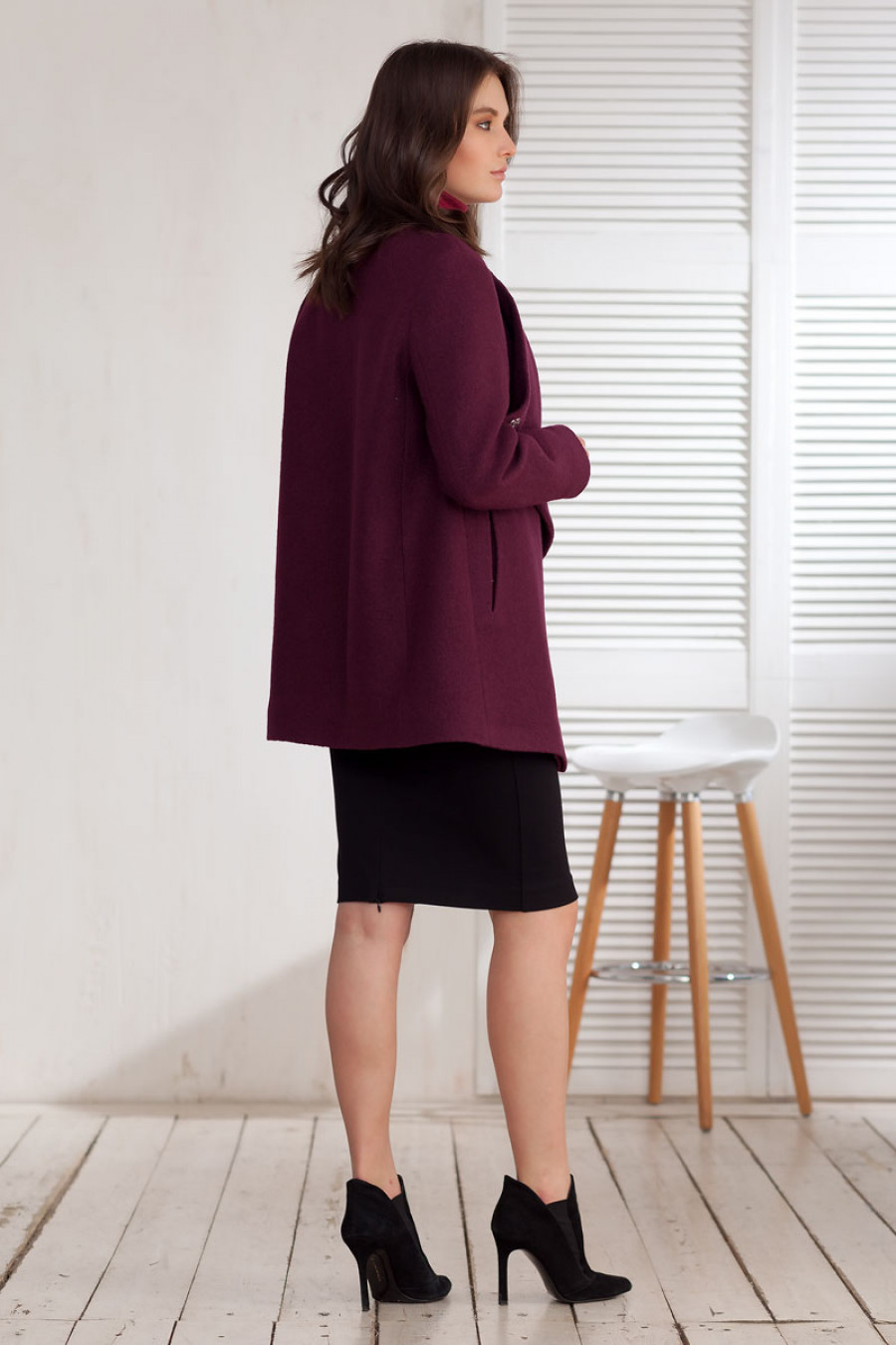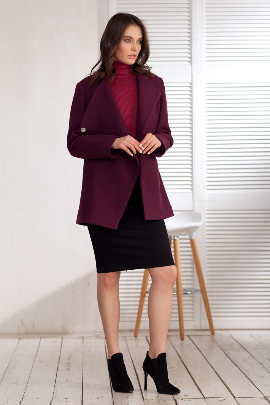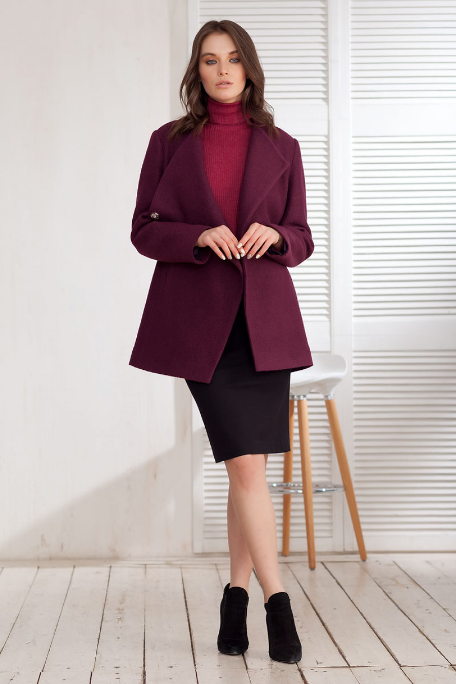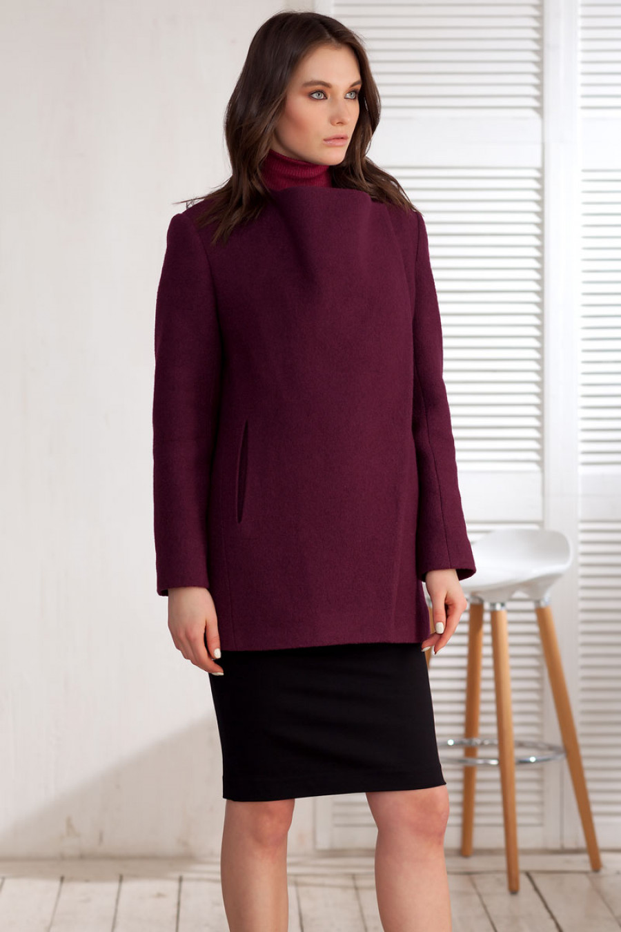 Стильное демисезонное пальто на подкладке. Модель прямого силуэта с длинным рукавом. Перед выполнен на запах с драпировкой по горловине. По бокам прорезные карманы. Застежка на кнопки.