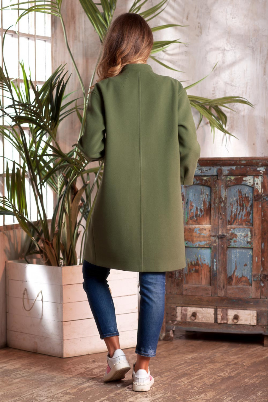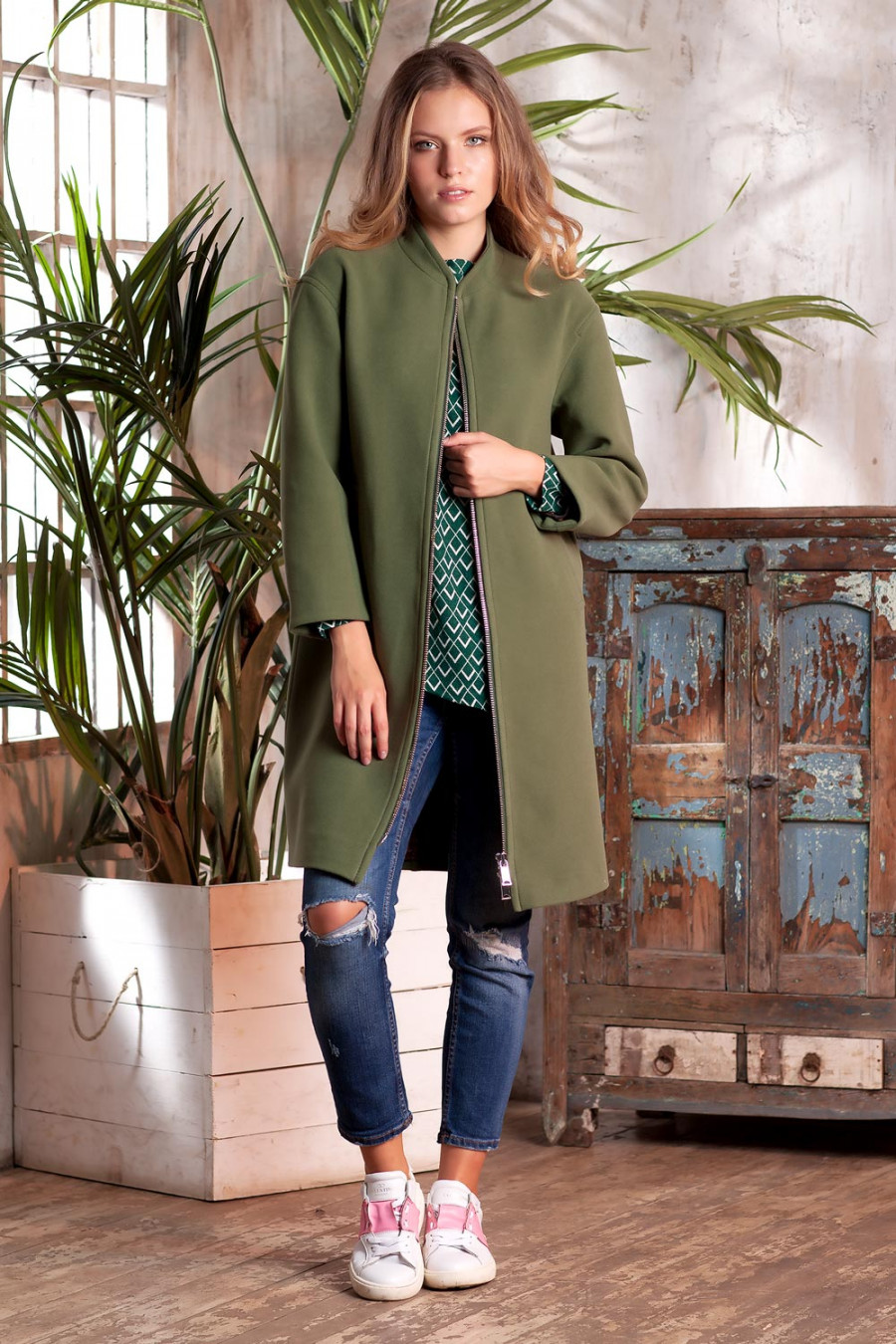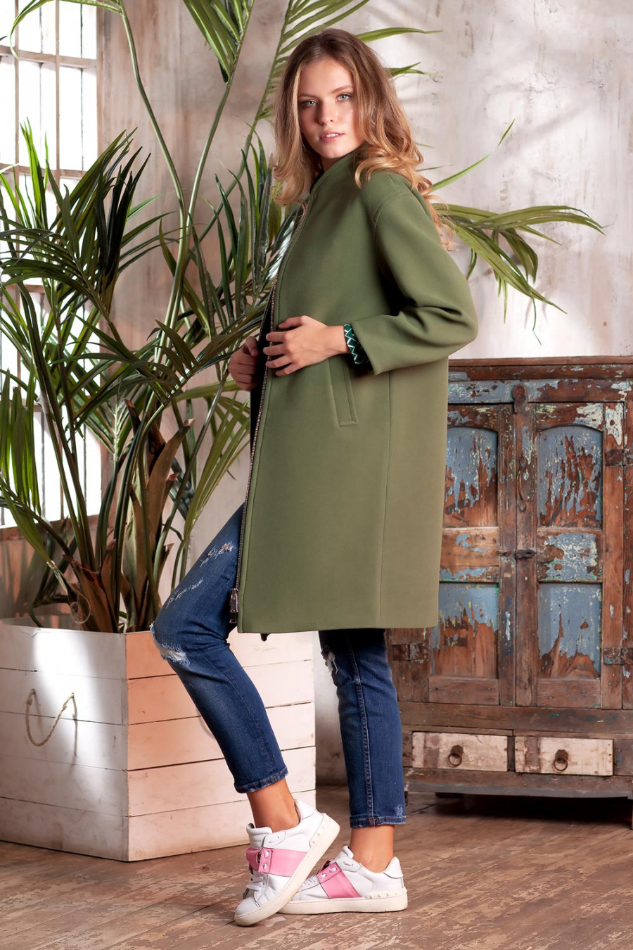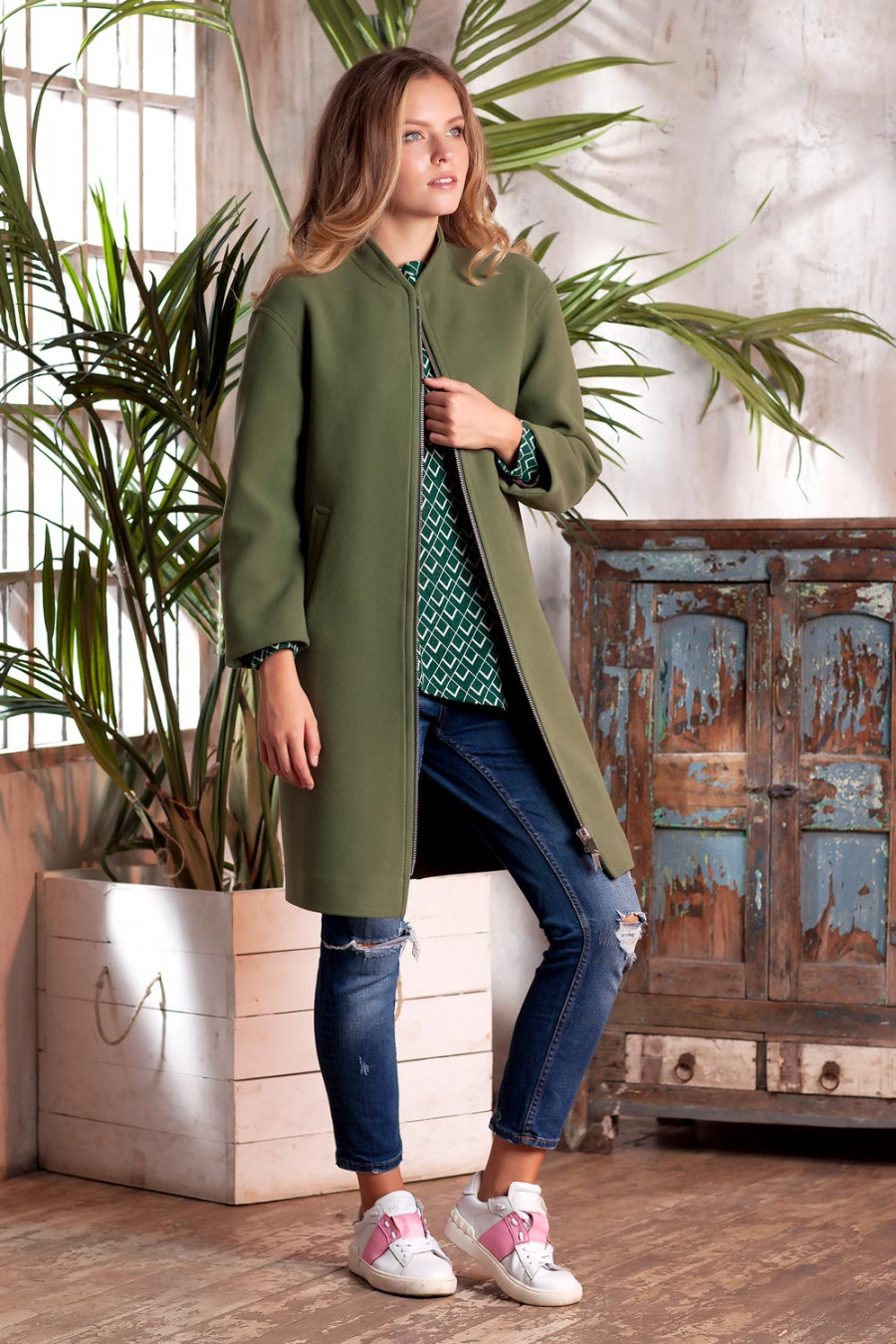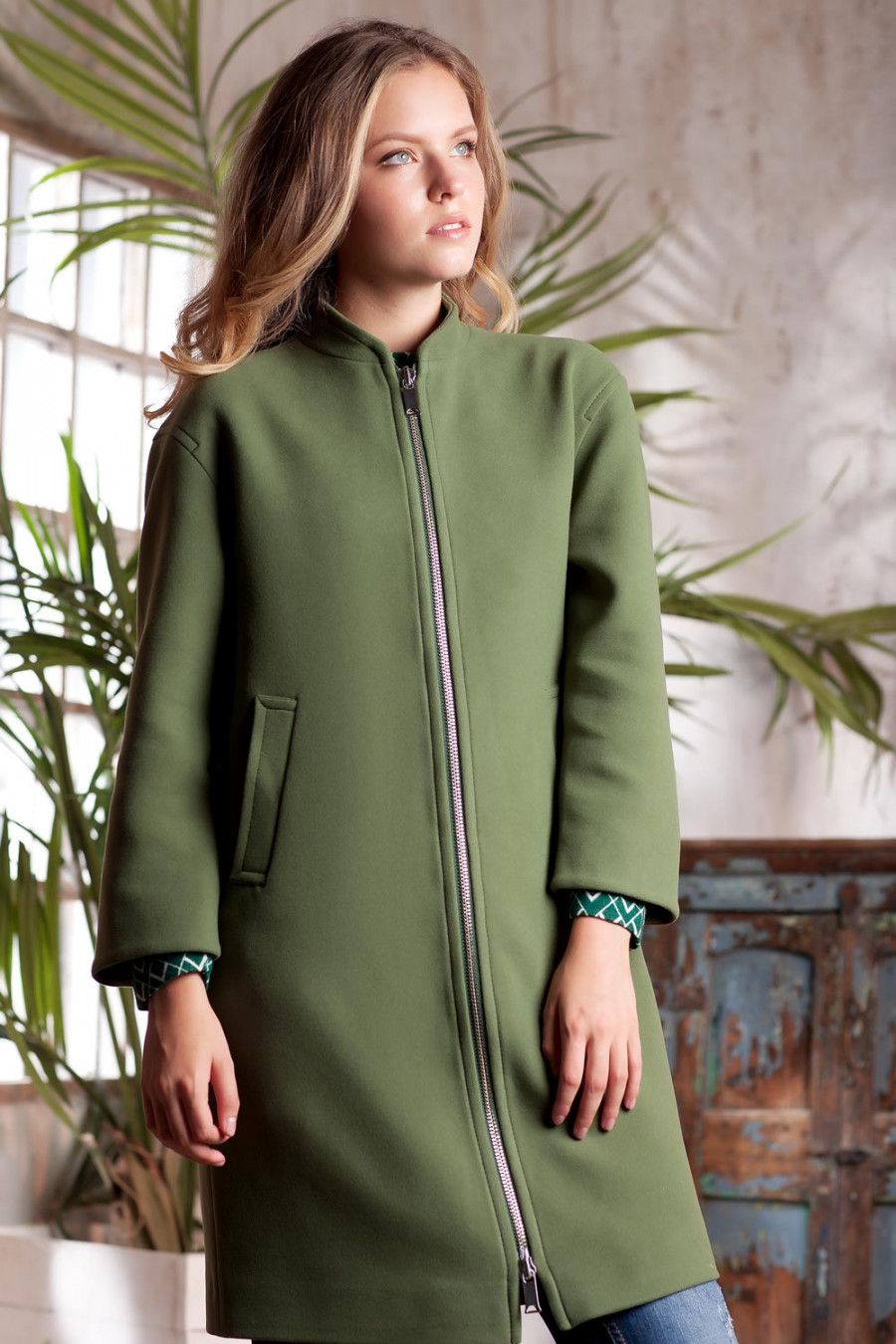 Демисезонное пальто на подкладке. Модель прямого силуэта с длинным рукавом и воротником - стойкой. На полочках выполнены прорезные карманы с листочкой. По борту, плечевым швам, листочке и воротнику проложена отделочная строчка. Впереди застежка на металлическую молнию с двумя замками. Пальто – это та составляющая женской одежды, которая идеально подчеркивает привлекательность, нежность и красоту.