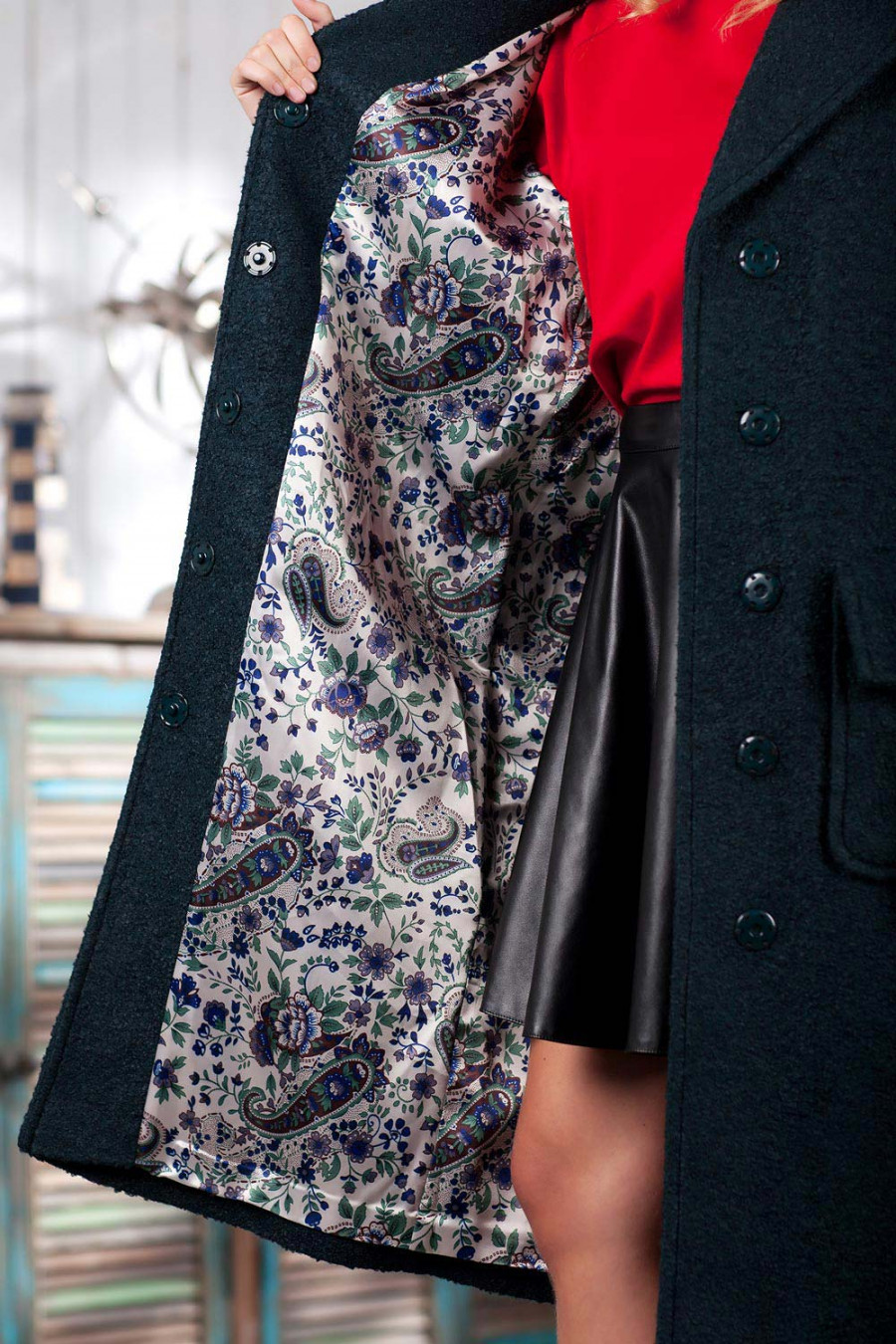Элегантное демисезонное пальто на подкладке. Модель прямого кроя длиной ниже колена с рукавом 7/8. Горловина оформлена отложным воротником с широкими лацканами. На полочке выполнены накладные карманы с отворотами, имитирующими клапаны. Впереди потайная за...