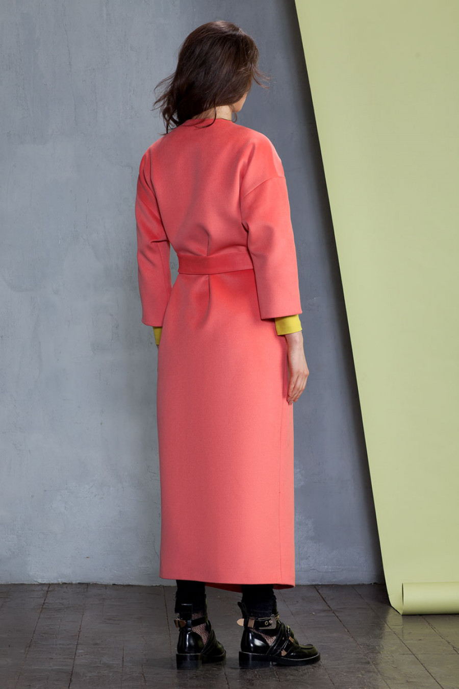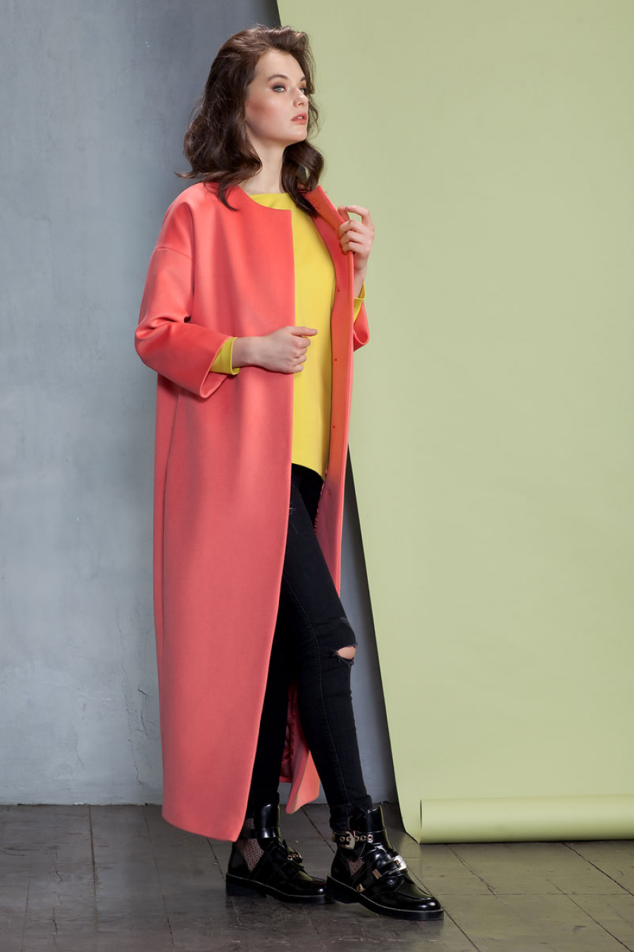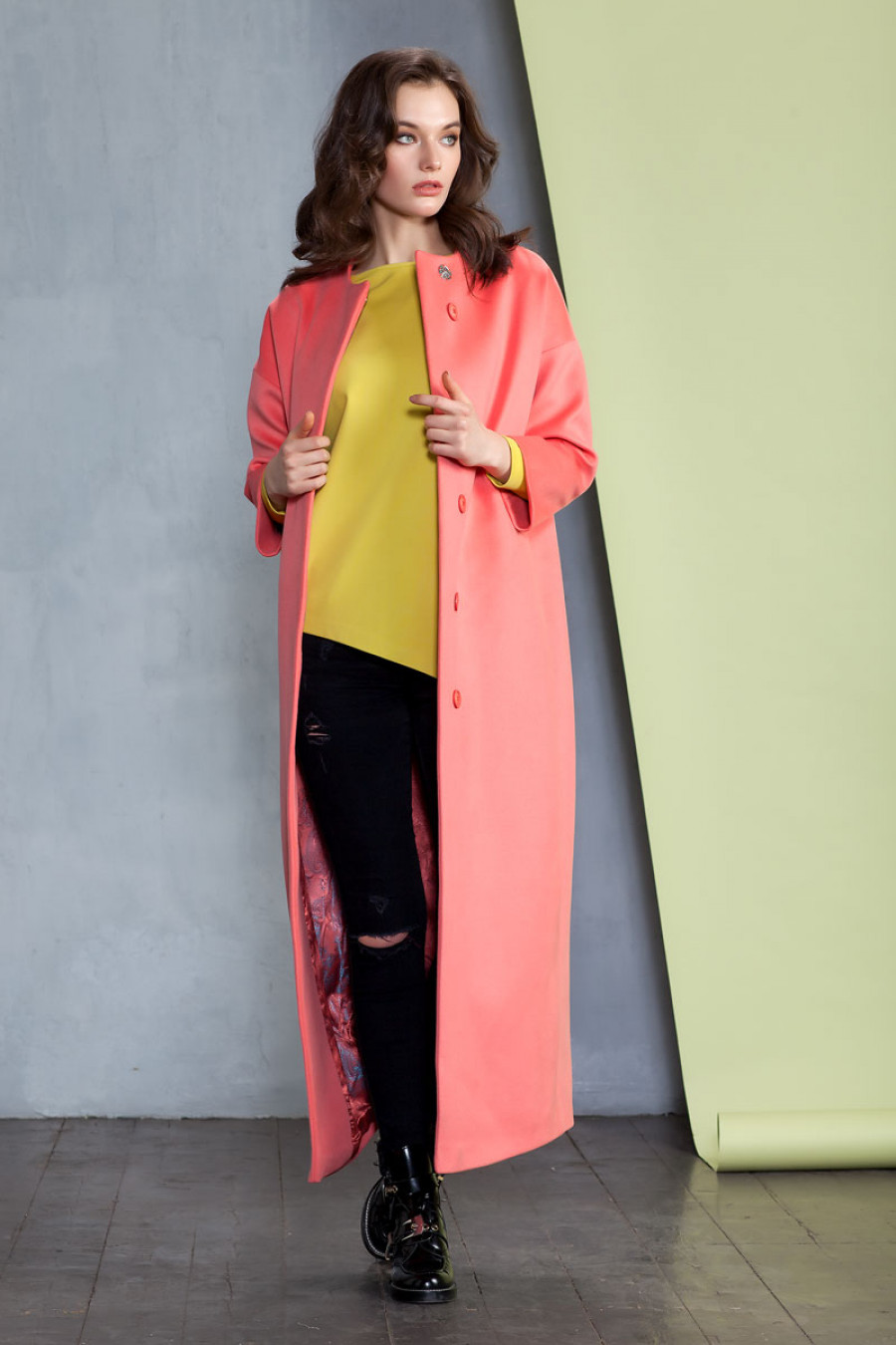 Элегантное демисезонное однотонное длинное пальто. Отсутствие воротника, широкий рукав 3/4, скрытая застежка, карманы в боковых швах подчеркивают лаконичность кроя. Изделие выполнено на подкладке. Застежка на пуговицы и кнопку.