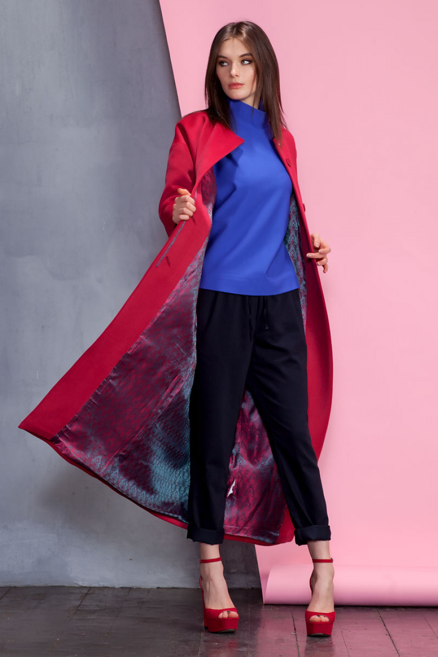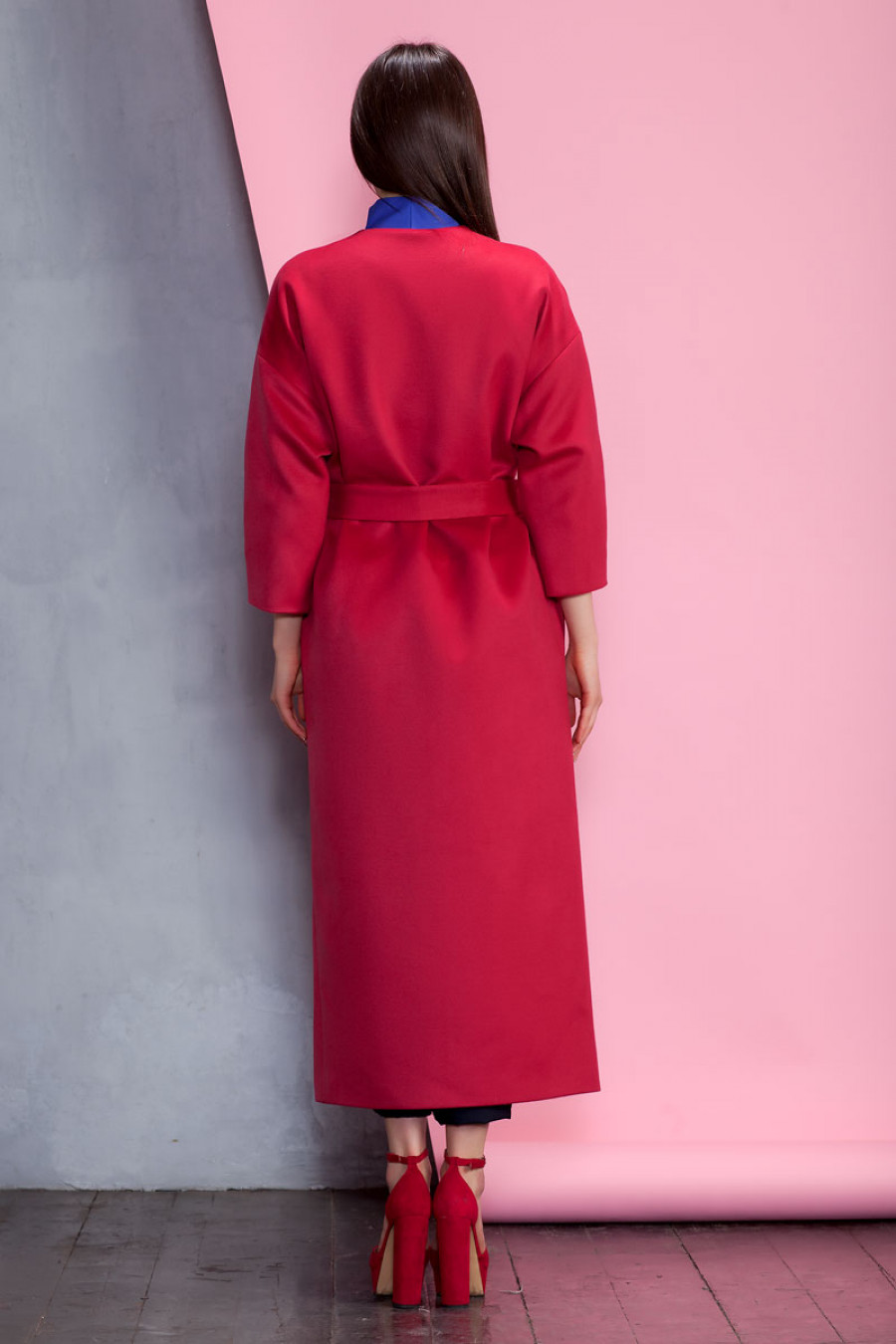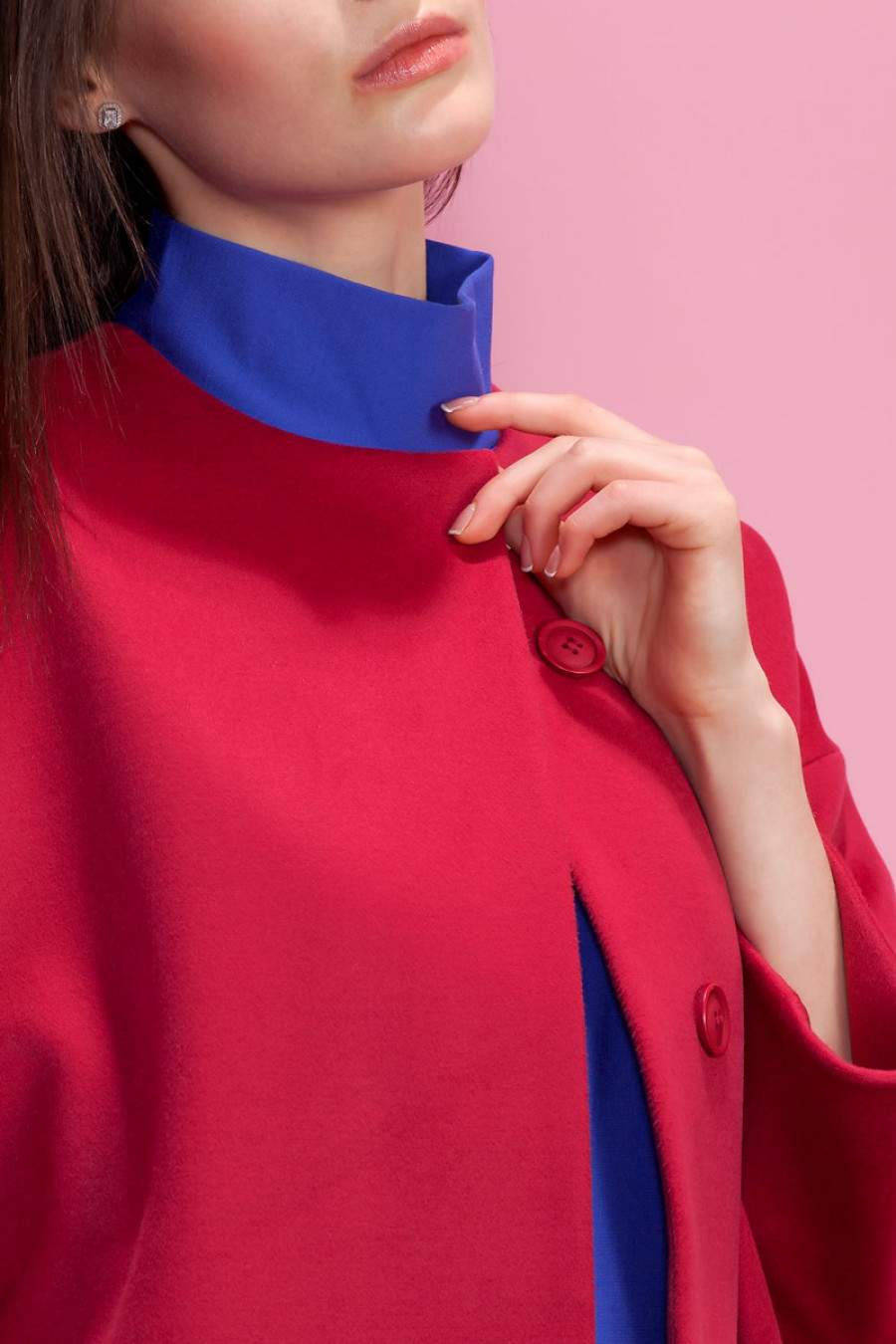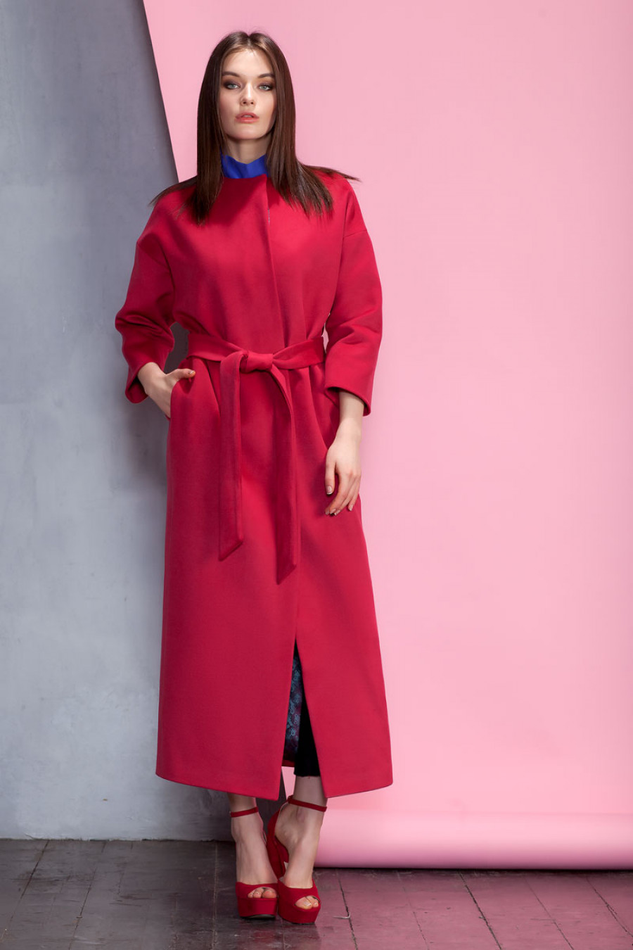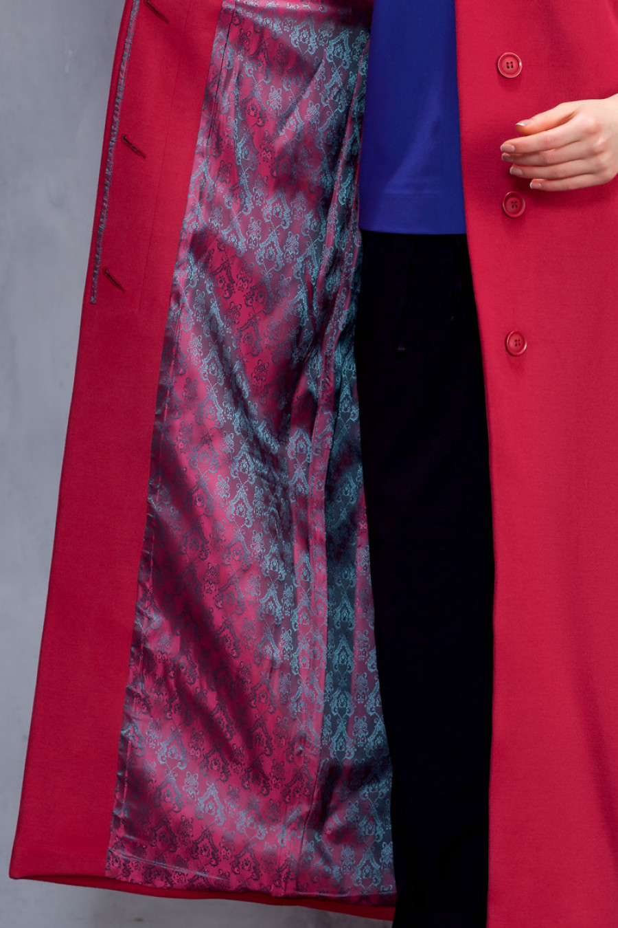 Элегантное демисезонное однотонное длинное пальто. Отсутствие воротника, широкий рукав 3/4, скрытая застежка, карманы в боковых швах подчеркивают лаконичность кроя. Изделие выполнено на подкладке. Застежка на пуговицы и кнопку.