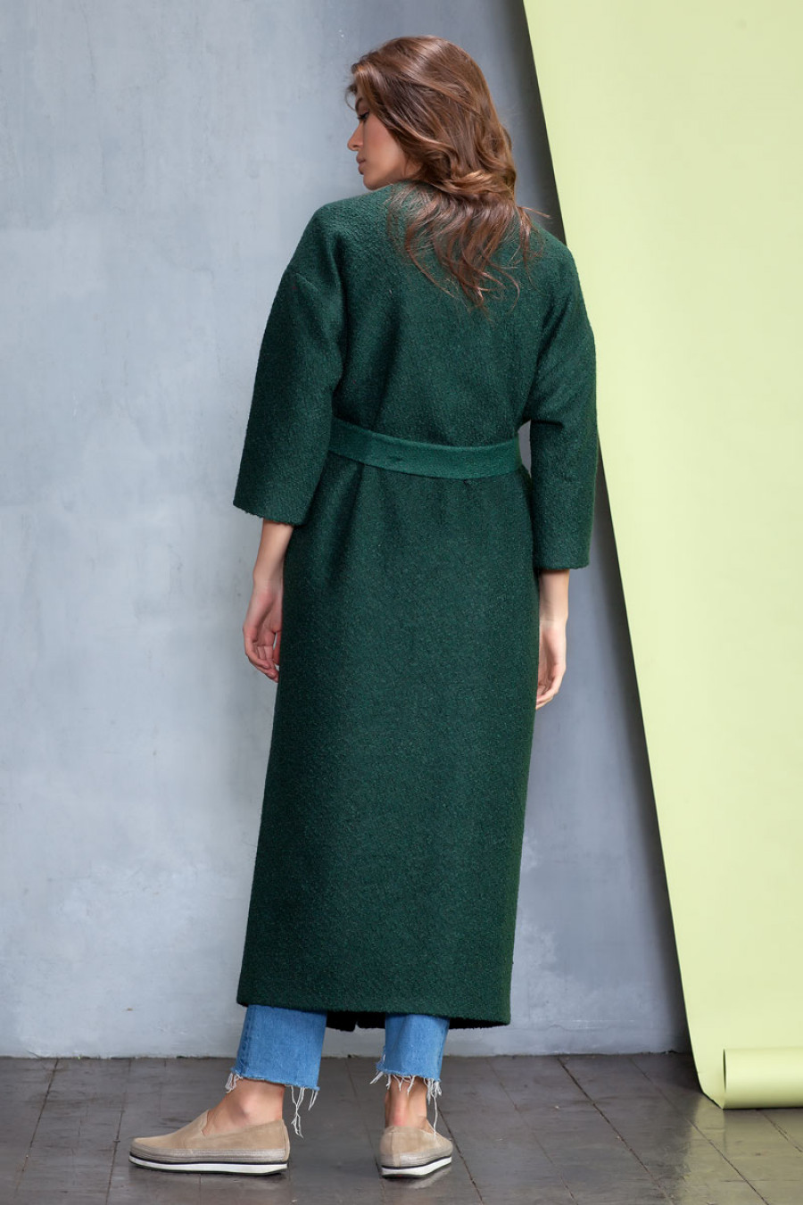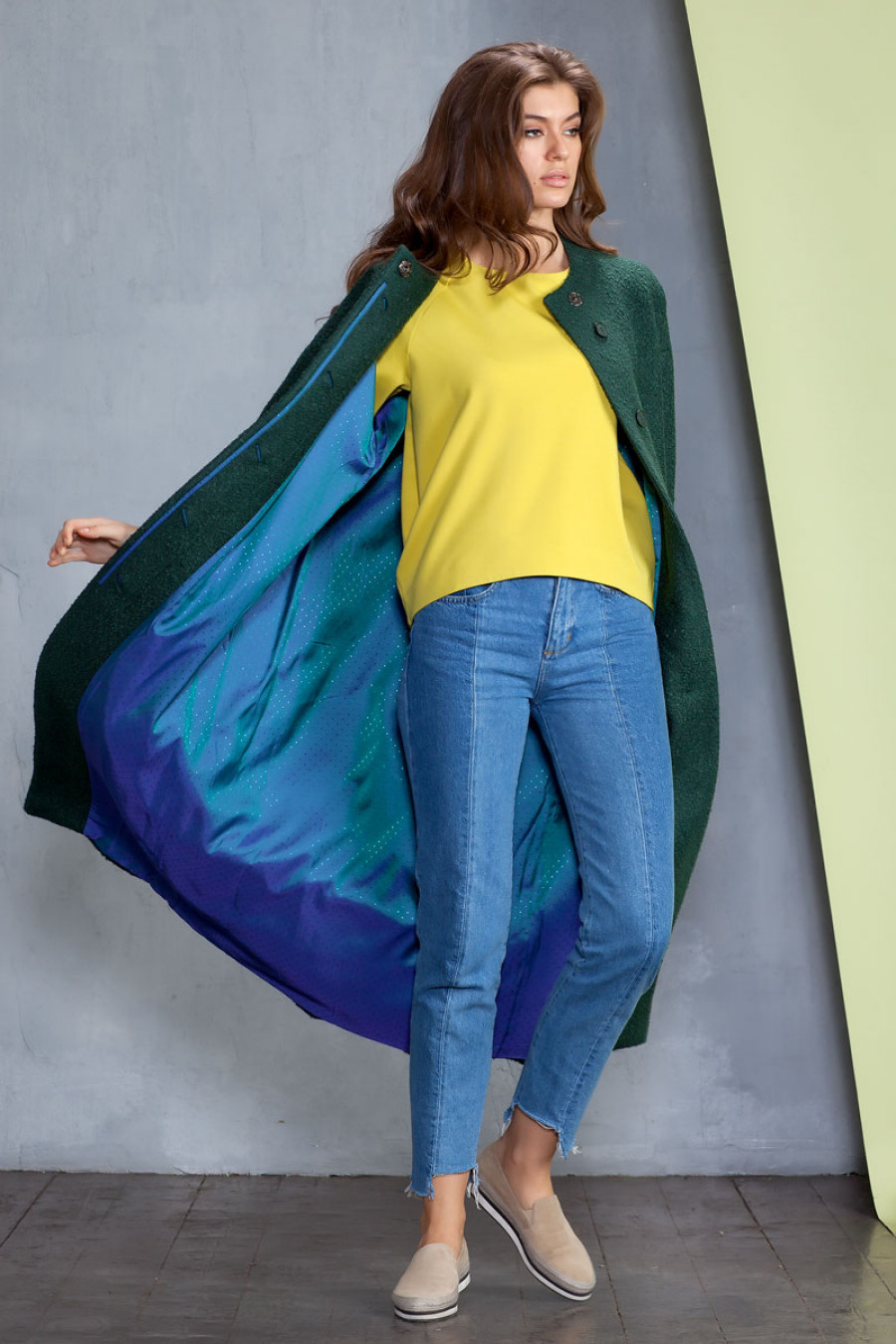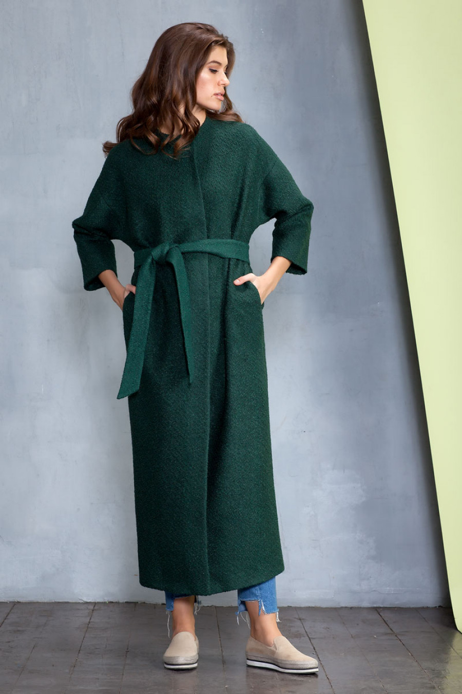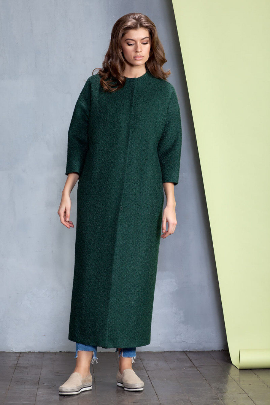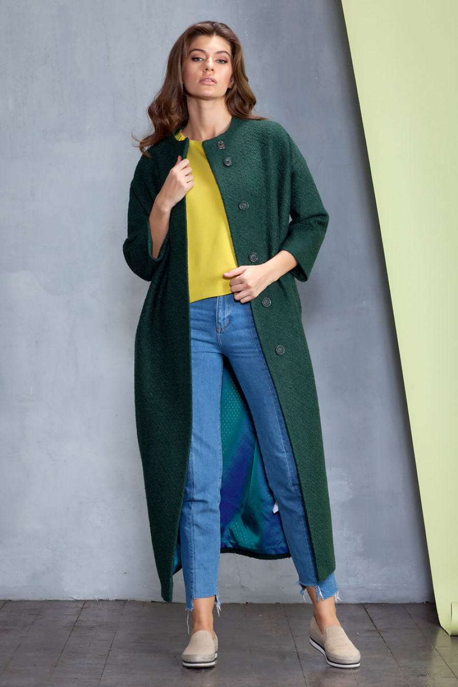Элегантное демисезонное длинное пальто из ткани букле. Отсутствие воротника, широкий рукав 3/4, скрытая застежка, карманы в боковых швах подчеркивают лаконичность кроя. Изделие выполнено на подкладке. Застежка на пуговицы и кнопку.