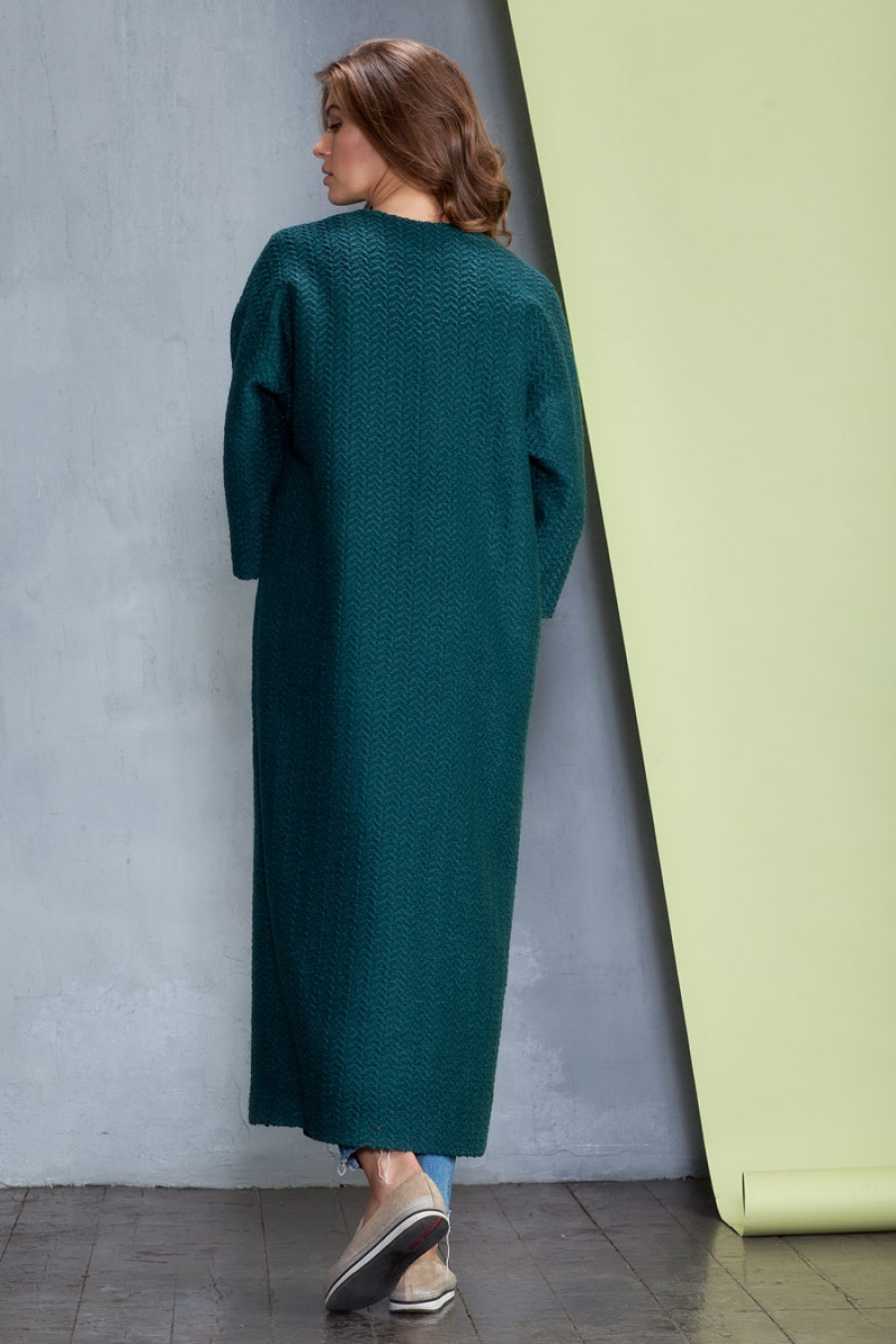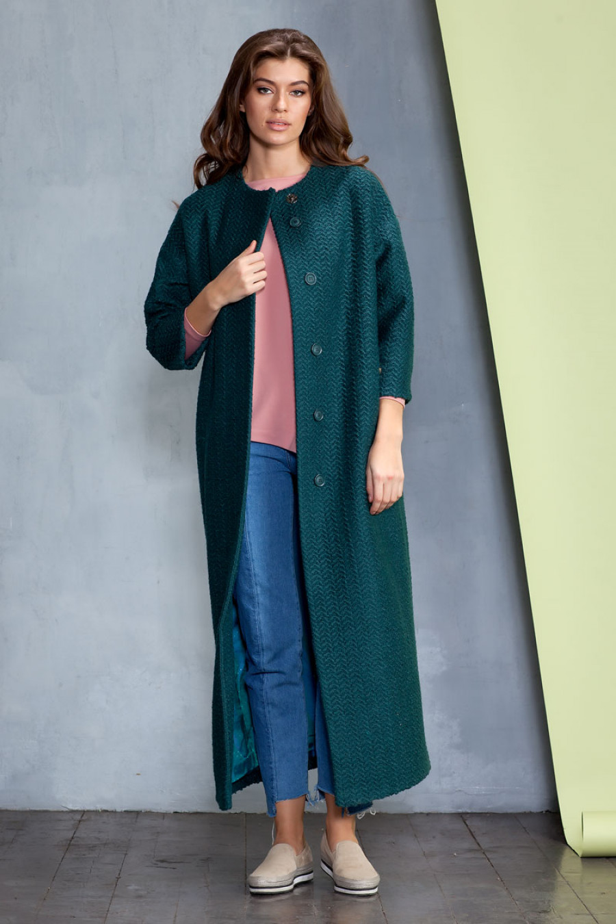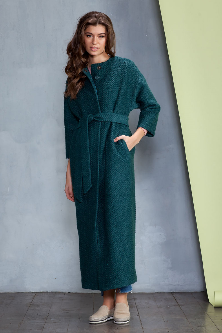 Элегантное демисезонное длинное пальто из ткани букле с рисунком. Отсутствие воротника, широкий рукав 3/4, скрытая застежка, карманы в боковых швах подчеркивают лаконичность кроя. Изделие выполнено на подкладке. Застежка на пуговицы и кнопку.