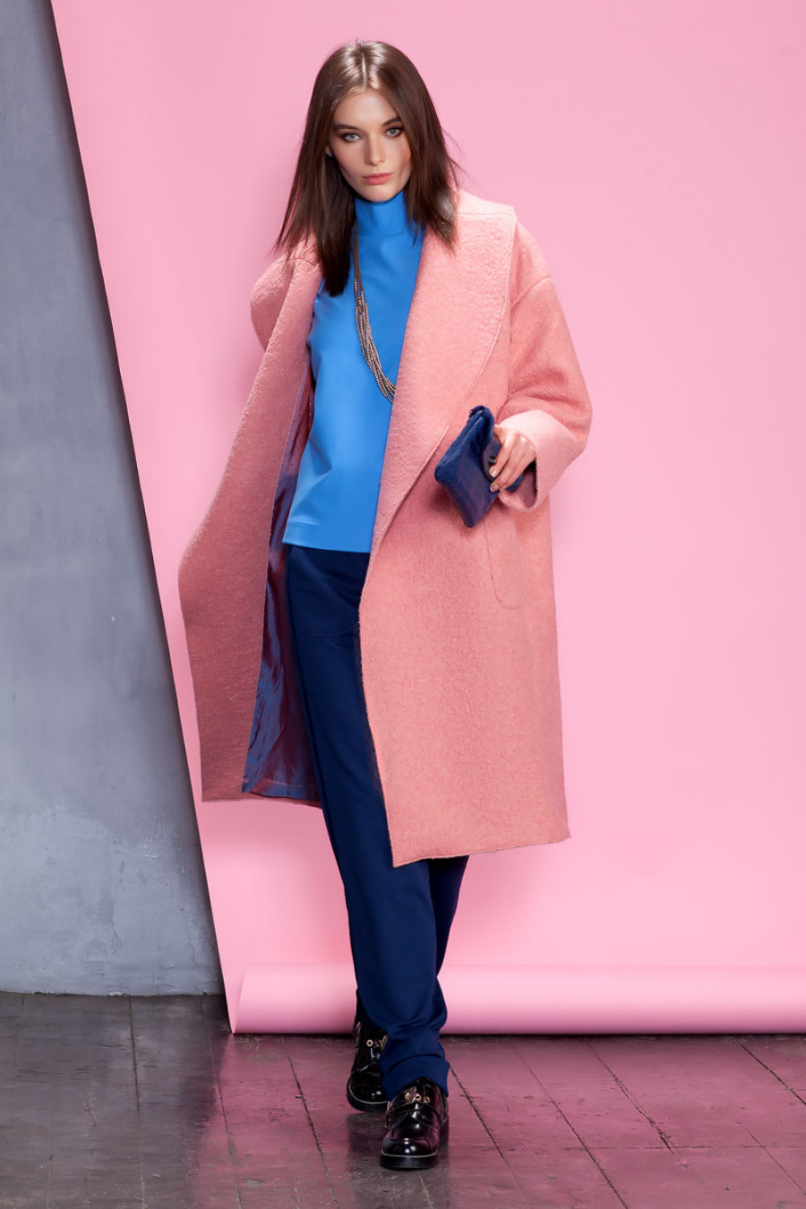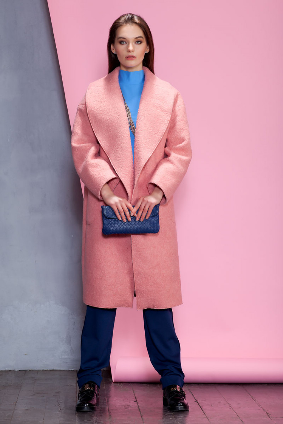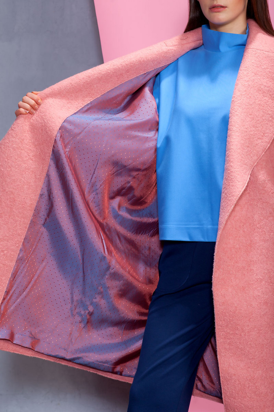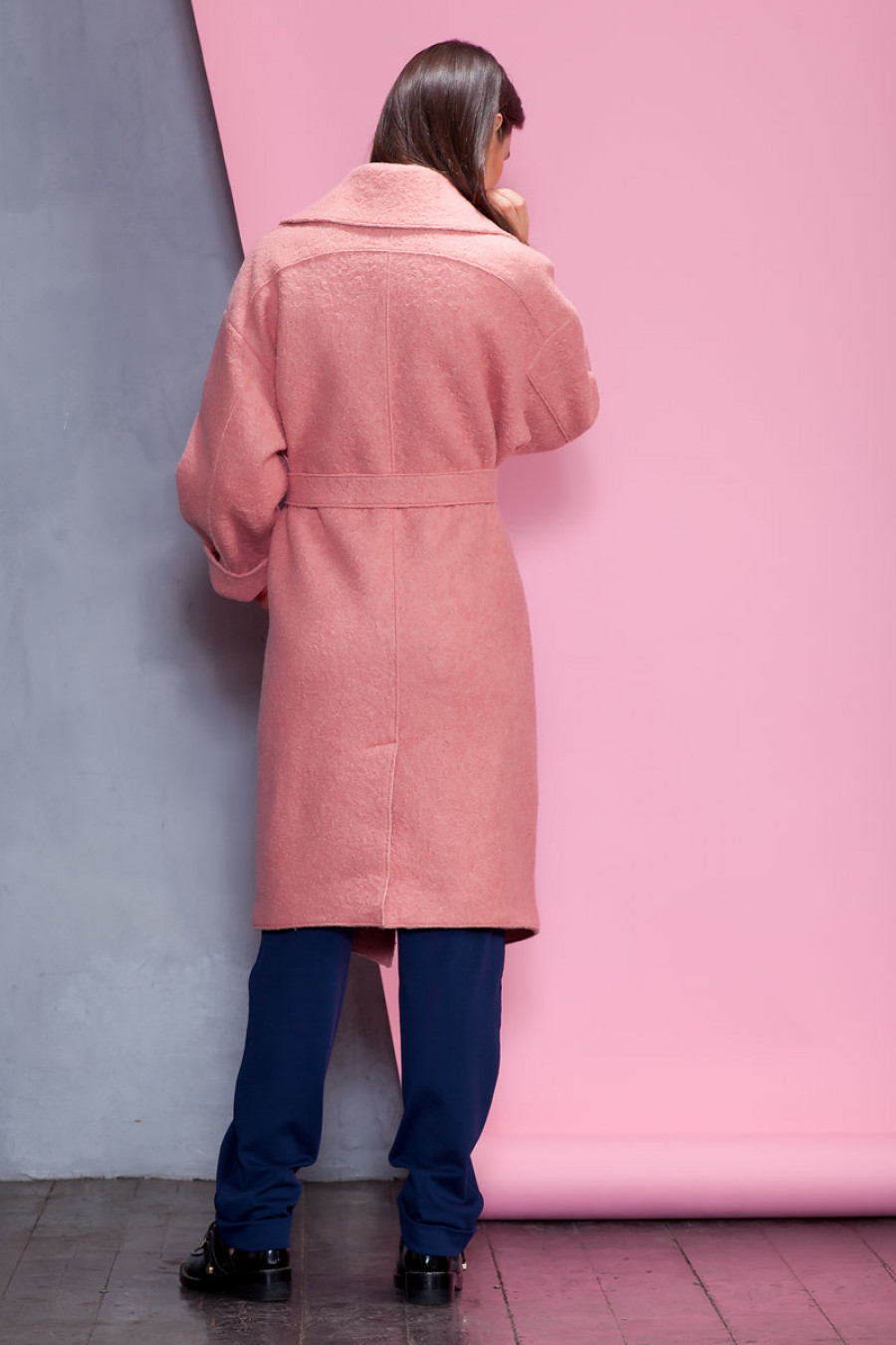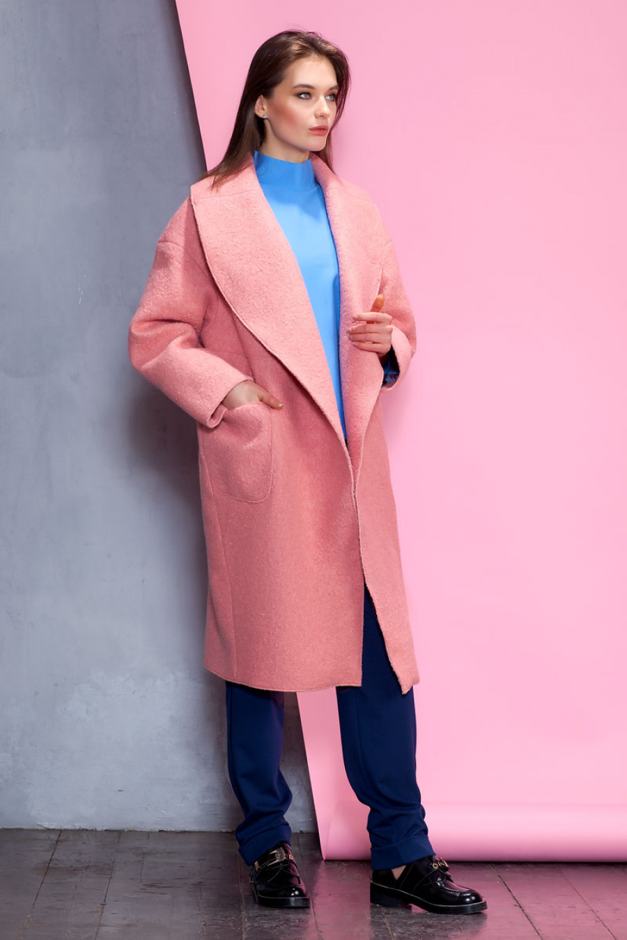 Стильное демисезонное пальто на подкладке. Модель свободного силуэта без застежки. На талии завязывается пояс. Горловина оформлена широкими лацканами. Впереди выполнены накладные карманы.