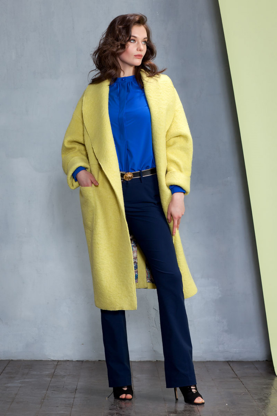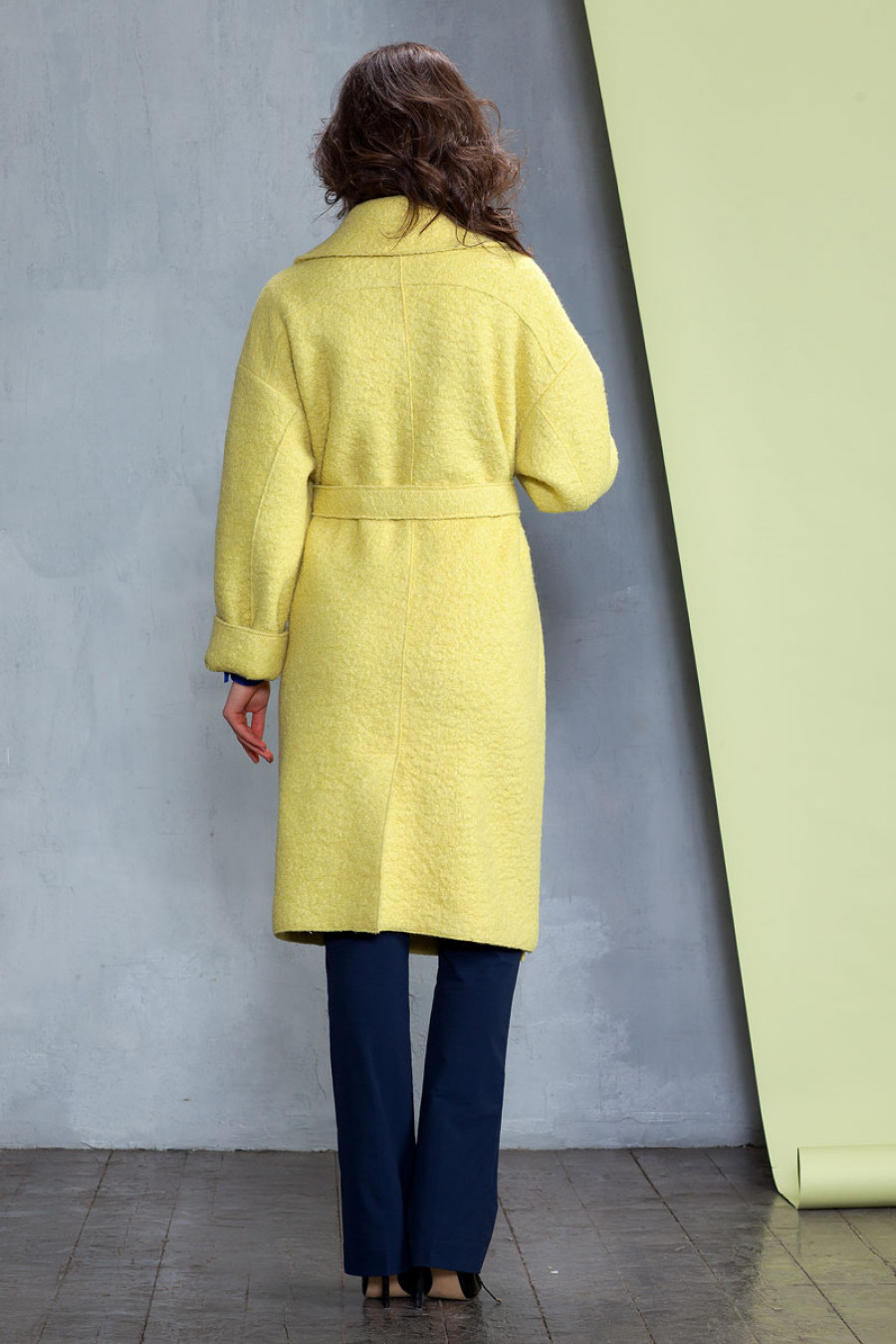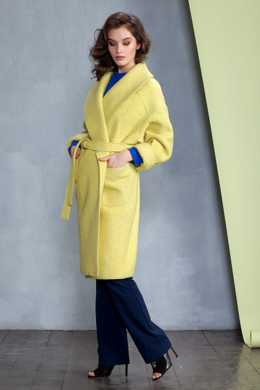 Стильное демисезонное пальто на подкладке. Модель свободного силуэта без застежки. На талии завязывается пояс. Горловина оформлена широкими лацканами. Впереди выполнены накладные карманы.