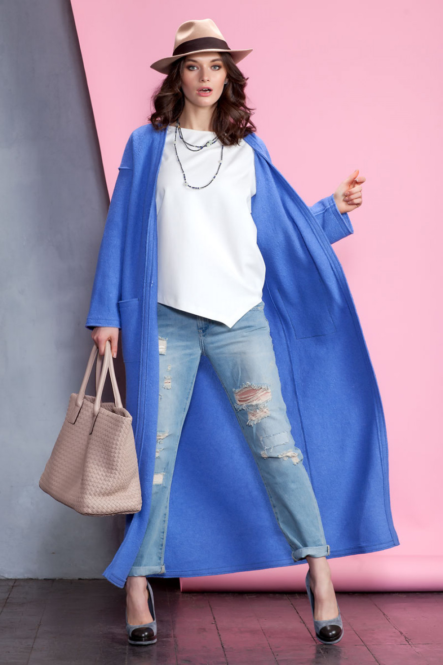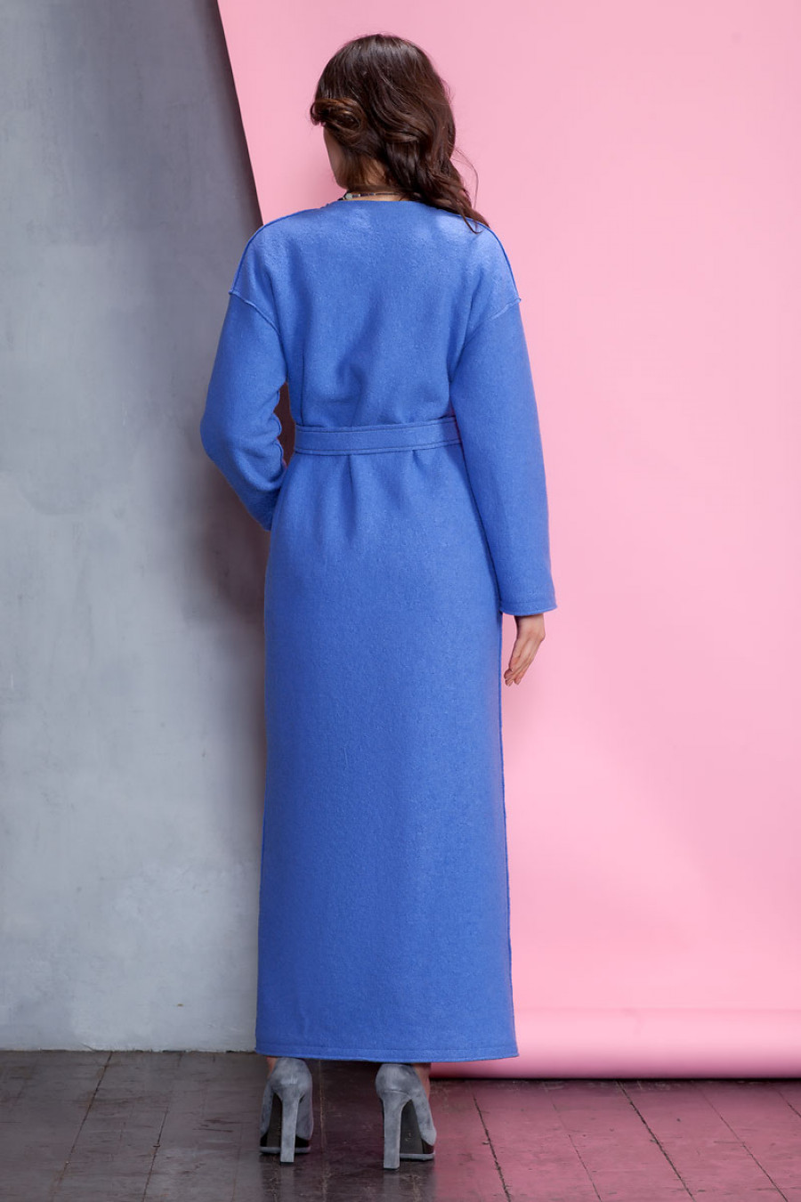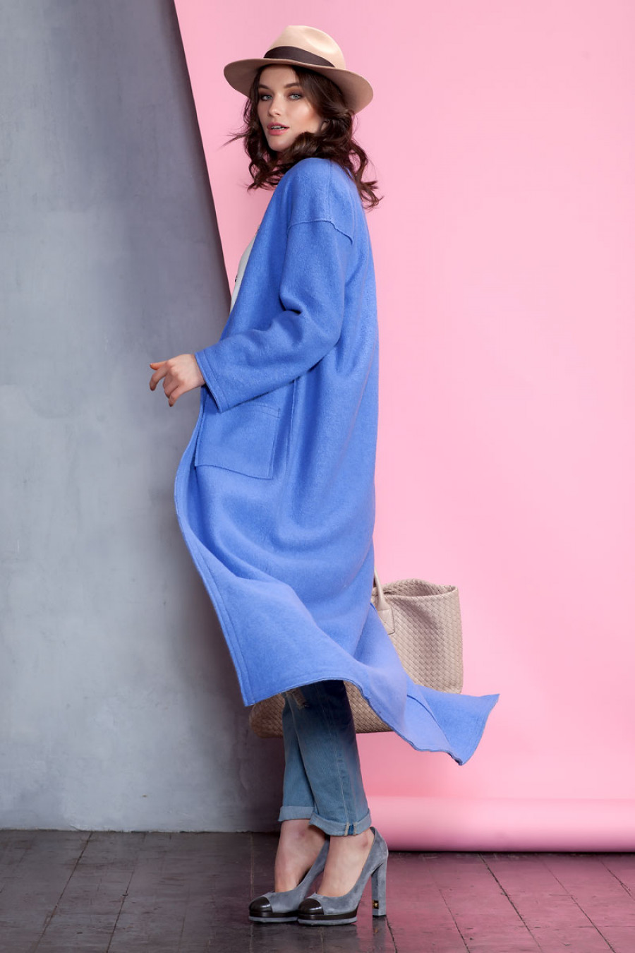 Элегантное легкое пальто без подкладки. Модель макси прямого силуэта с длинным рукавом. По борту, низу рукавов и изделия выполнены отделочные строчки. Пальто без застежки, на талии завязывается пояс.
