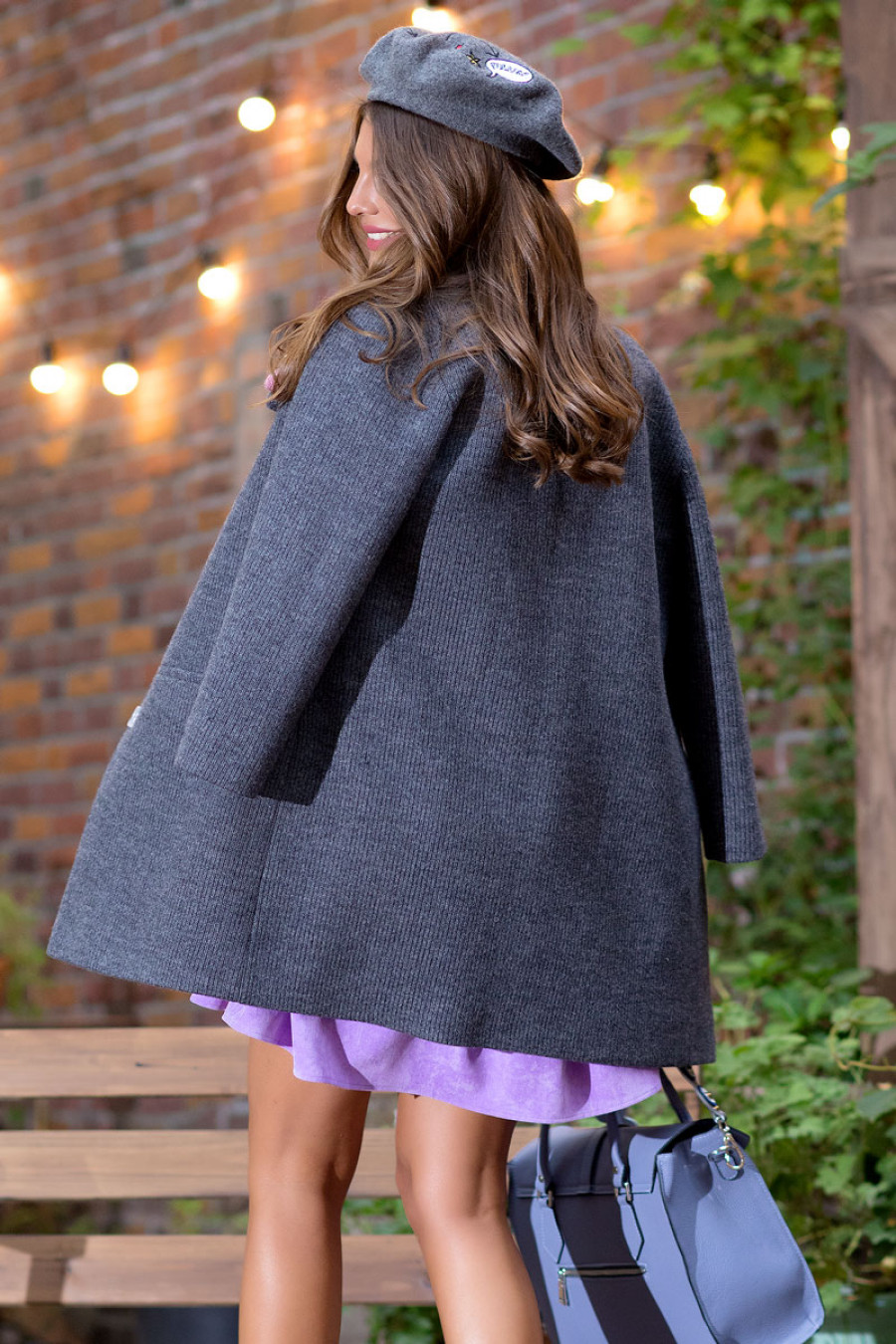 Стильное демисезонное пальто из оригинальной пальтовой ткани с вязаной структурой. Модель полуприлегающего силуэта с рукавом 7/8. Впереди выполнены карманы в поперечных швах полочки. Застежка потайная на пуговицы. Декоративным дополнением служат броши в виде вязаных шапочек. Изделие на подкладке.