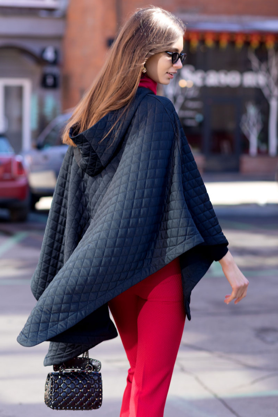 Стильное пальто-пончо из стеганого трикотажа. Модель свободного кроя с капюшоном. Спереди большие накладные карманы и шнуровка по горловине. Сзади на талии выполнена кулиса с киперной тесьмой-поясом, завязывающимся спереди.