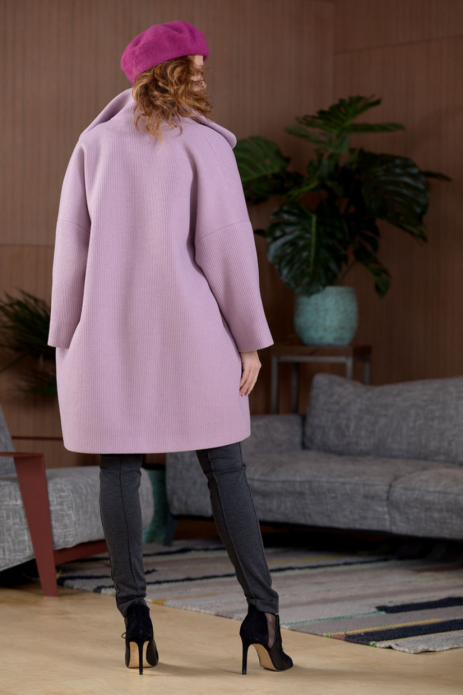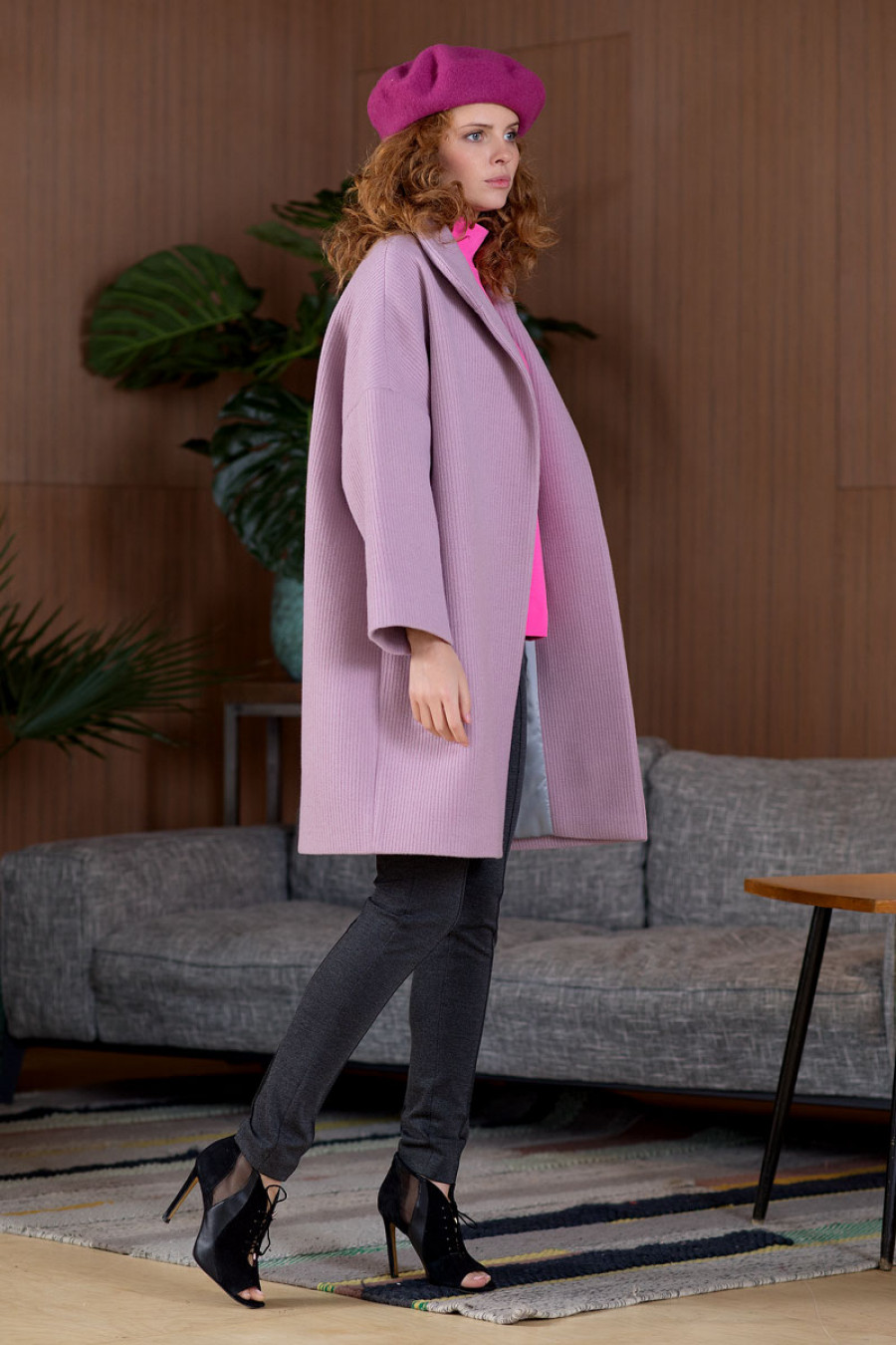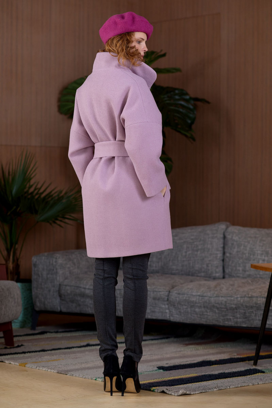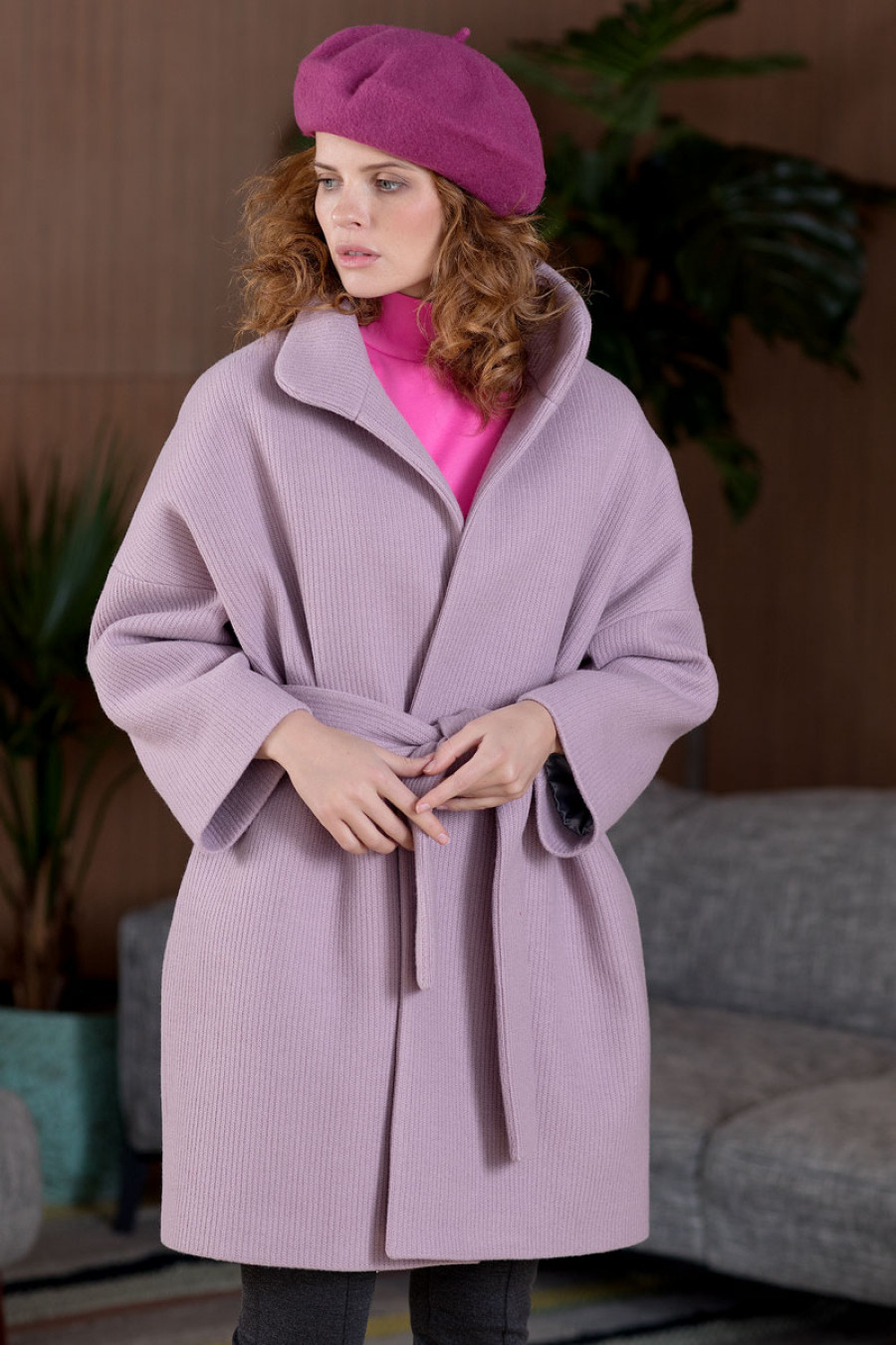 Демисезонное утепленное пальто из вязаного трикотажа на подкладке. Модель свободного кроя с воротником стойка и длинным приспущенным рукавом. В боковых швах карманы. Пальто без застежки с завязывающимся на талии поясом.