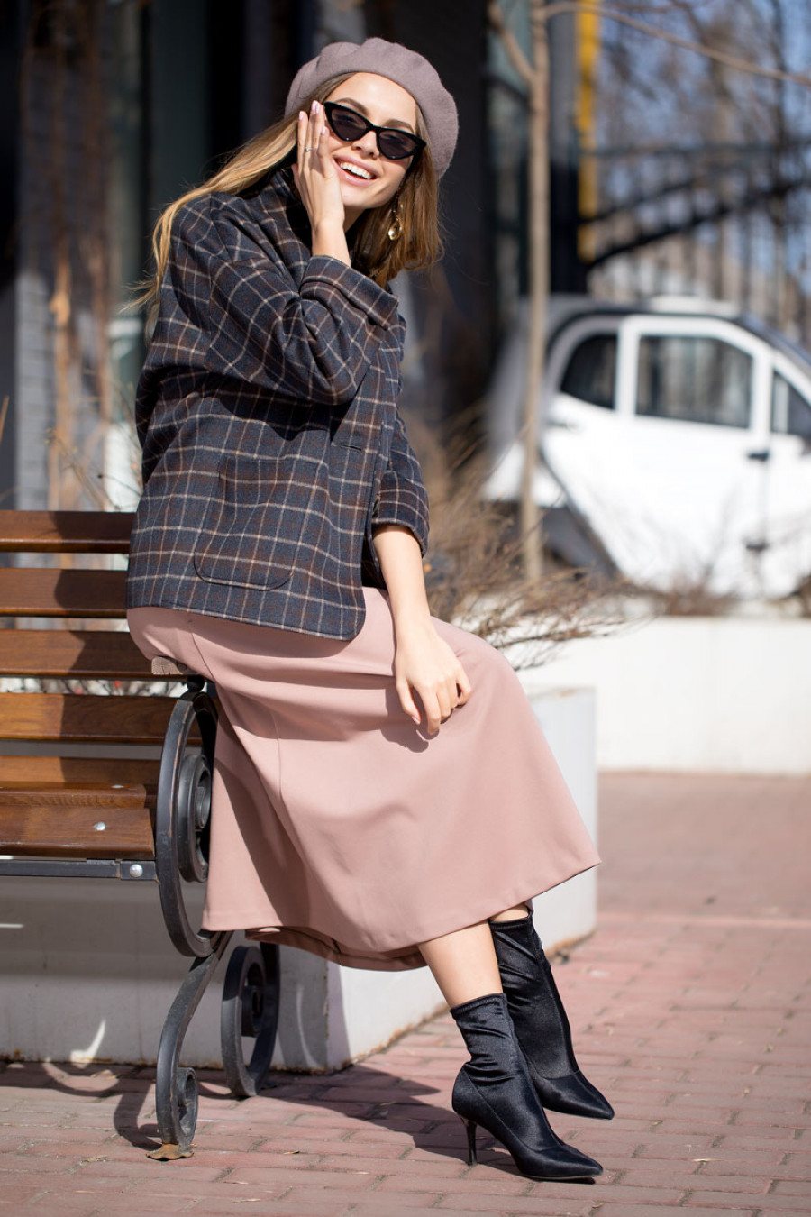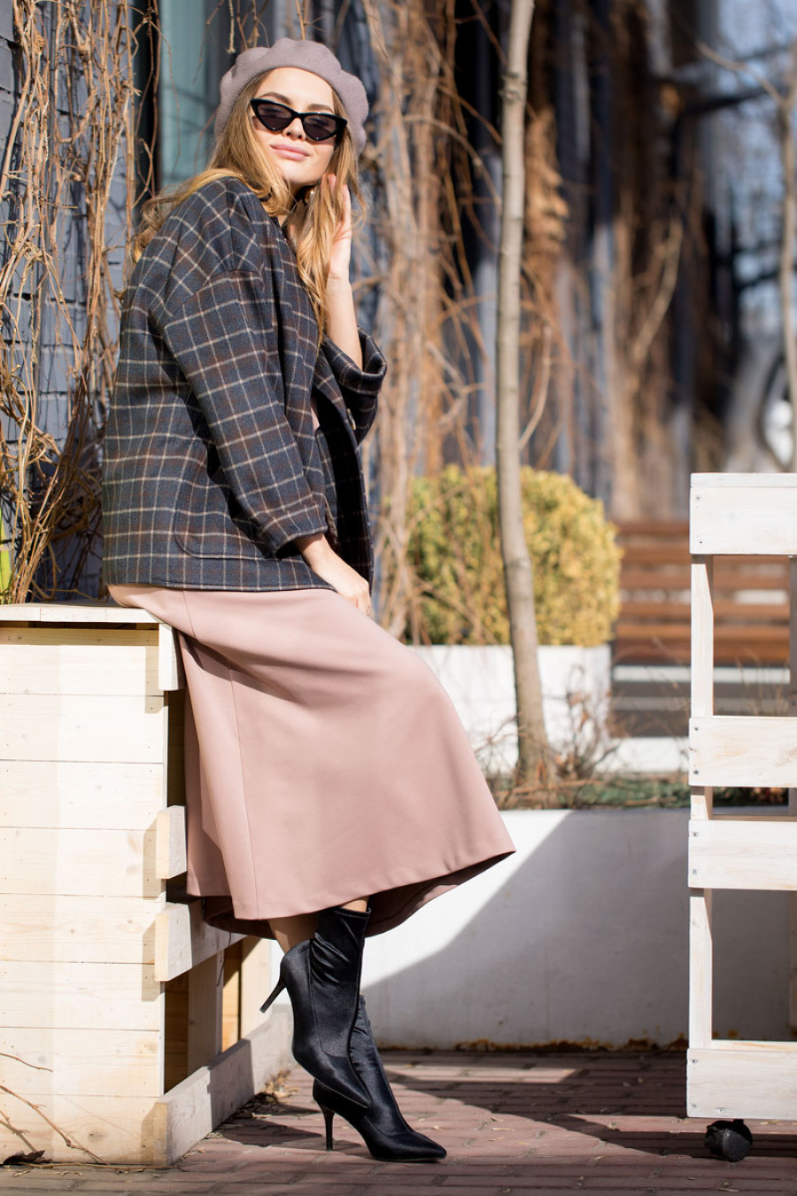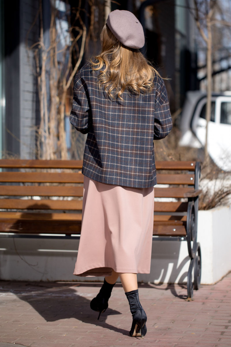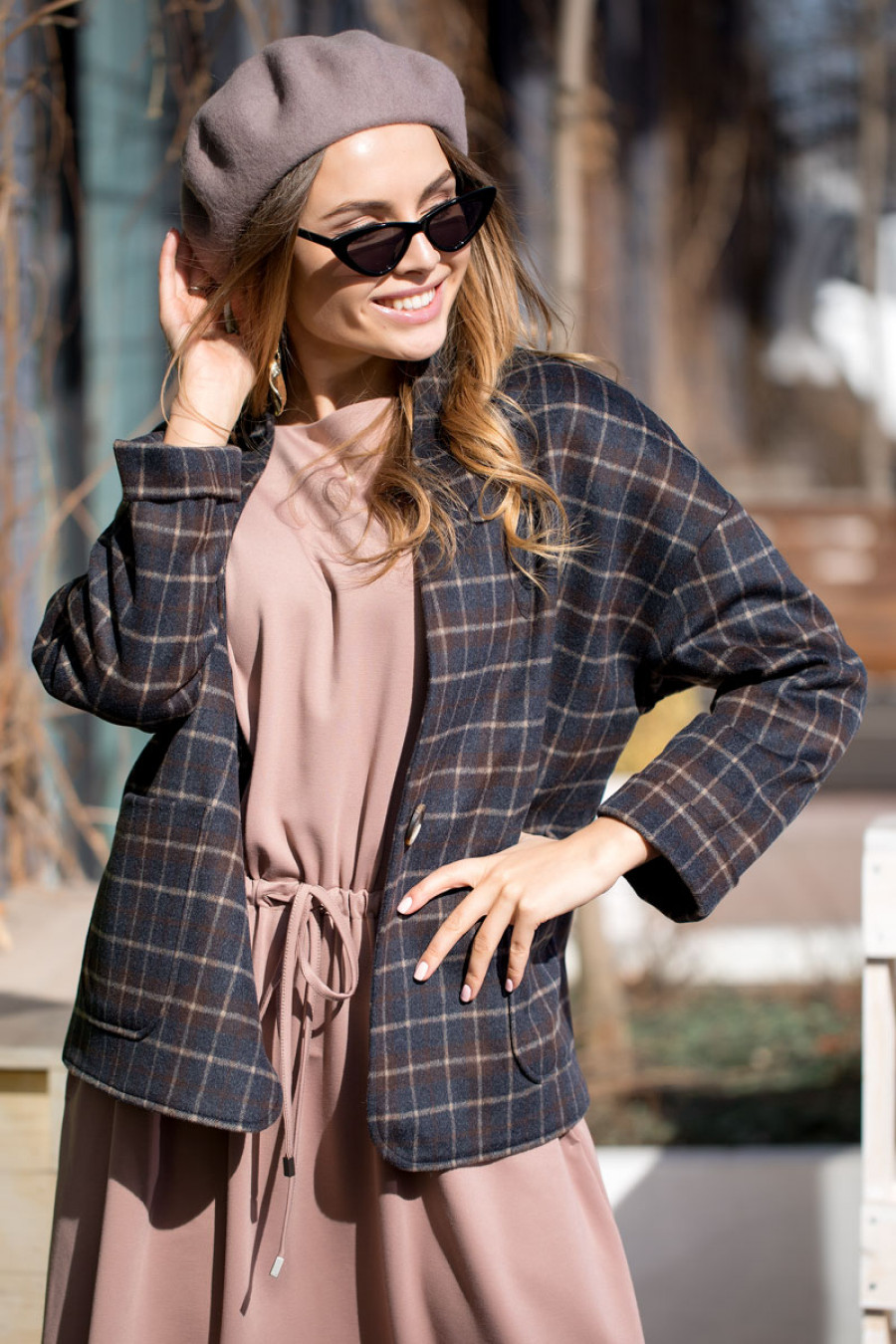 Демисезонное короткое пальто в крупную клетку с длинным рукавом на подкладке. Модель свободного кроя без воротника с глубоким v-образным вырезом. Впереди большие накладные карманы и застежка на одну пуговицу.