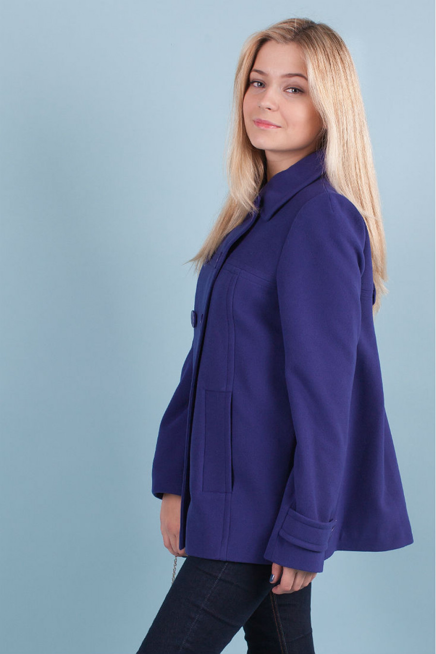 Восхитительное двубортное синее пальто выполнено в форме трапеции. Воплощение женственности и элегантности.