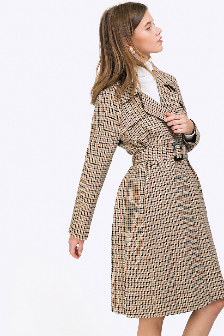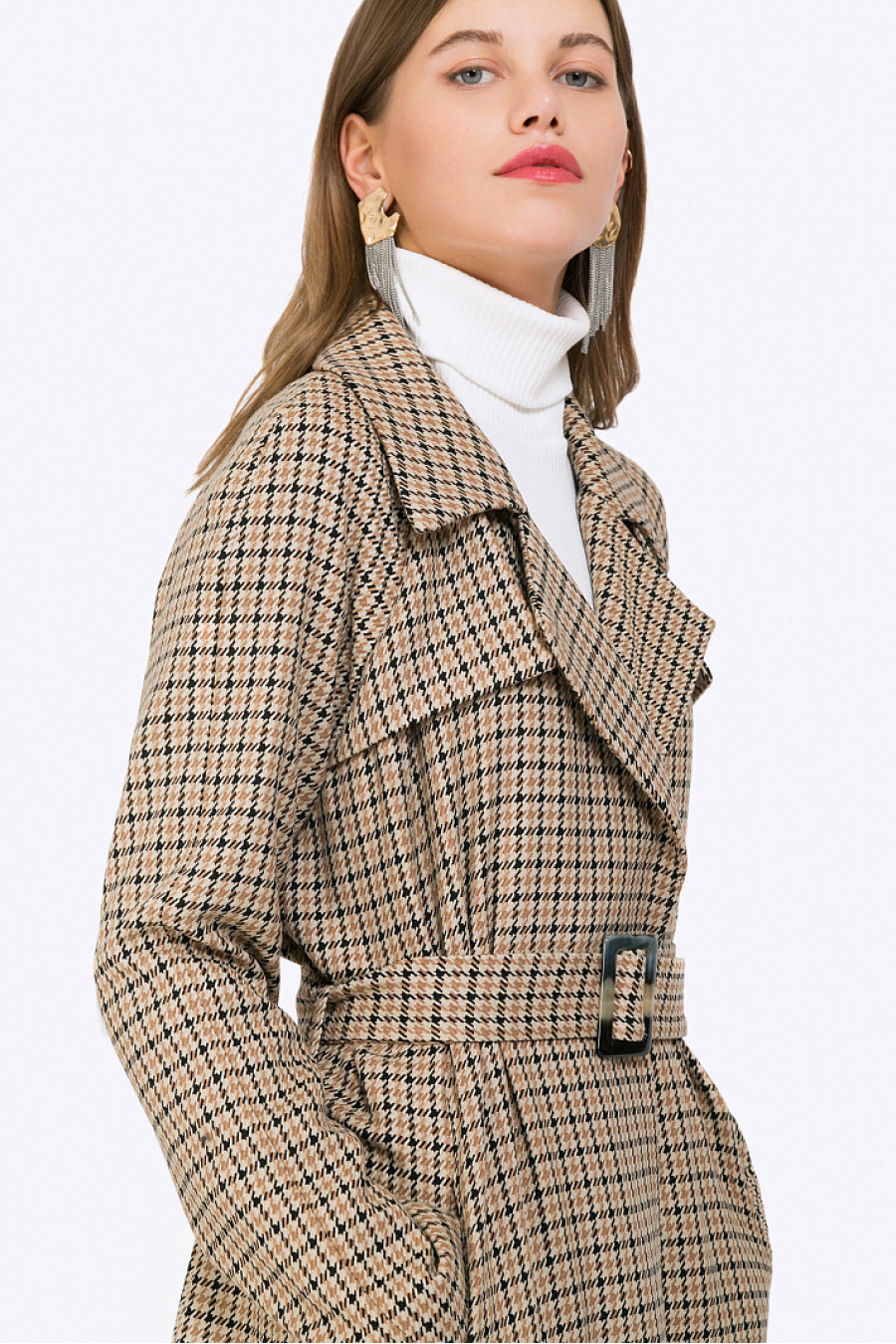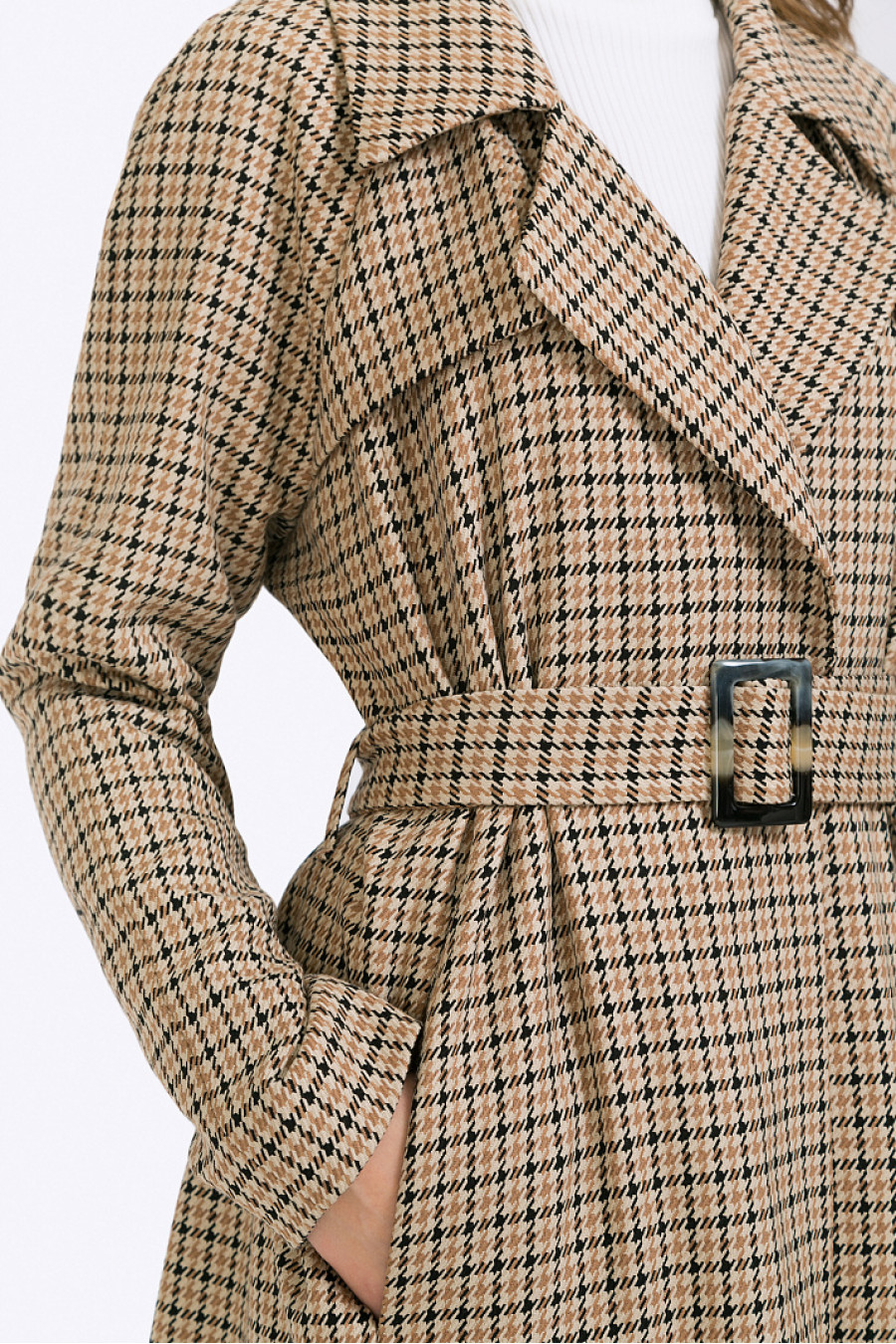 Плащ из фактурной ткани в клетку, выполненную в контрастной бежево-коричневой цветовой гамме. Модель на подкладке. Имеет прямой покрой, рукава-реглан, английский воротник с широкими лацканами. Справа расположена отлётная кокетка, карманы в боковых швах. Линию талии подчёркивает широкий пояс с перламутровой пряжкой прямоугольной формы. Образ на фото дополнен Блузкой B2285-navajo . Рост фотомодели 174 см.