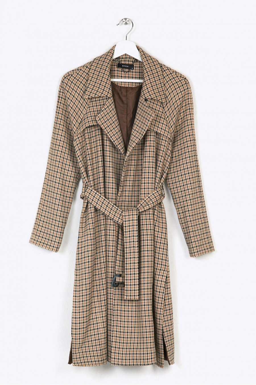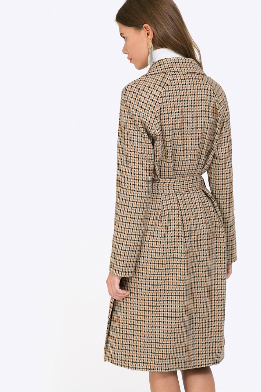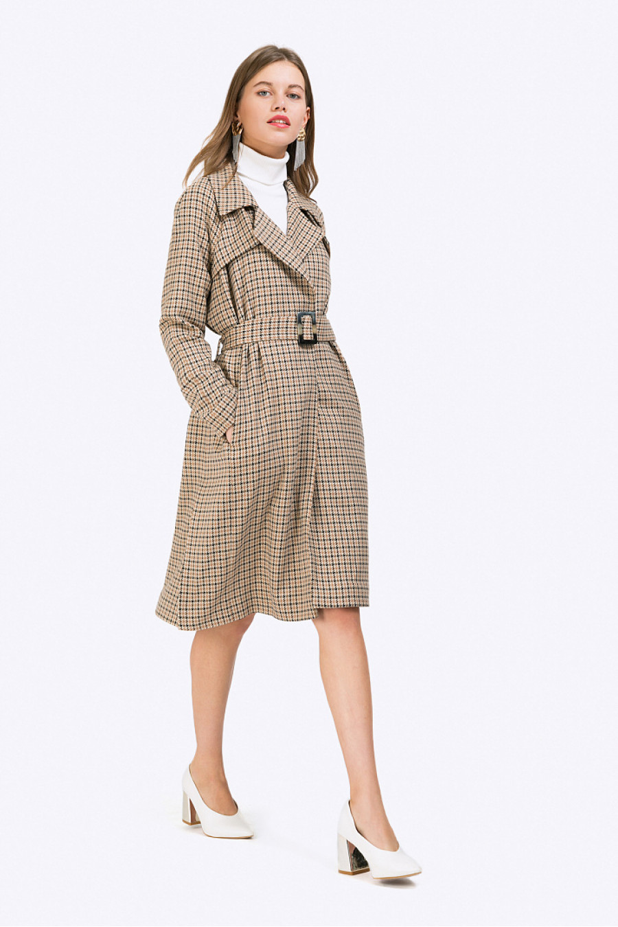 Плащ из фактурной ткани в клетку, выполненную в контрастной бежево-коричневой цветовой гамме. Модель на подкладке. Имеет прямой покрой, рукава-реглан, английский воротник с широкими лацканами. Справа расположена отлётная кокетка, карманы в боковых швах. Линию талии подчёркивает широкий пояс с перламутровой пряжкой прямоугольной формы. Образ на фото дополнен Блузкой B2285-navajo . Рост фотомодели 174 см.