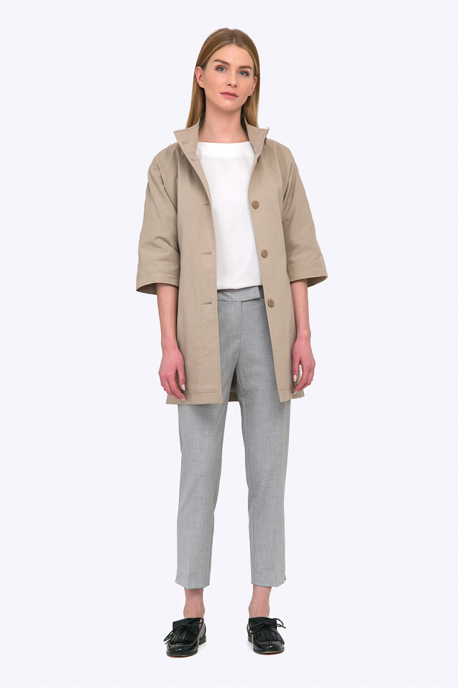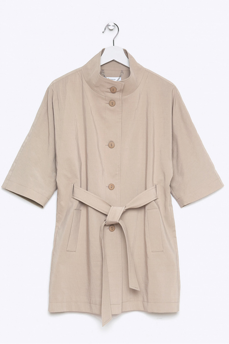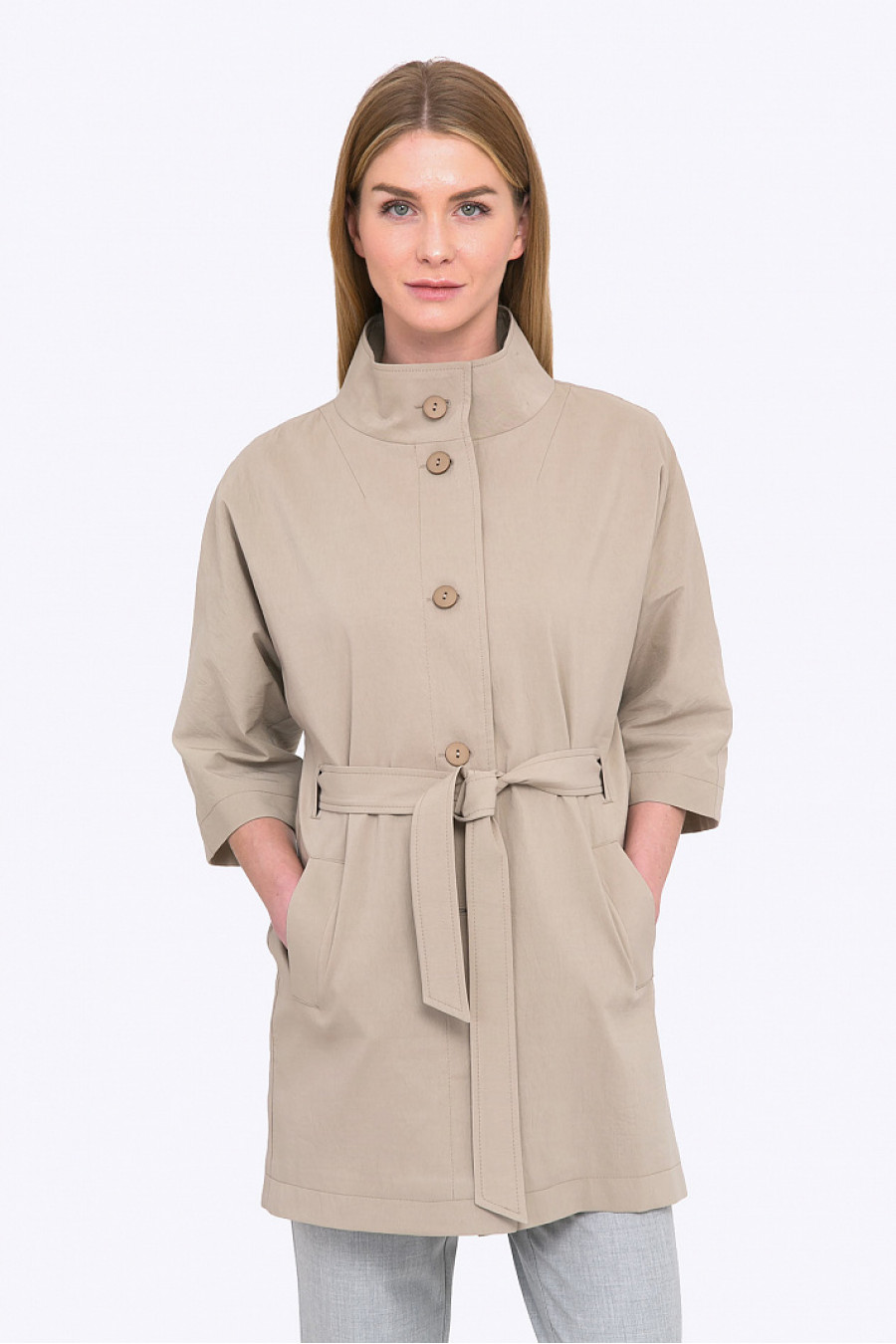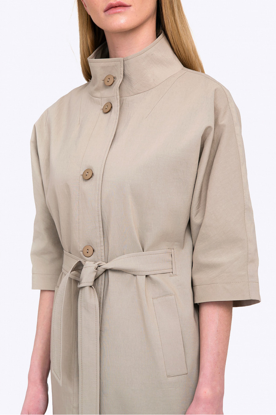 Cовременный тренч минималистичного дизайна станет отличным выбором для свежего весеннего образа. Укороченные рукава и воротник стойкой придают актуальность фасону. Льняной оттенок ткани отлично смотрится как со светлыми, так и с темными деталями.