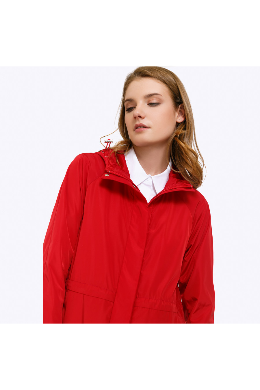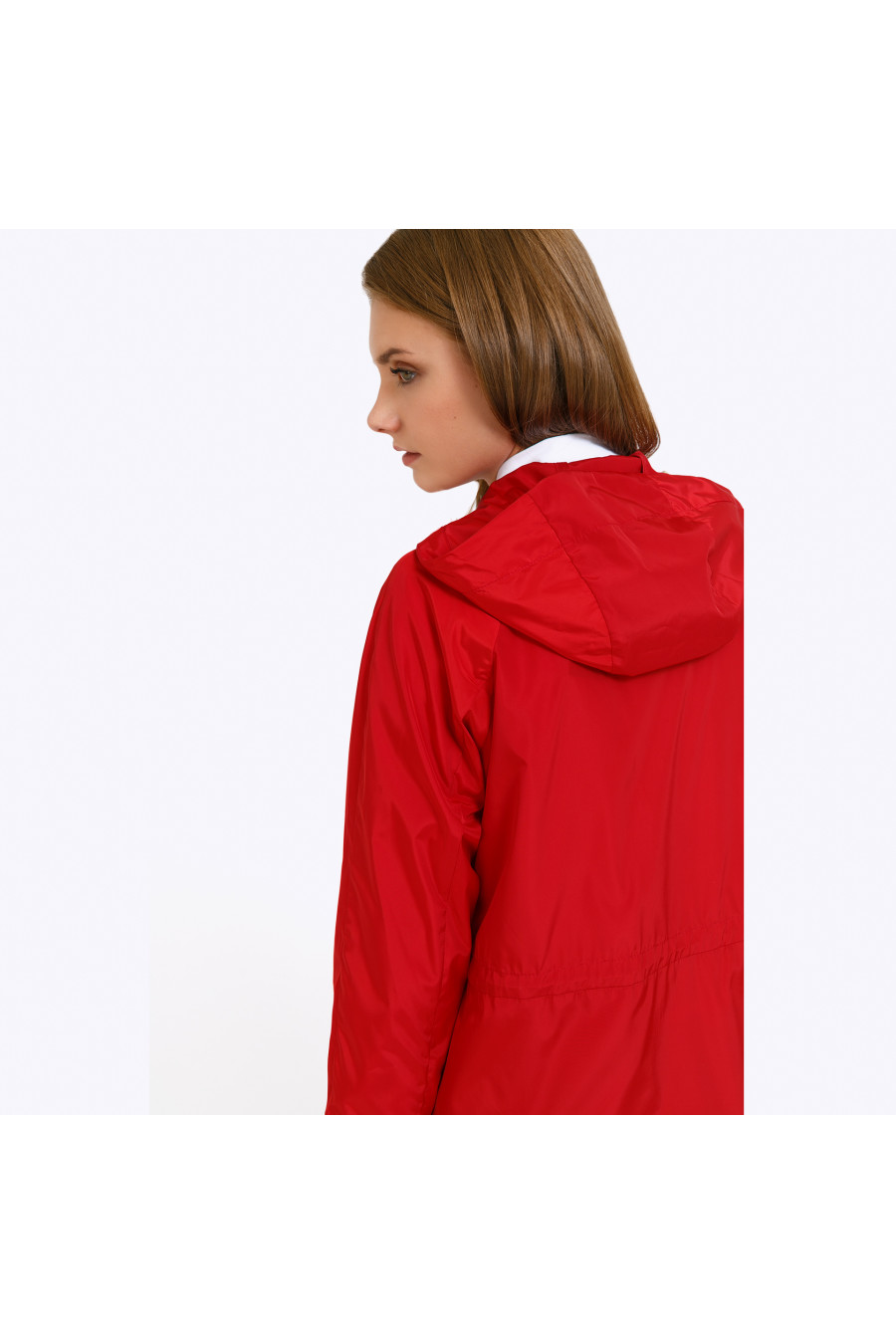 Плащ-дождевик красно-малинового цвета с капюшоном. Модель прямого
