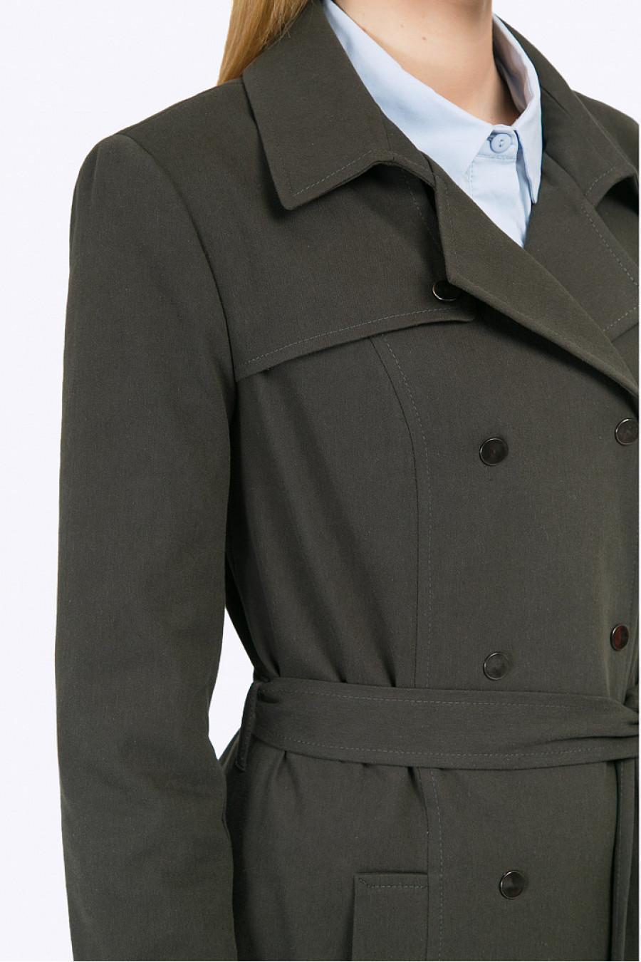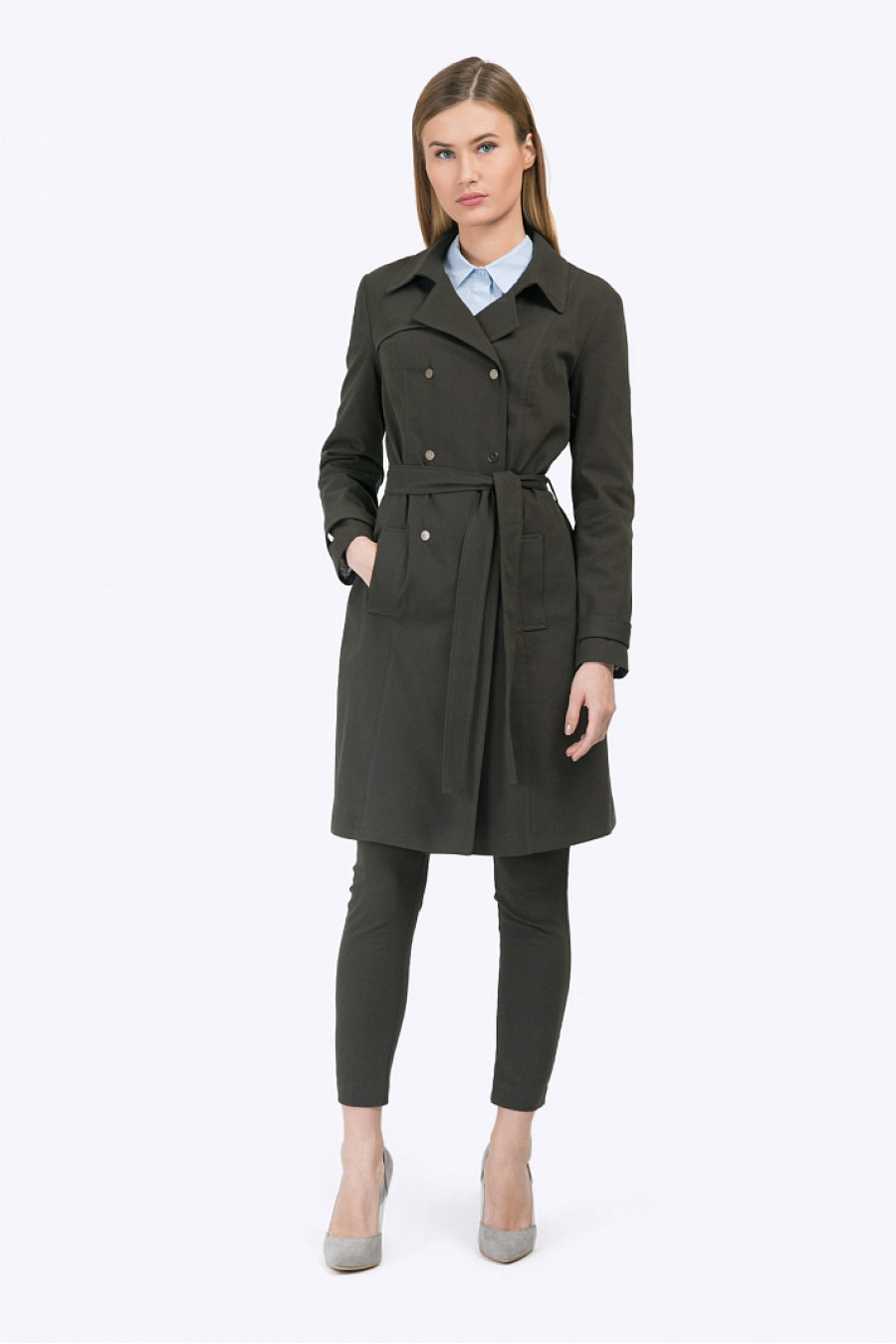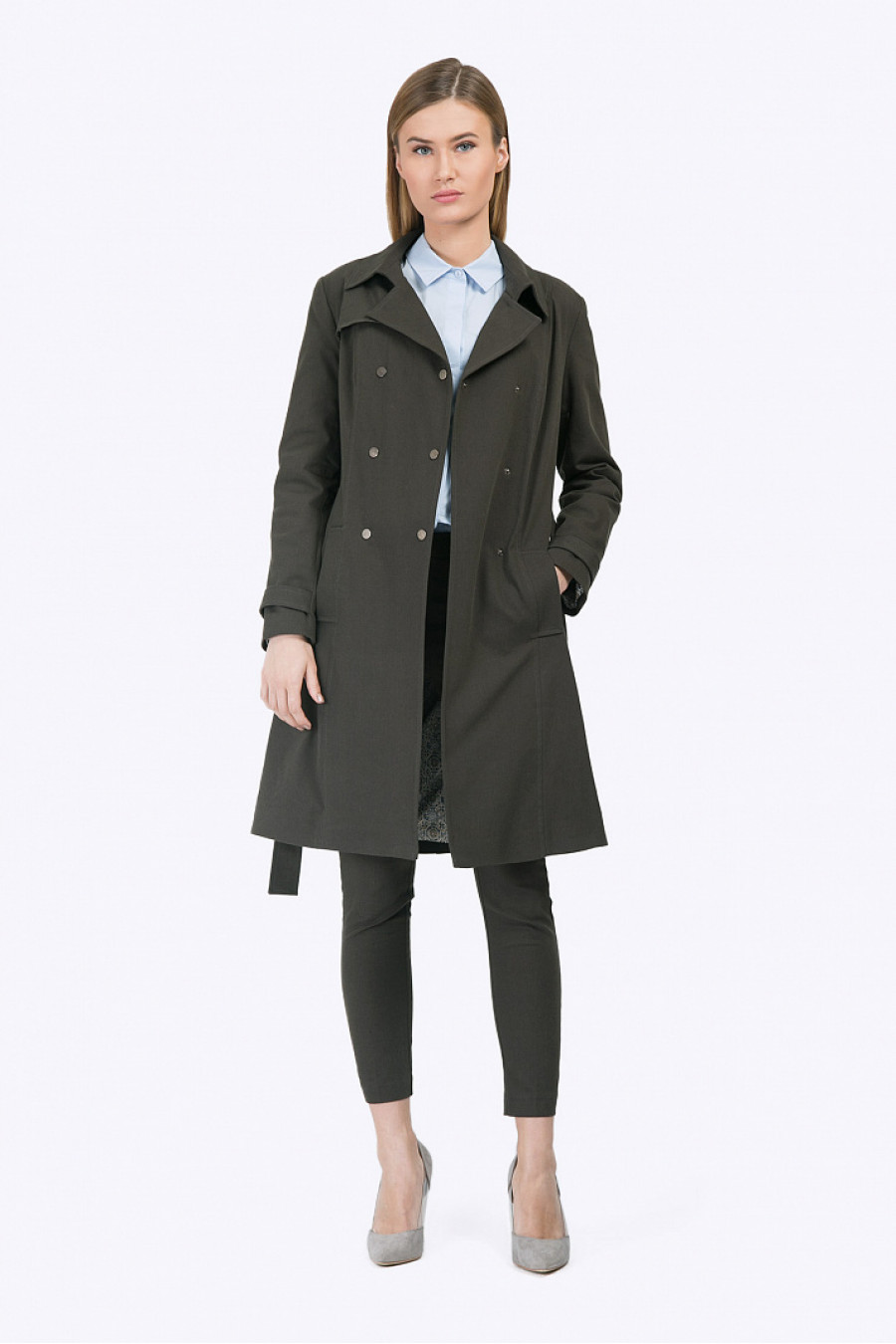Двубортный плащ цвета хаки в стиле милитари. Модель включает характерные для trench coat элементы: отлётную кокетку спереди для защиты от протирания во время ношения сумки на плече, отлётную деталь на спине для защиты от дождя (чтобы капли стекали), хлястики на рукавах, карманы с листочками, шлицу и пояс с отстрочкой, завершающий образ.