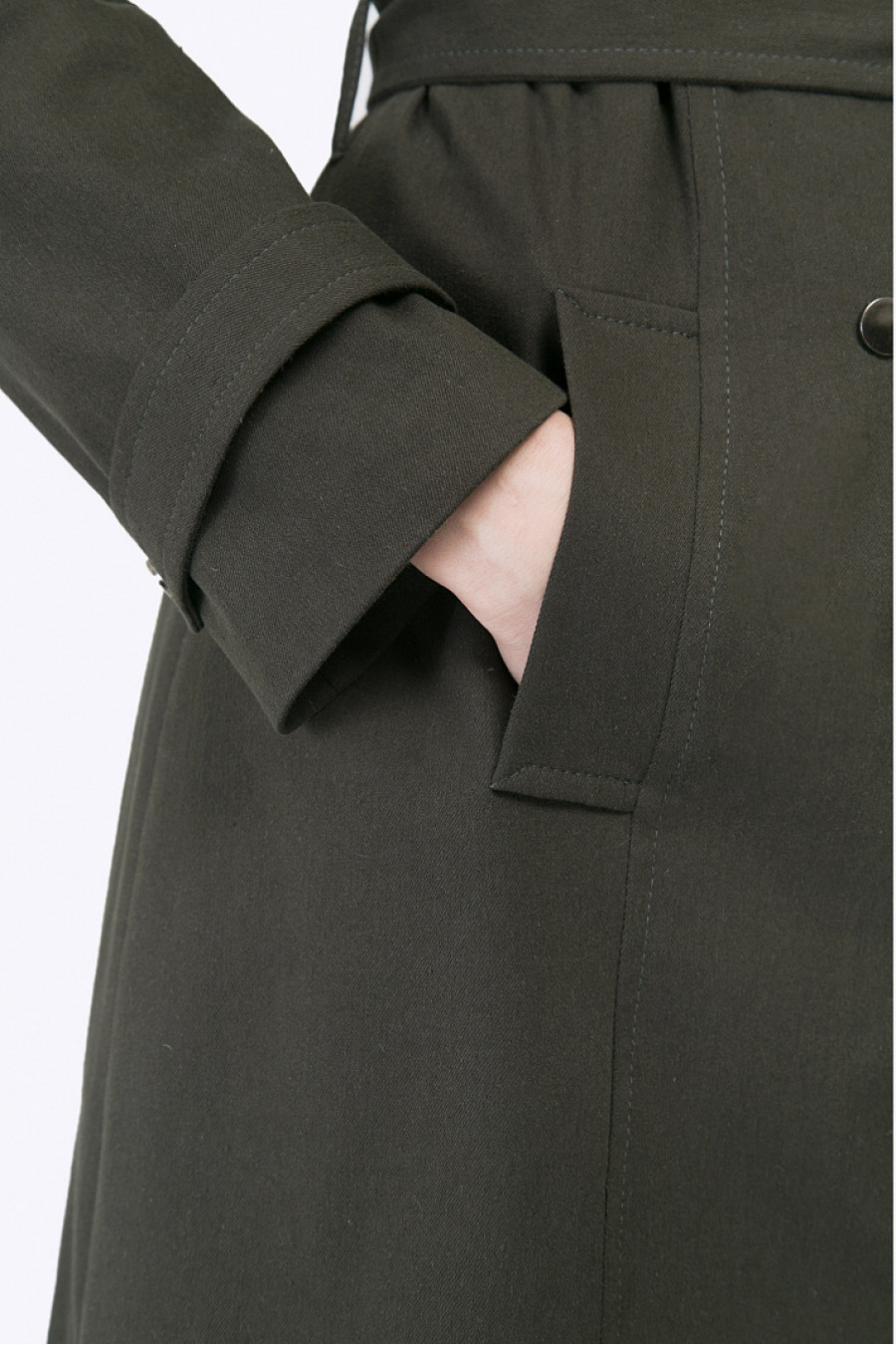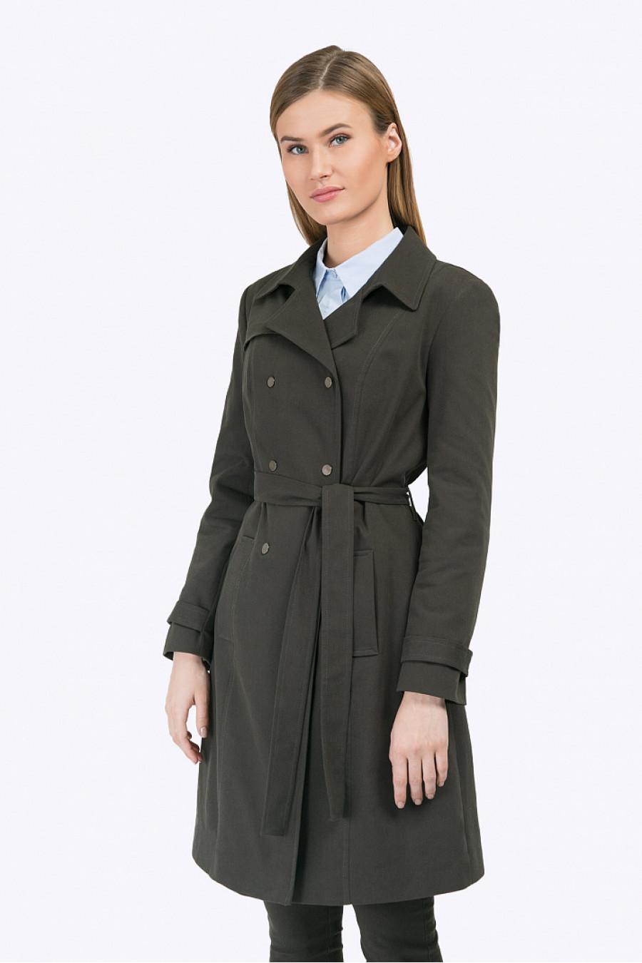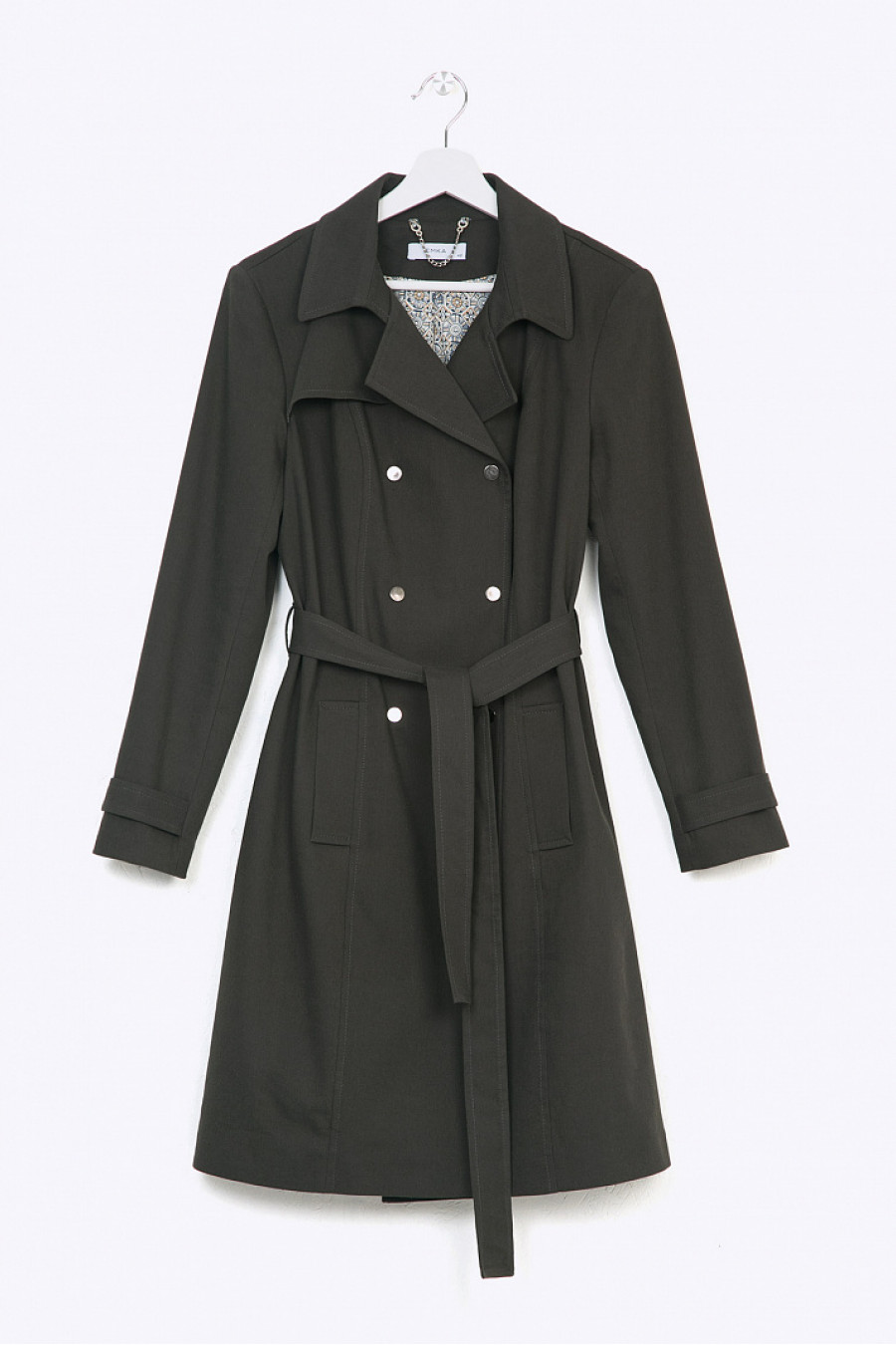 Двубортный плащ цвета хаки в стиле милитари. Модель включает характерные для trench coat элементы: отлётную кокетку спереди для защиты от протирания во время ношения сумки на плече, отлётную деталь на спине для защиты от дождя (чтобы капли стекали), хлястики на рукавах, карманы с листочками, шлицу и пояс с отстрочкой, завершающий образ.
