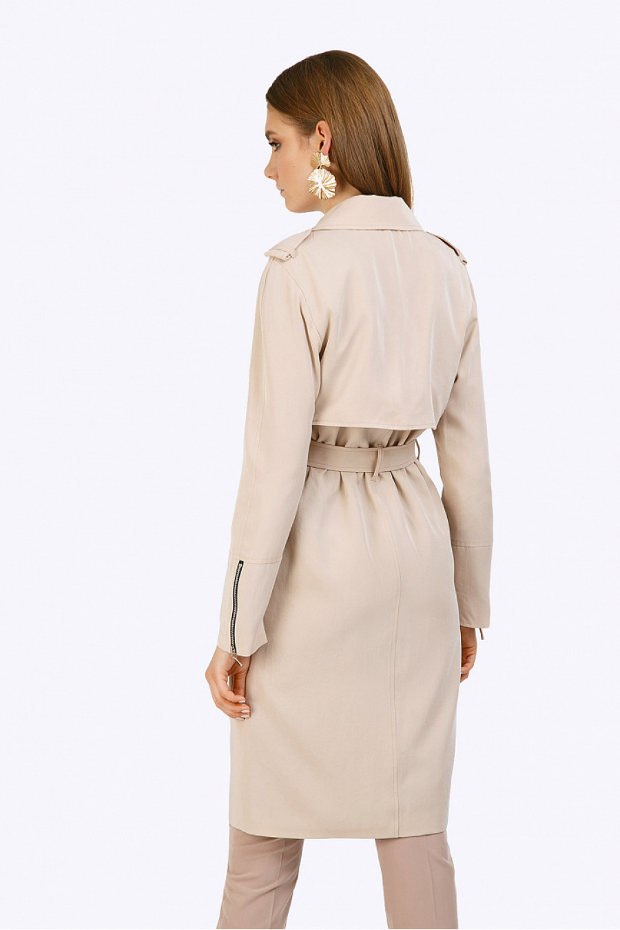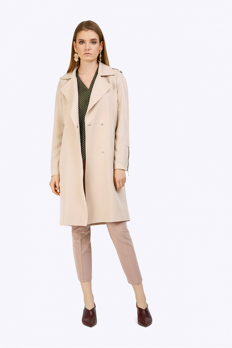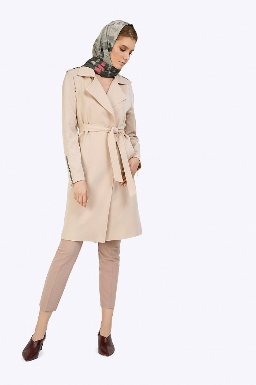 Тренч бежевого цвета на подкладке. Приталенная модель, имеет отложной воротник, длинные рукава, дополненные широкими манжетами с молнией, карманы с листочкой. Линия талии подчеркнута поясом. Образ на фото дополнен блузой B2402-saratoga, брюками D021-marni. Рост фотомодели 177 см.