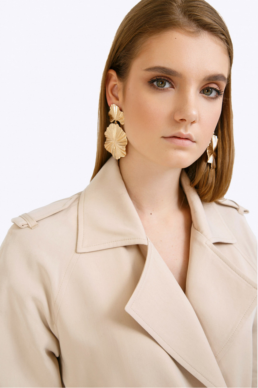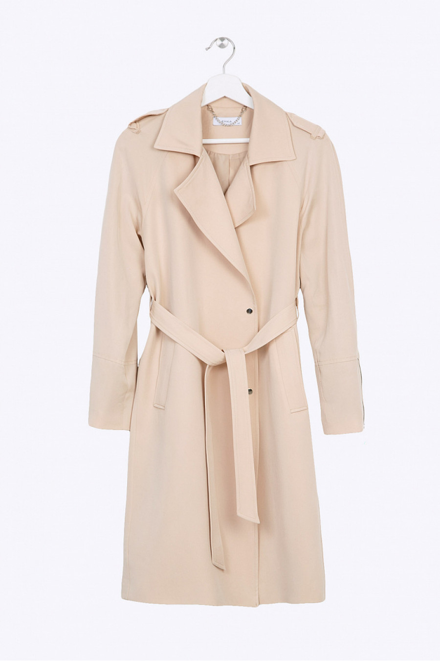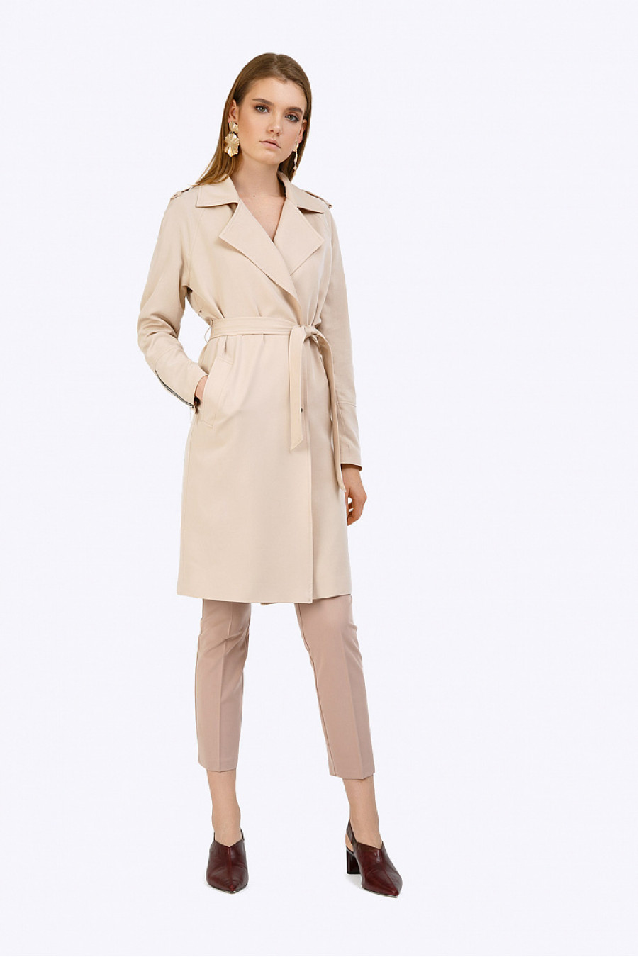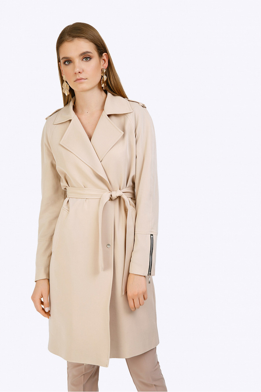 Тренч бежевого цвета на подкладке. Приталенная модель, имеет отложной воротник, длинные рукава, дополненные широкими манжетами с молнией, карманы с листочкой. Линия талии подчеркнута поясом. Образ на фото дополнен блузой B2402-saratoga, брюками D021-marni. Рост фотомодели 177 см.