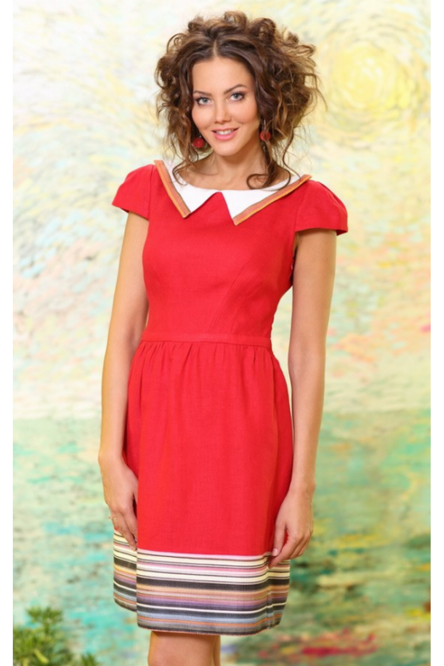 Романтичное платье выполнено из натурального льна, отрезное по линии талии. Низ платья гармонично дополняет эксклюзивная итальянская ткань «в полоску». Изделие украшено съёмным воротником белого цвета, который пристёгивается к платью. Сзади модель регулируется шнуровкой, такая спинка придаёт еще больше кокетства этому платью.