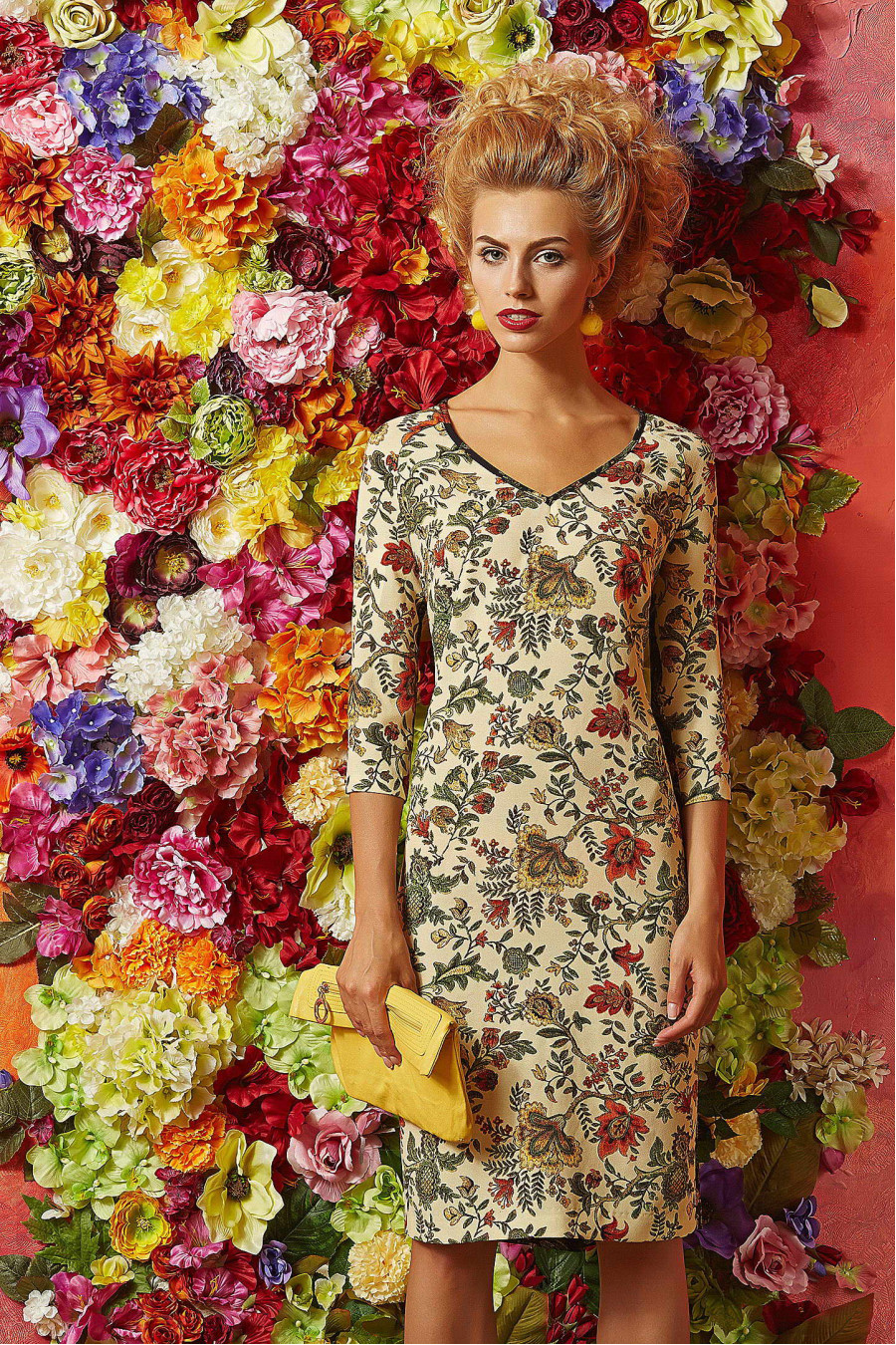 Элегантное платье выполнено из итальянской креповой ткани приталенного силуэта. Платье с чёткой формой и длиной чуть ниже колена. Оригинальность этой модели заключается в живописном рисунке, из дизайнерской коллекции, который преобладает на ткани. Платье без подкладки. Горловина с фигурным вырезом декорирована и переходит в глубокий V-образный вырез на спине.