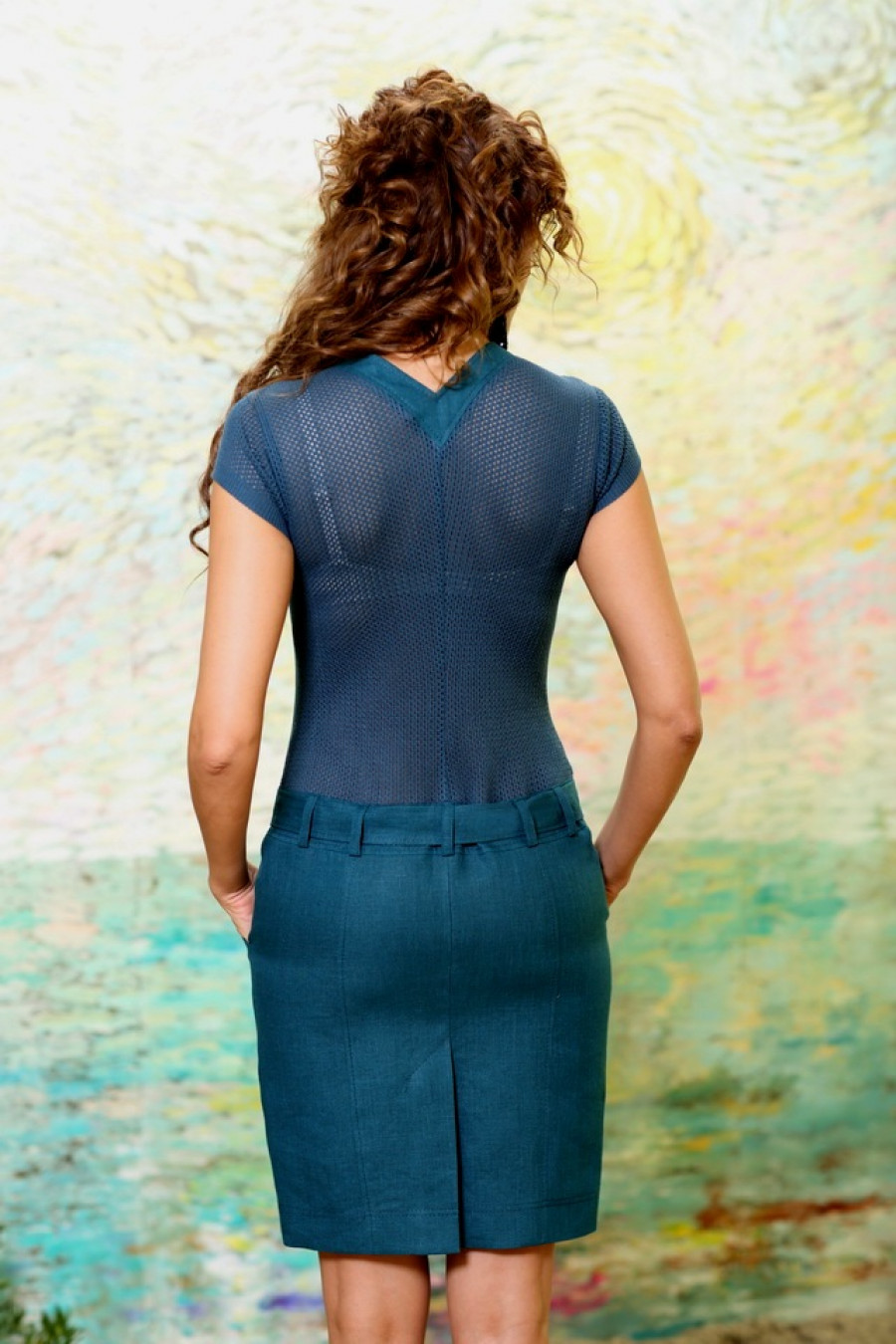 Льняное, летнее платье прилегающего силуэта. По центру полочки застежка на пуговицы. Платье с заниженной линией талии. Спинка и рукава изделия выполнены из лёгкой трикотажной ткани. Четыре накладных кармана: два в боковом шве и два накладных из трикотажа на груди. Яркая деталь модели, подчеркивающая индивидуальность - льняной пояс.