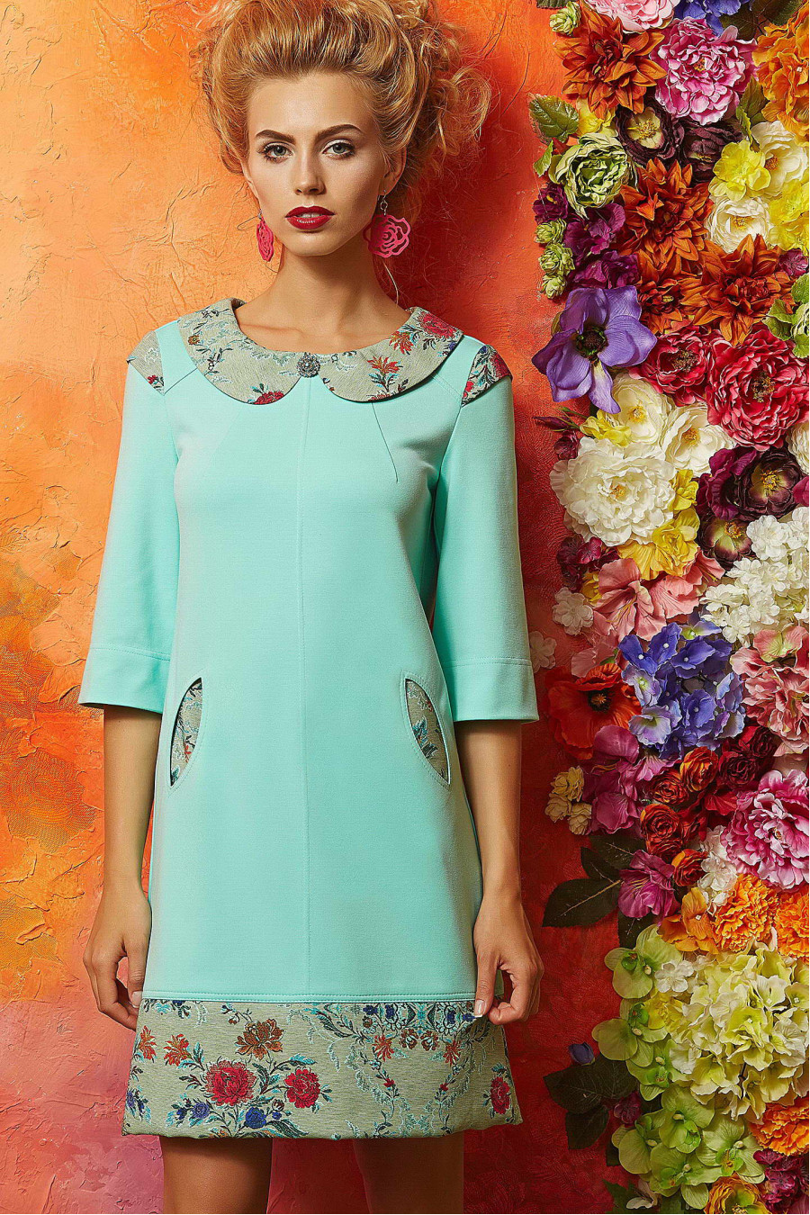 Эксклюзивное трикотажное платье прямого силуэта, построено на двух тканях-компаньонах в живописном сочетании. Стиль изделия подчёркнут цветовым решением нежного мятного оттенка. Круглый вырез горловины с отложным воротником, украшен эксклюзивной французской брошью. Модель с функциональными, внутренними карманами. Линия плеча плавная, рукав 3/4. Использована сложная и безупречная обработка. На спинке изделие располагаются пуговицы.