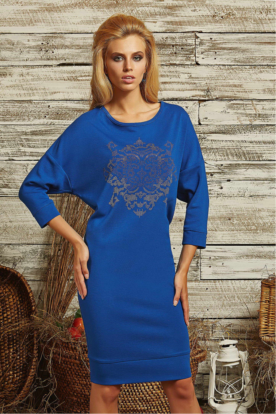 Стильное платье, прилегающего силуэта, выполнено из трикотажного полотна. Рукав длинный, вырез-лодочка, длина до середины колена. Крой рукава ""летучая мышь"" на манжете. По переду располагается аппликация из страз. Элегантный лаконичный дизайн этой модели, а также приталенный силуэт выгодно подчеркнёт все достоинства фигуры.