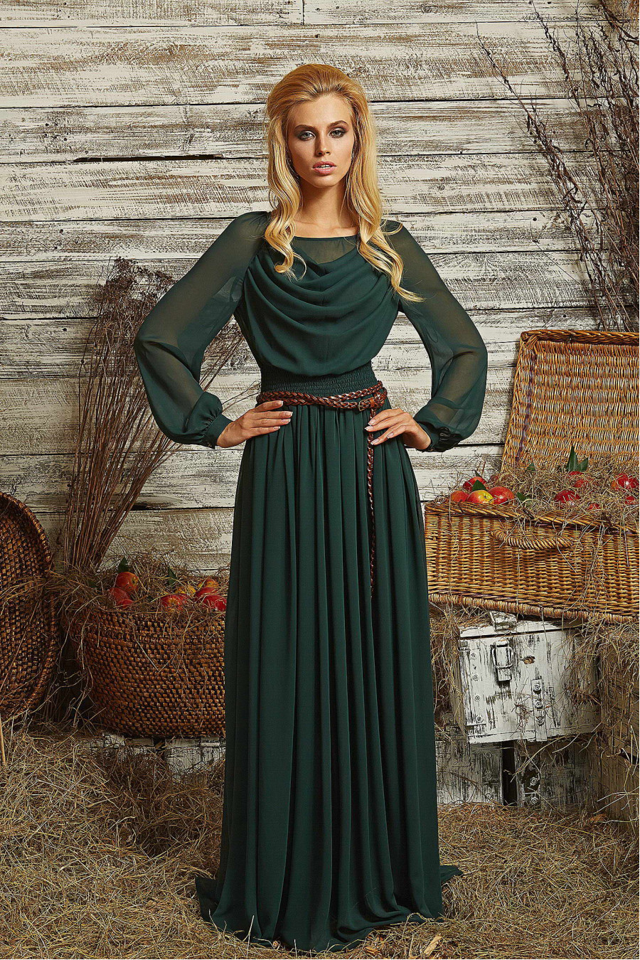 Тренд этого сезона – платья из шифона. Дизайнеры всего мира с удовольствие выбирают эту ткань для своих коллекций. Изящное, благородное и утончённое платье в пол, выполнено из изумрудного шифона. Модель с длинным, втачным рукавом. По переду располагается оригинальна драпировка в виде «качели». Сзади на спинке располагается изящный вырез, который может быть оформлен небольшим бантом. Изысканным дополнением служит съёмный кожаный ремешок.