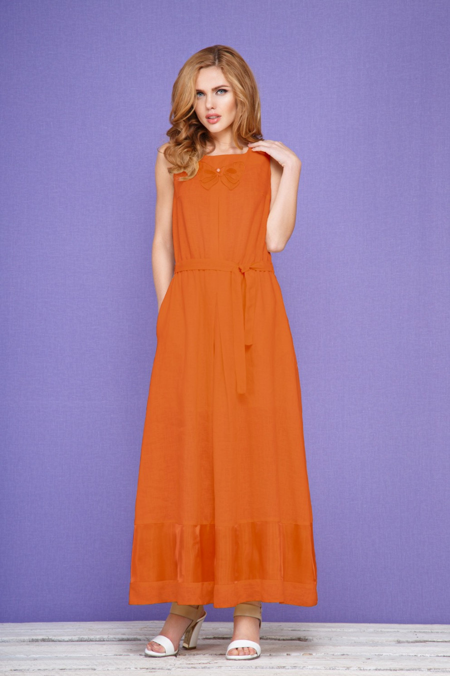 Платье женское, ArtRibbon, полуприлегающего силуэта, отрезное по линии талии из льняной ткали. Длина спинки 137 см. По переду лифа обработаны нагрудные выточки и встречная складка по центру. Спинка лифа со средним швом и разрезом, который застегивается на навесную петлю и пуговицу. Юбка длинная, расширенная к низу. По центру переда и спинки юбки обработаны по одной встречной складке. По низу юбки вставлена отделочная деталь с верхним слоем из органзы. По талии платье присборено на резинку и подвязывается поясом, который крепиться двумя шлевками. Горловина и проймы обработаны обтачкой. Перед лифа украшен аппликацией "бабочка" с органзой.