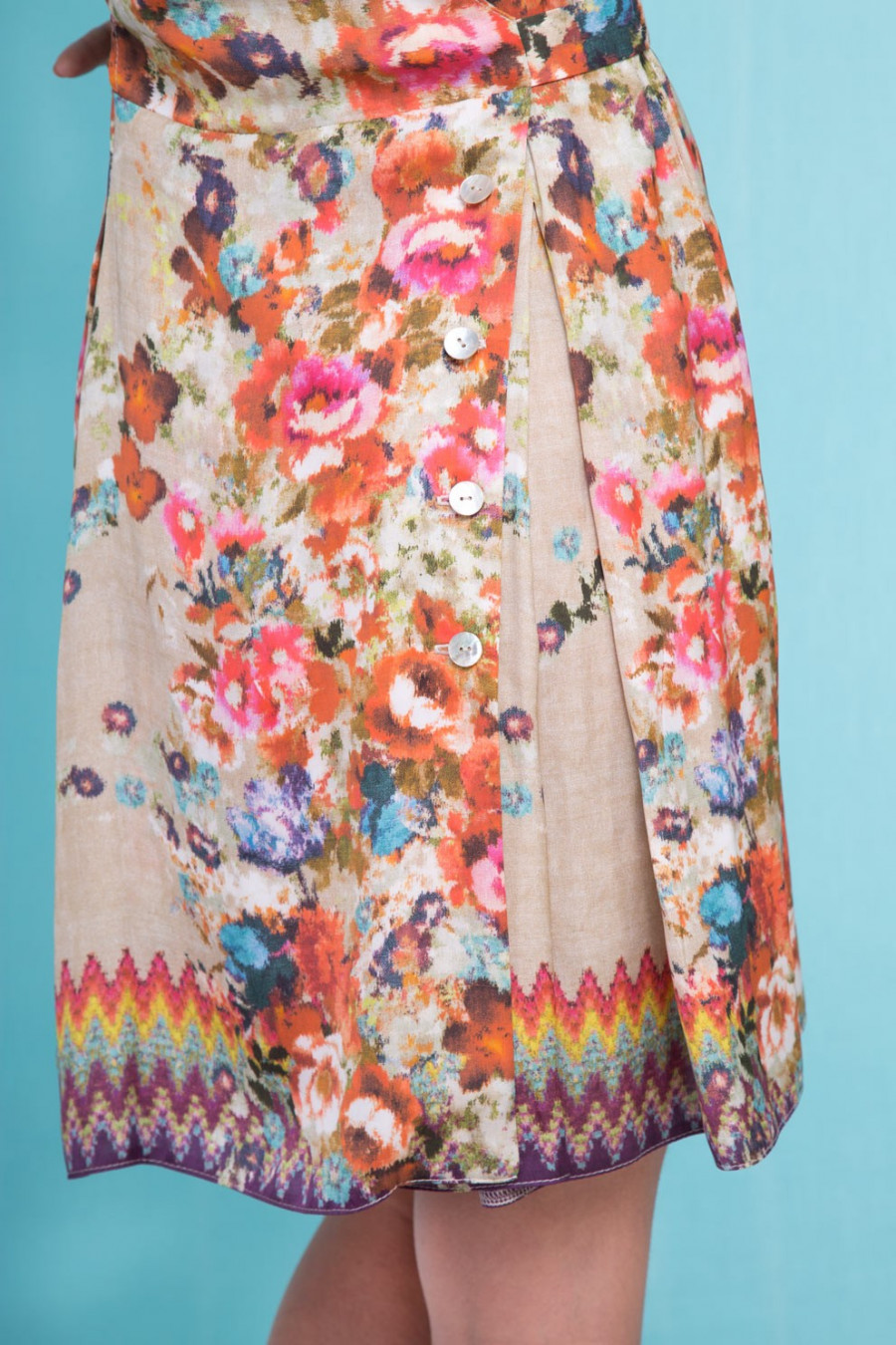 Платье женское, ArtRibbon, полуприлегающего силуэта. Платье разрезное по линии талии. Лиф переда с талевыми вытачками, спинка с запахом, по юбке застежка на петли и пуговицы. Юбка платья со встречными складками. По талии отлетной поясок. Горловина переда и спинки, проймы окантованы.